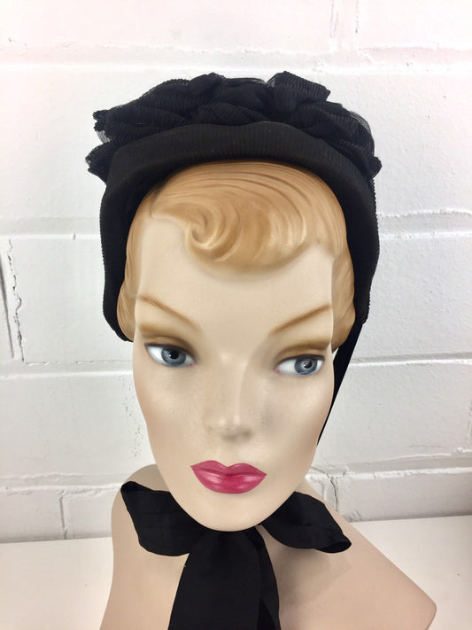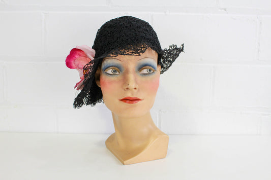 1920s Reproduction Black Horsehair Lace Hat with Pink Velvet Flowers
