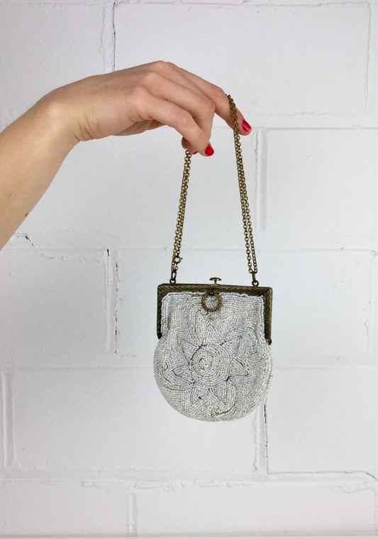 Vintage 1920s White Beaded Evening Purse With Sun Motif & Gold Metal Frame, Art Deco Handbag