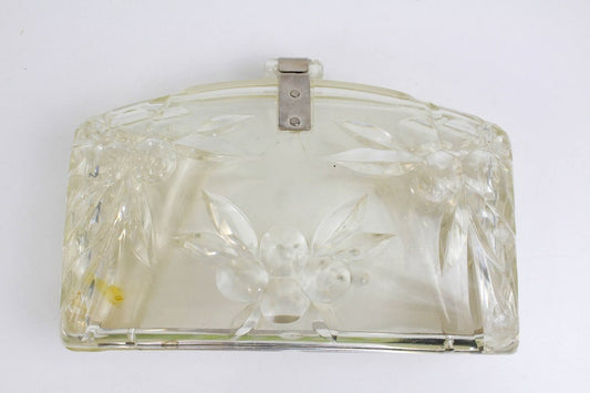 Vintage 1950s Clear Lucite Clutch Purse With Rhinestones & Etched Fruit, Mid-Century Bag