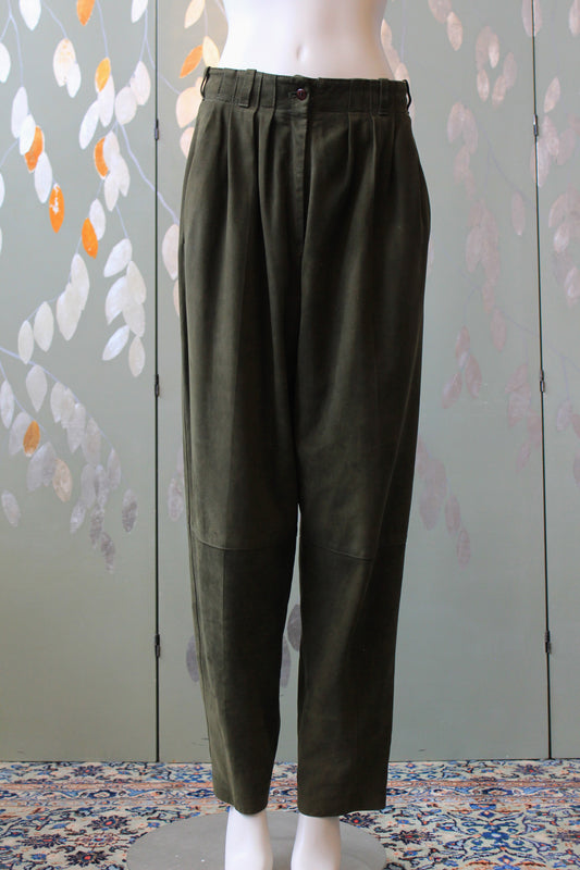 1980s Leather Paperbag Style Pants In Olive Green, Medium