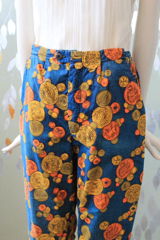 Vintage 1960s Blue and Gold Coin Novelty Print Ankle Trousers, Medium