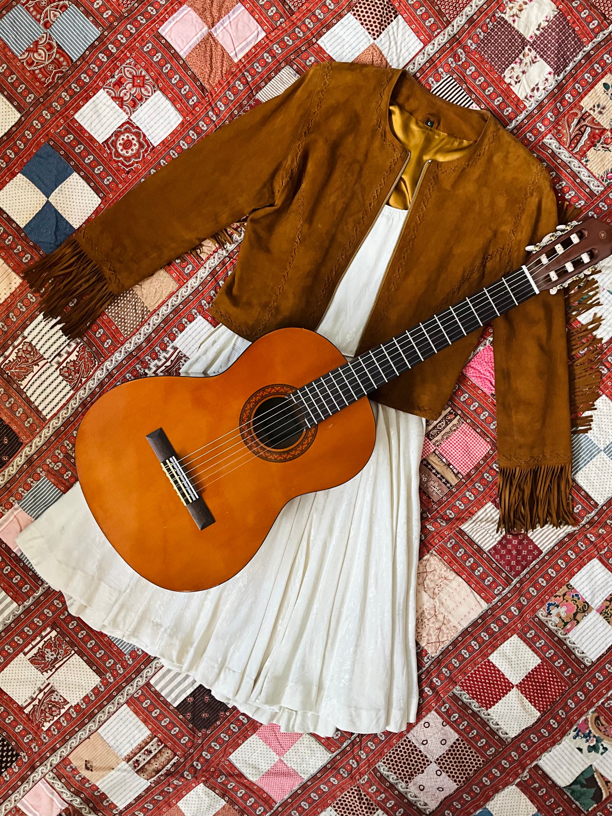This 2010s suede jacket screams Coachella ! The colour is stunning and will match practically everything, but what really makes this jacket special is the fringe! There is fringe all along the back of the arms, as well as the cuffs. It is fully lined and closes with a zipper. This jacket could work well with a dress, low rise jeans or skirt, or a tiered boho skirt. So many posibilites!