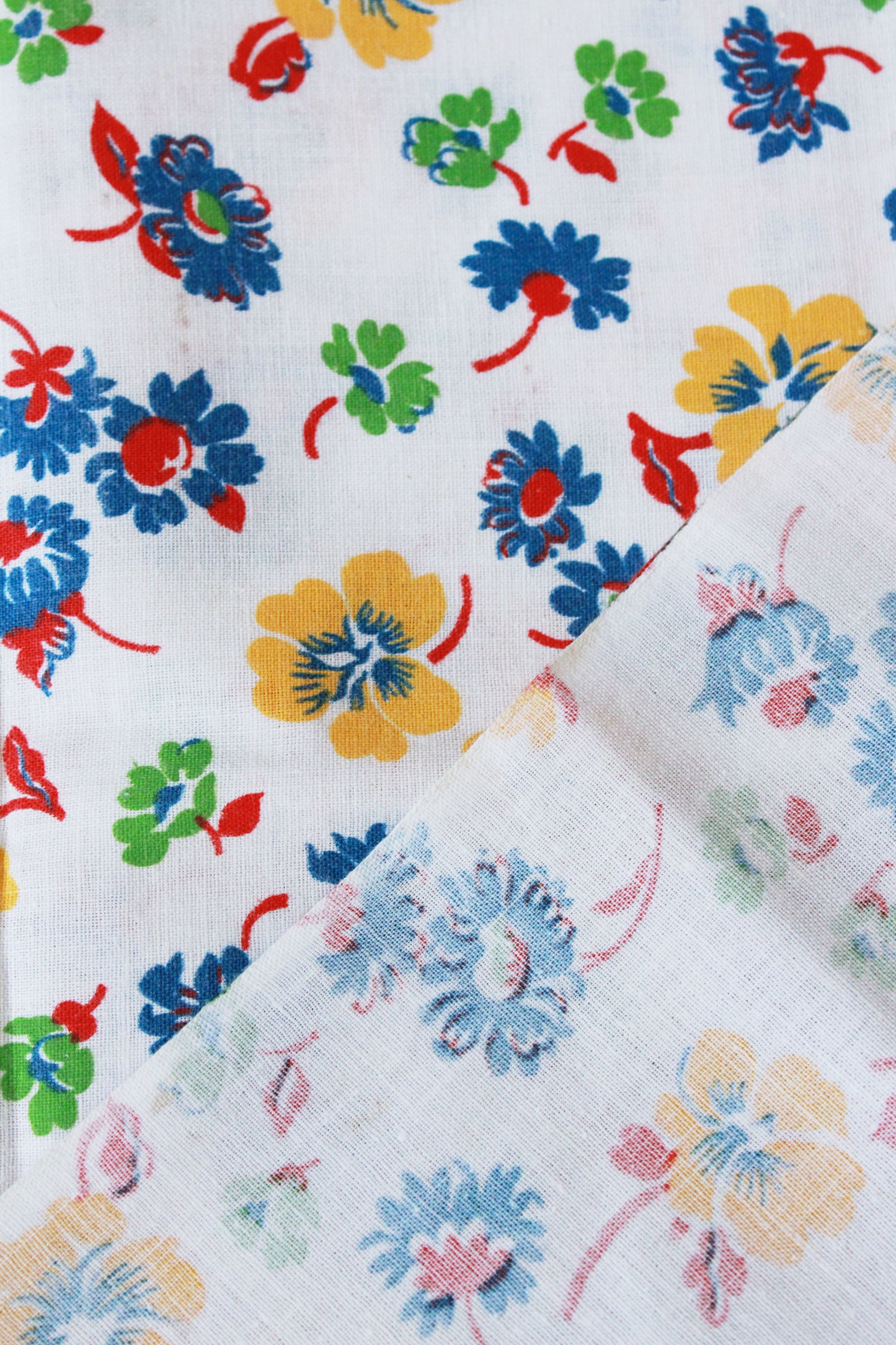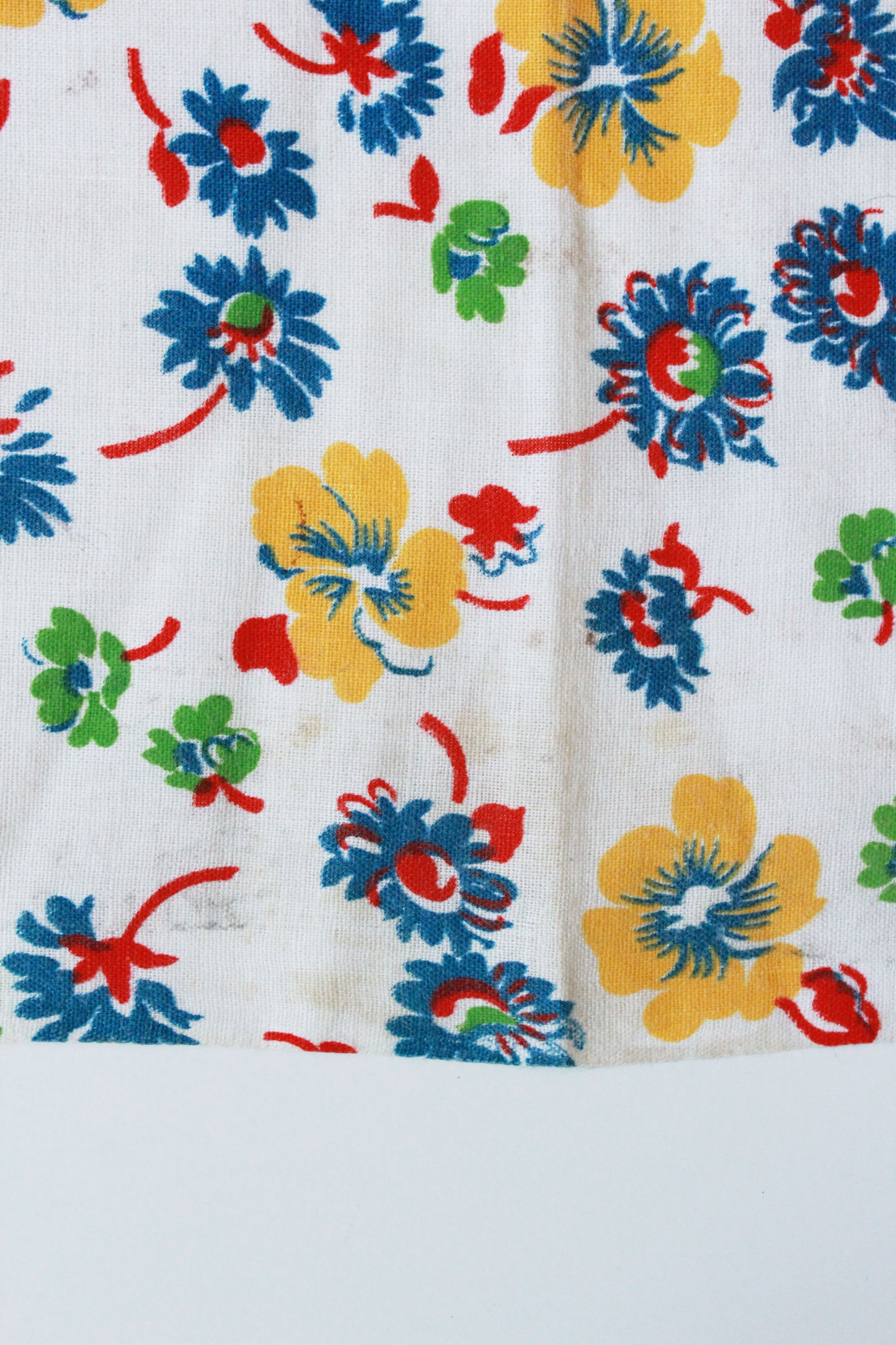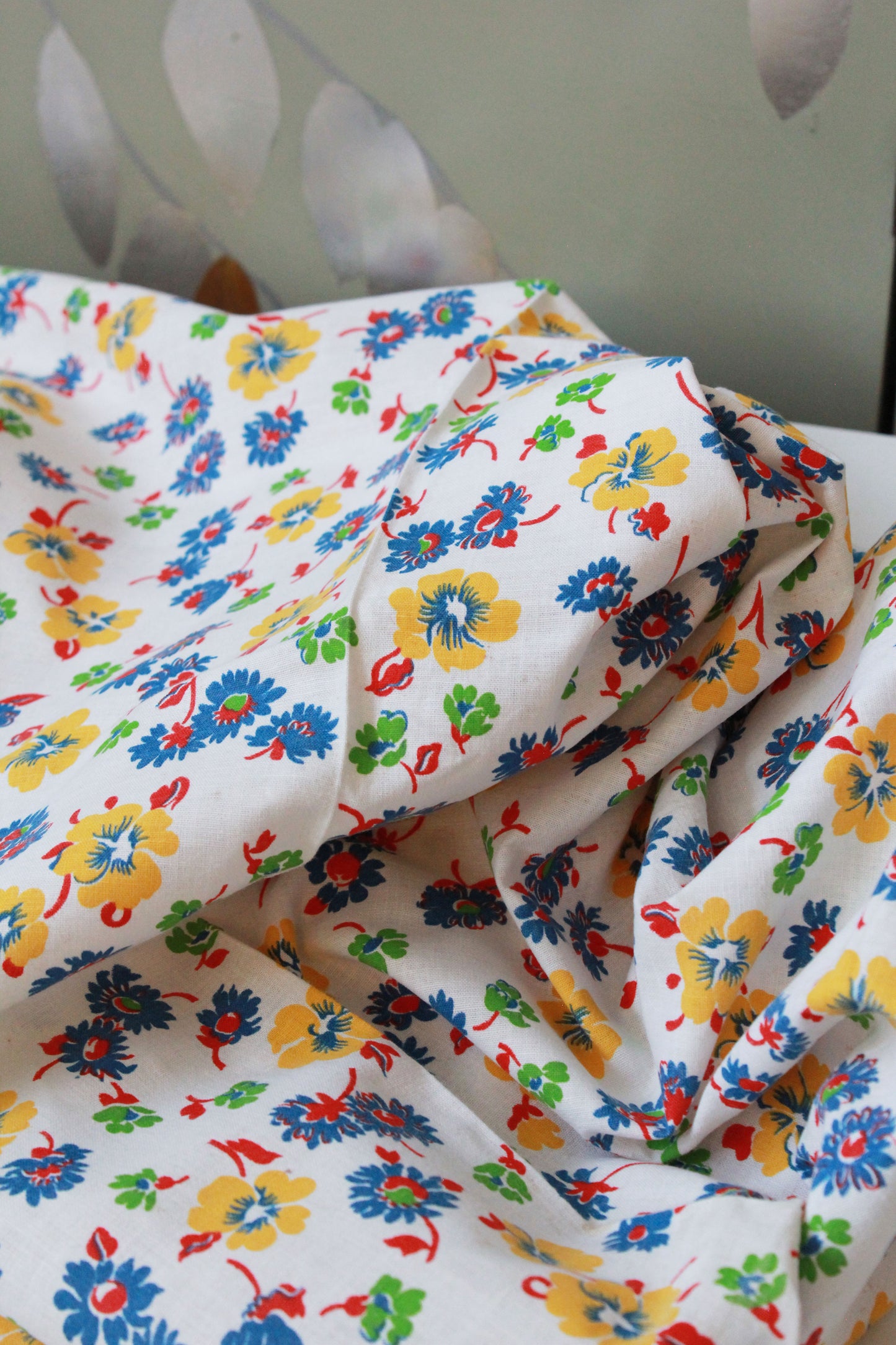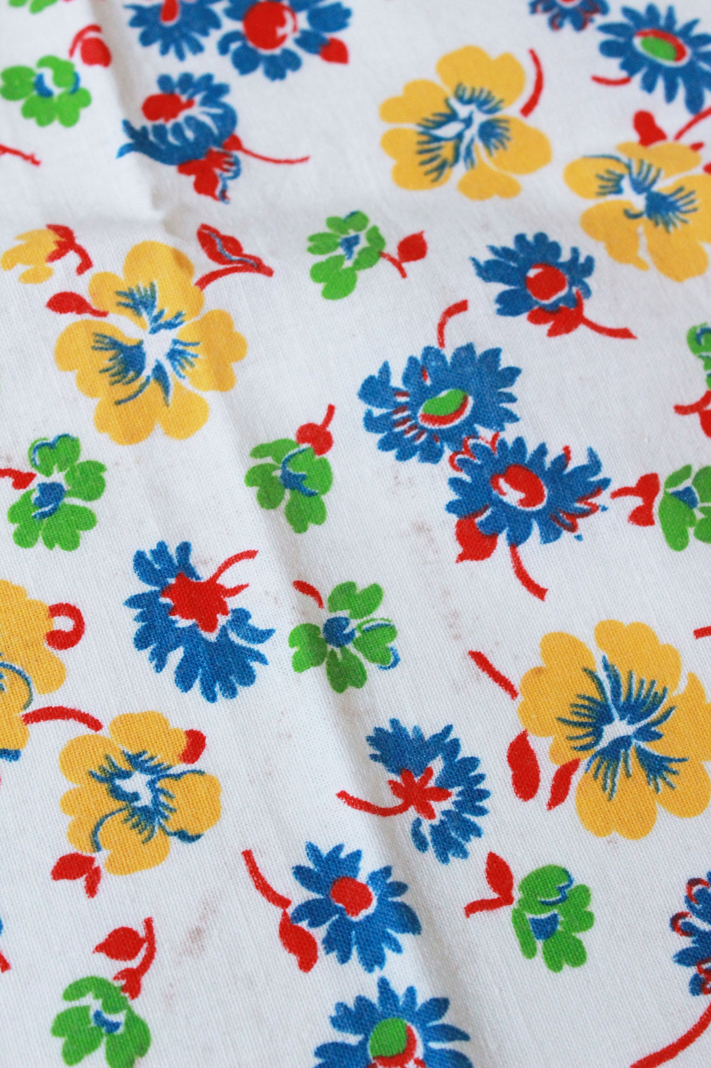 1940s Feedsack Fabric in Primary Colour Flowers, Red, Blue, Green, Yellow. Vintage Fabric, Mid Century