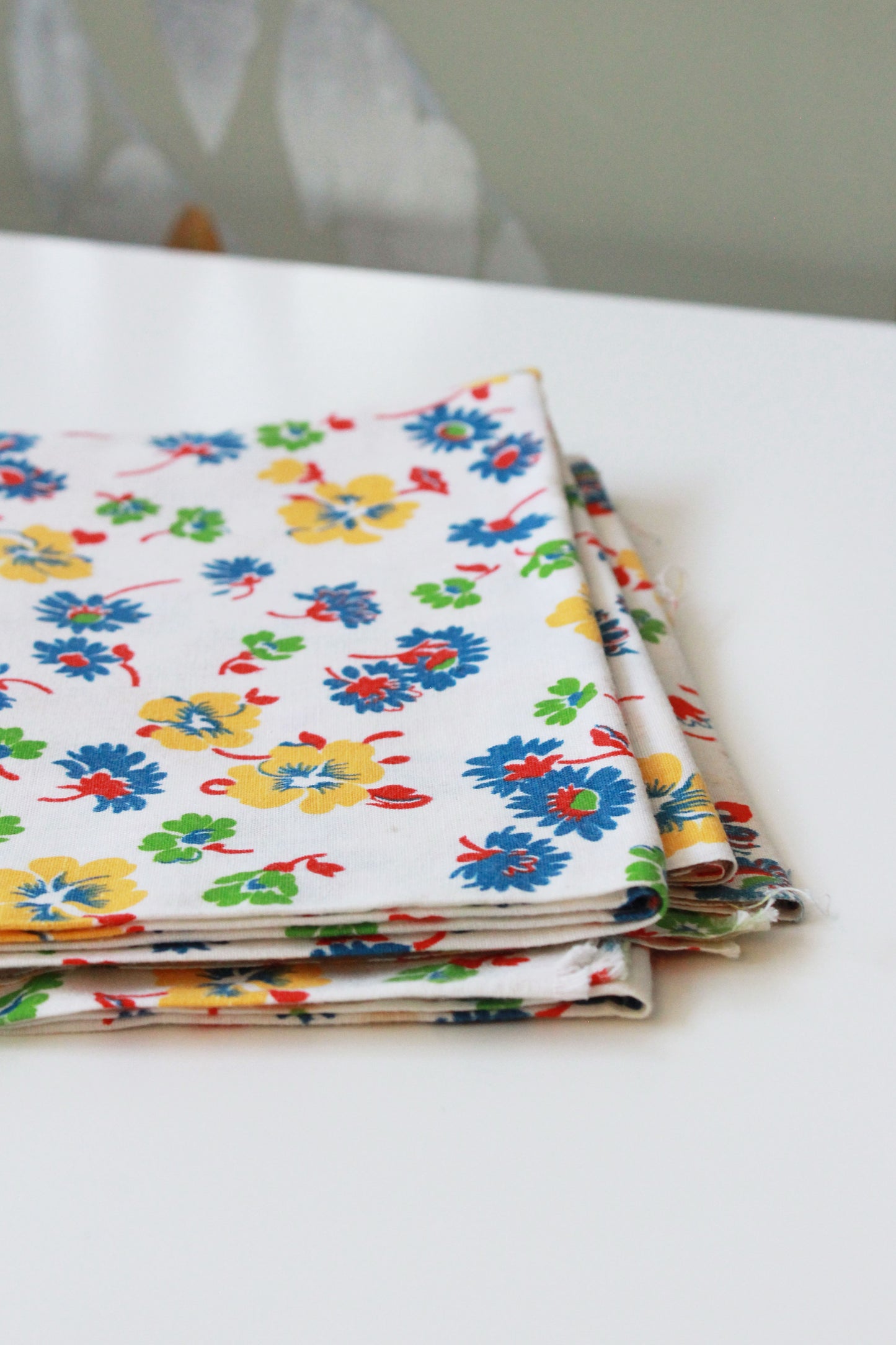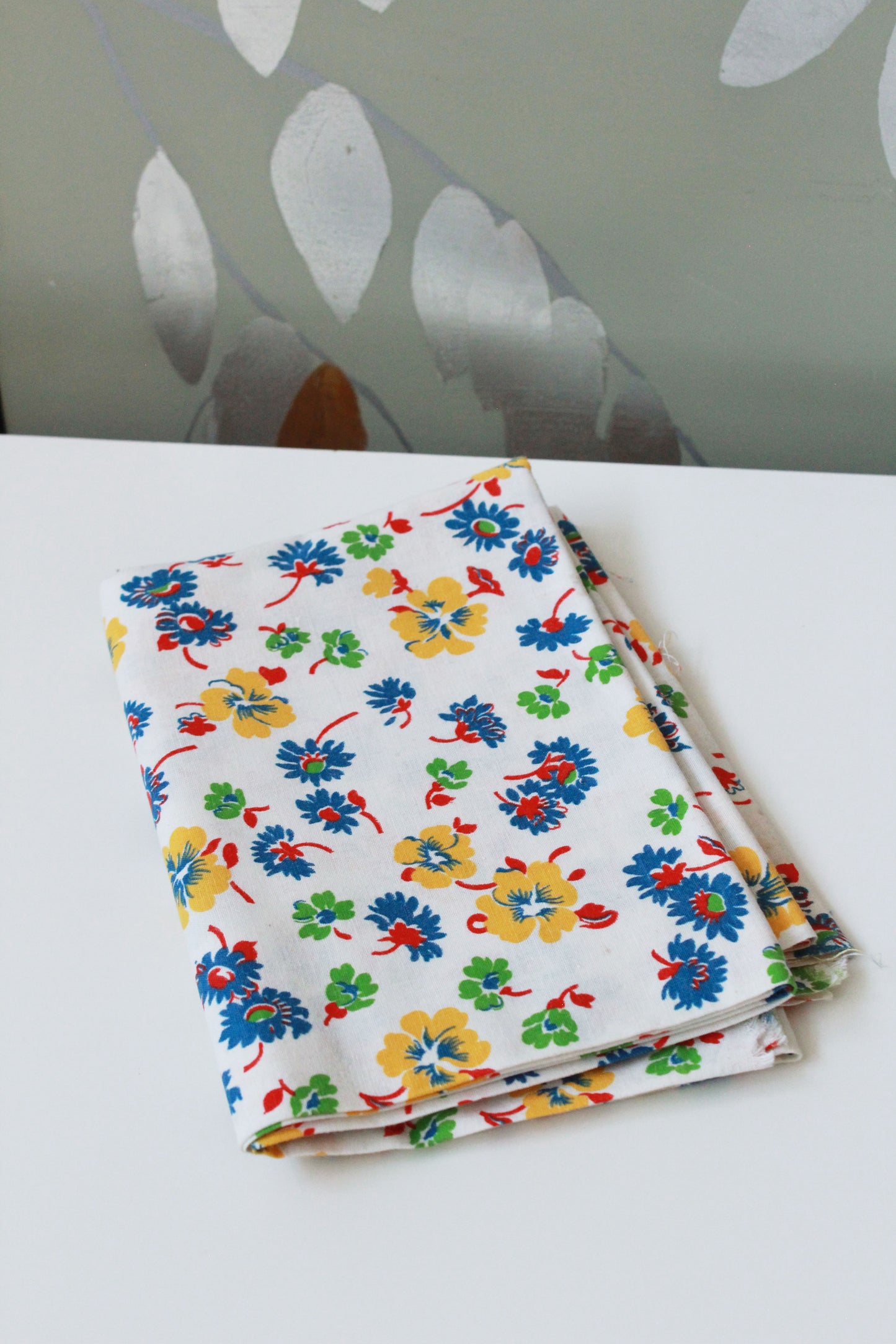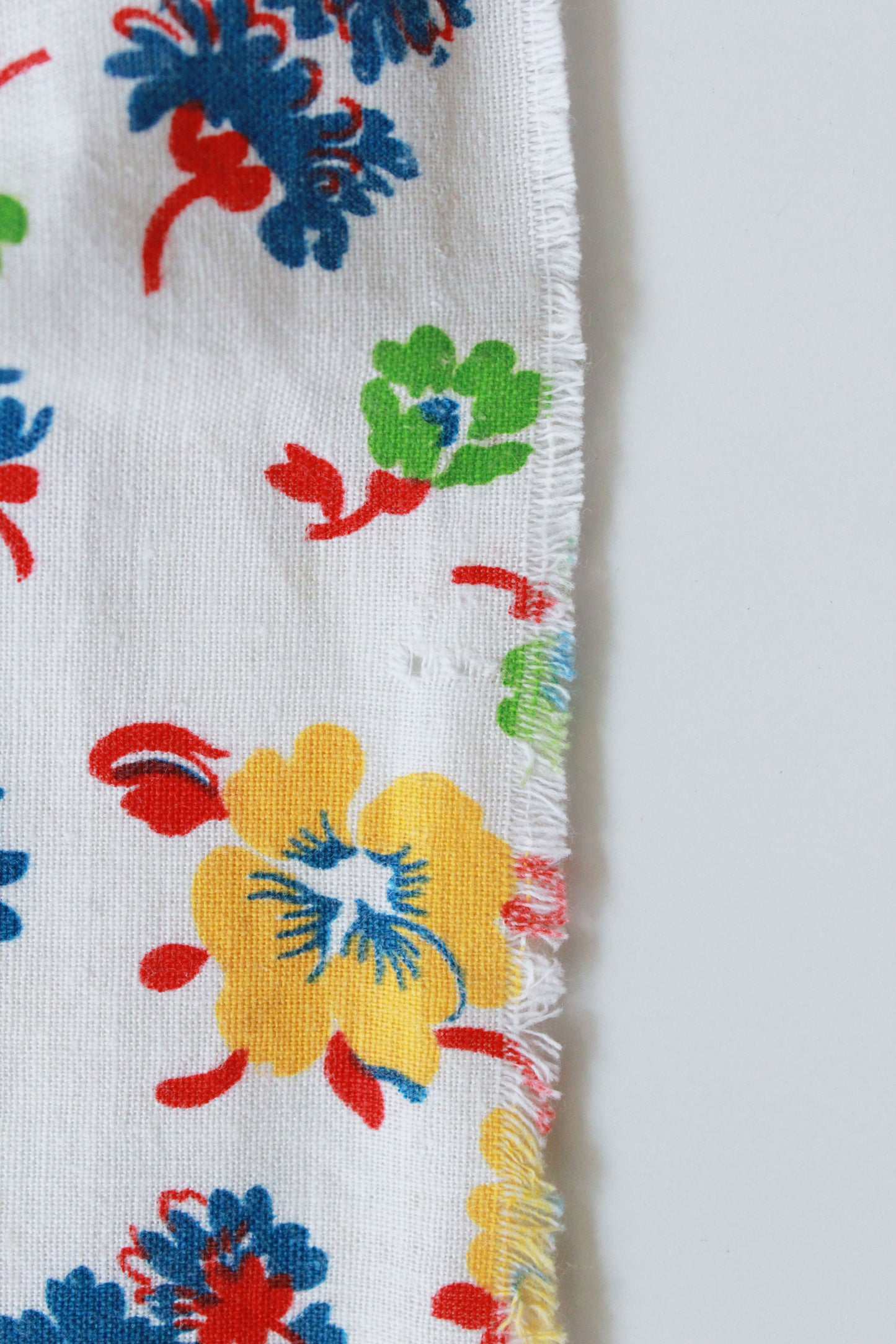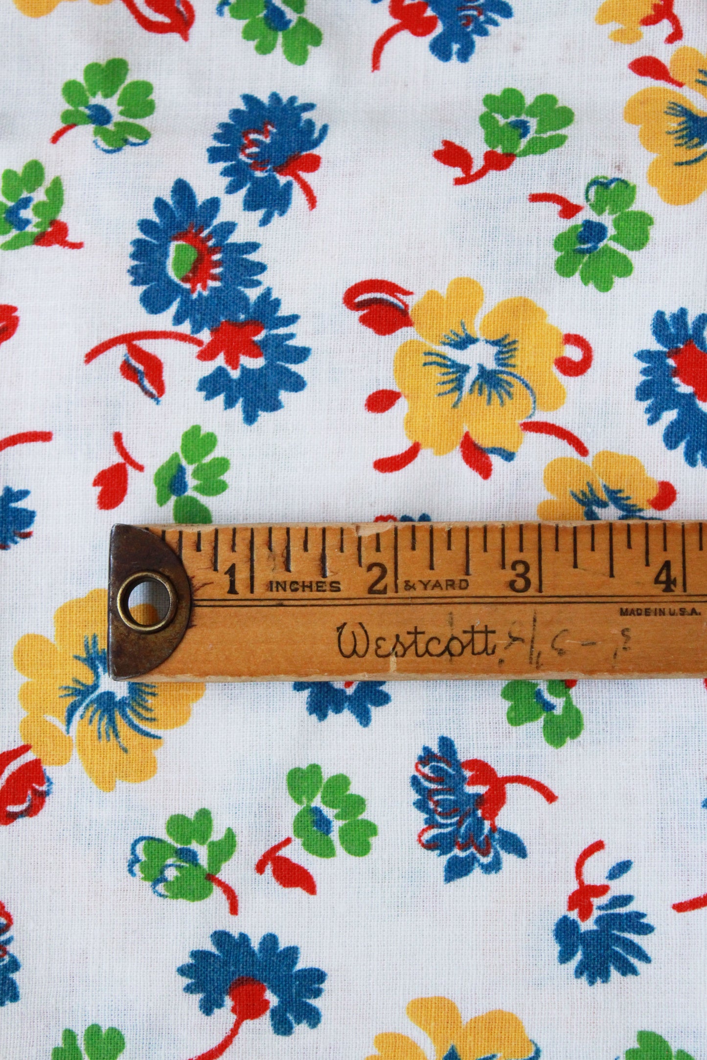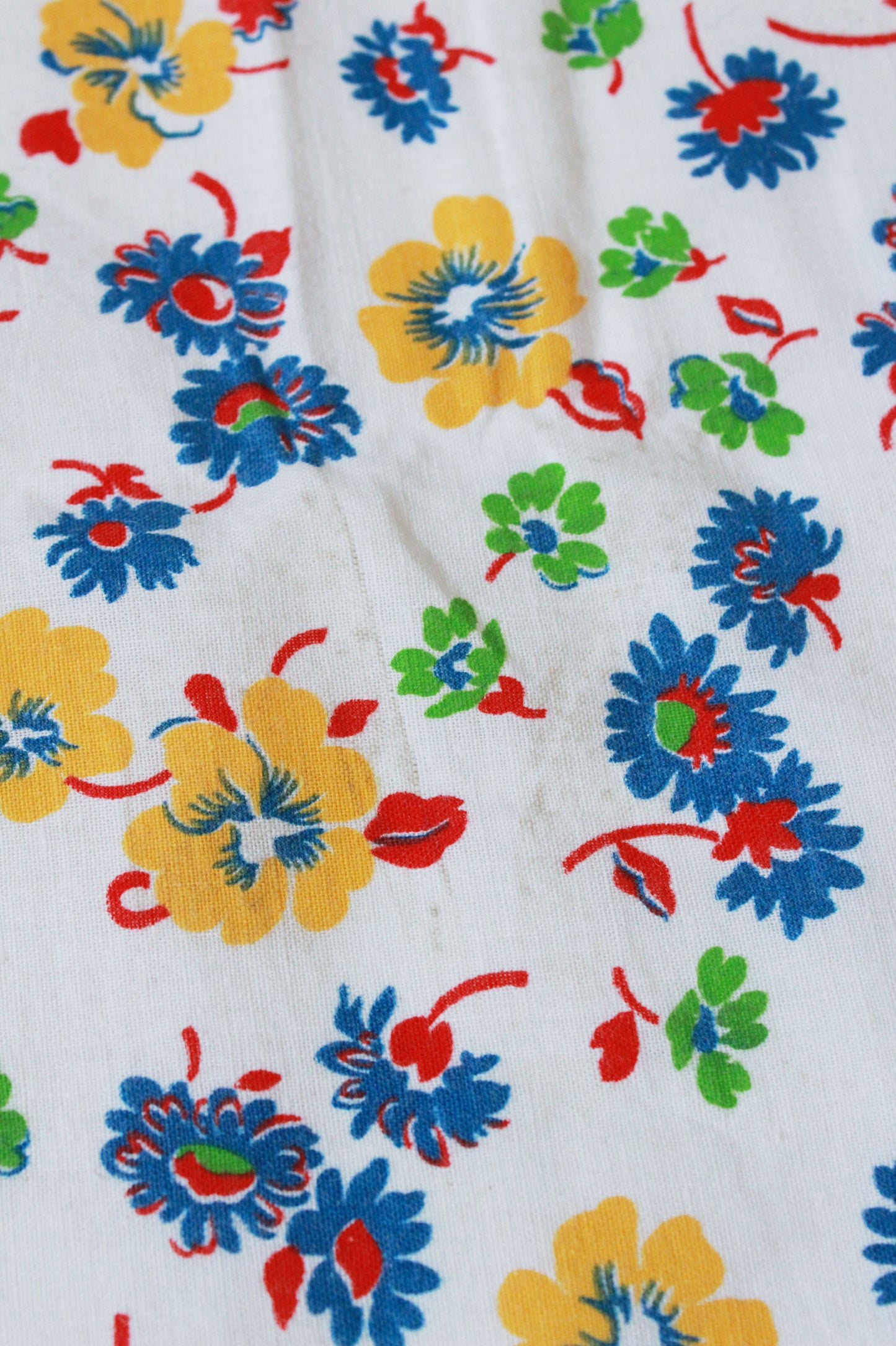 1940s Feedsack Fabric in Primary Colour Flowers, Red, Blue, Green, Yellow. Vintage Fabric, Mid Century