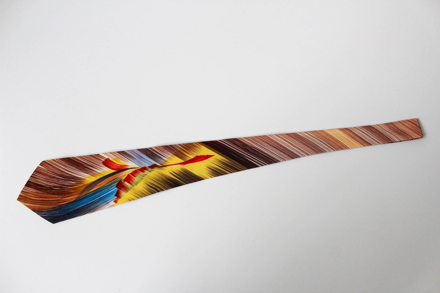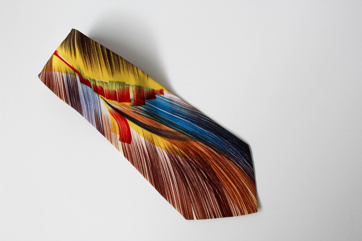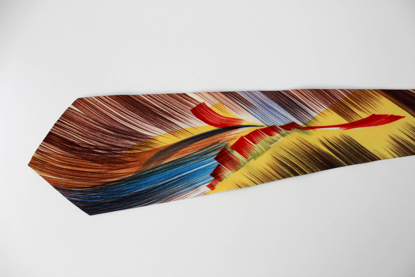 Colourful 1940s handpainted necktie, with an abstract brush stroke design on the front and a striated striping in brown, yellow and blue.
