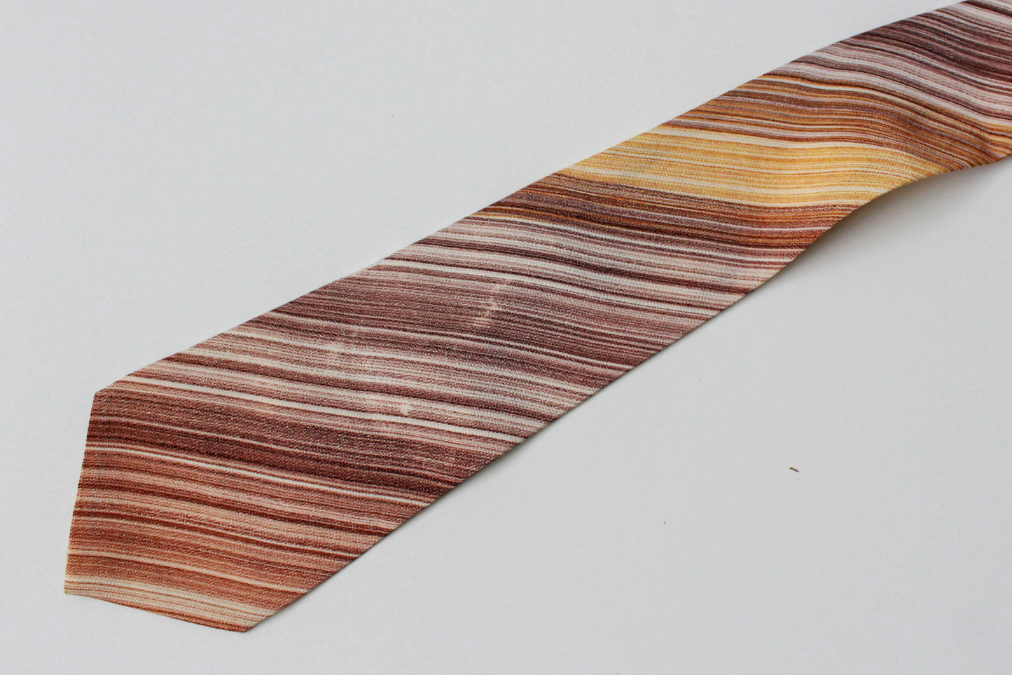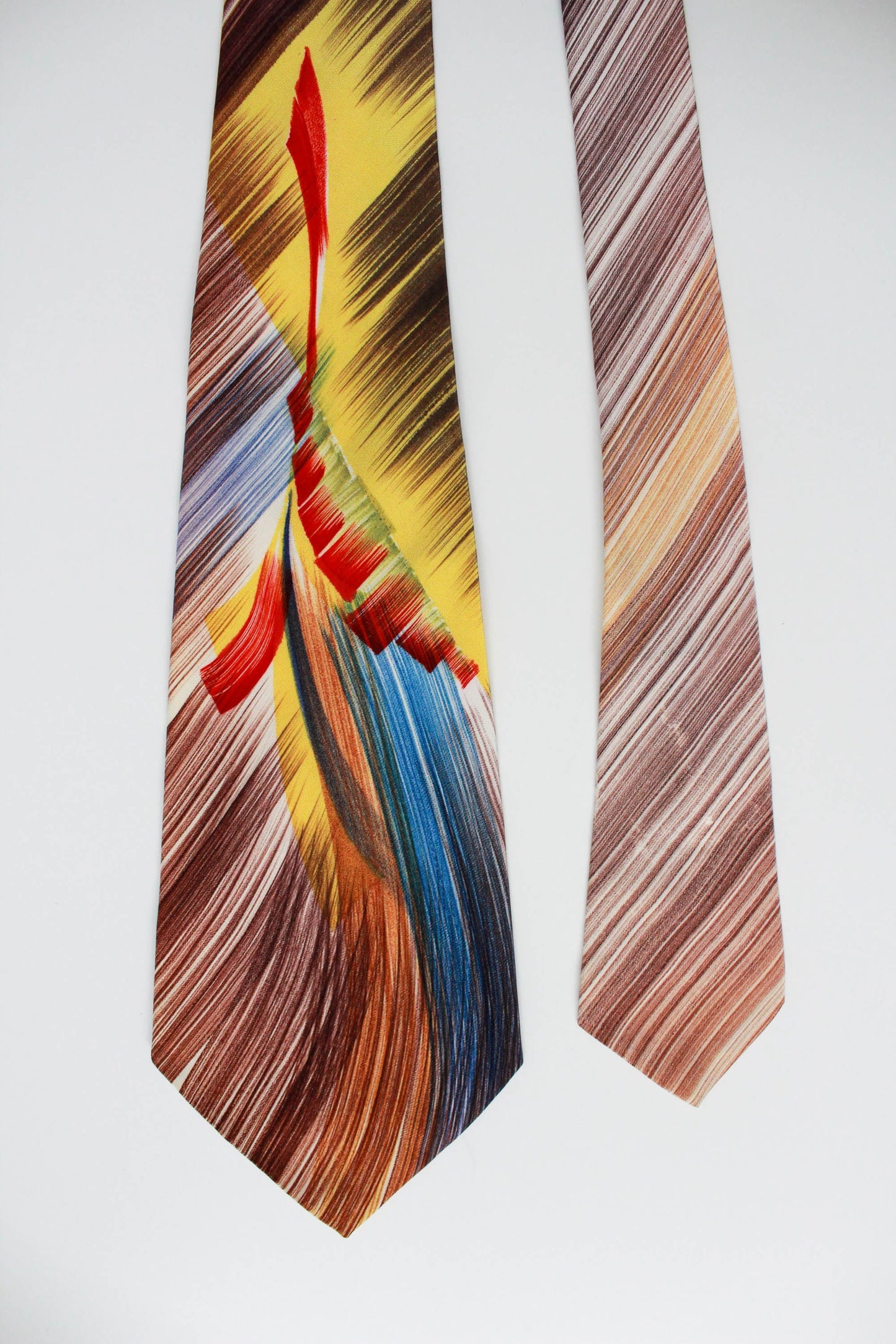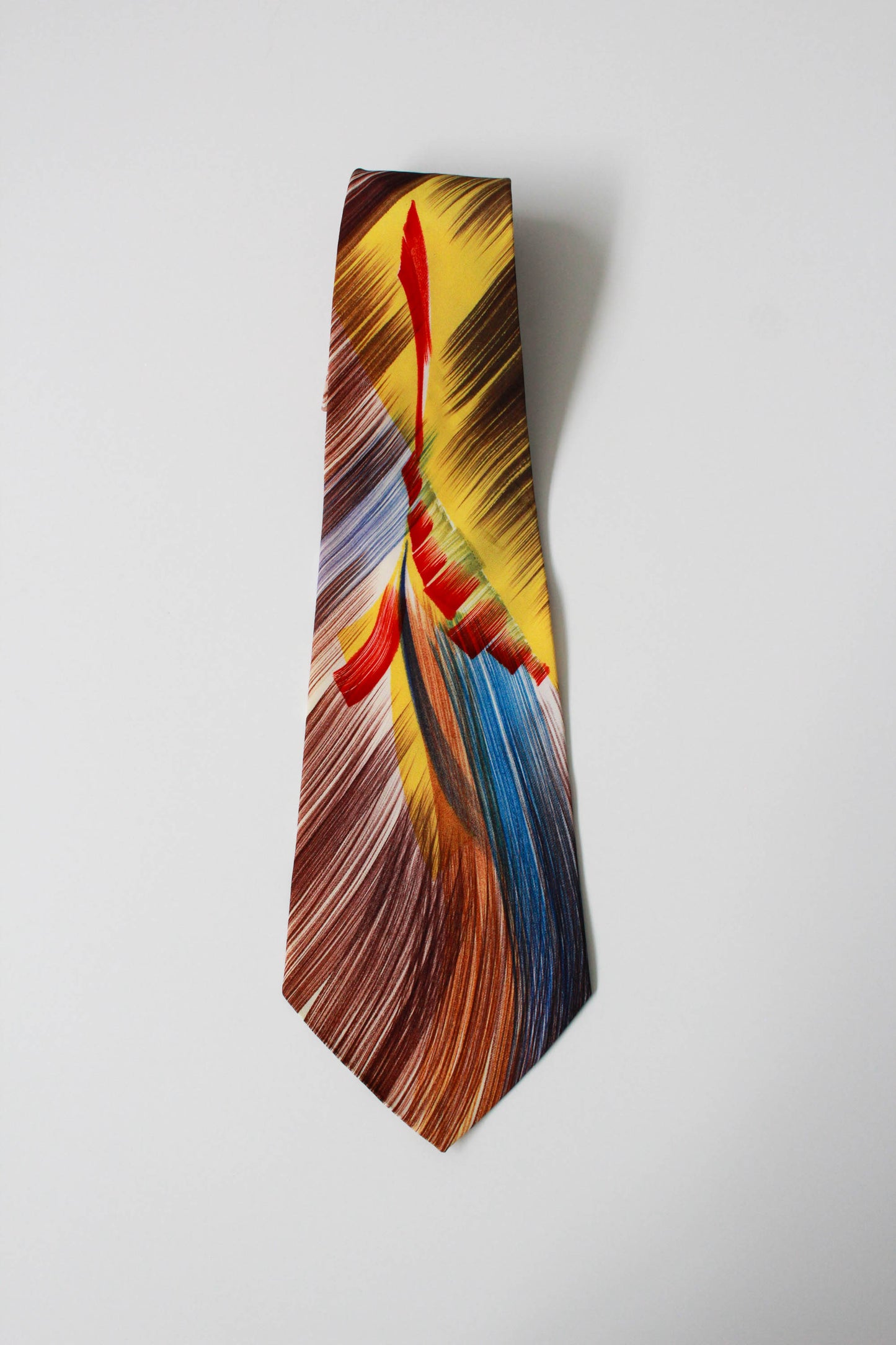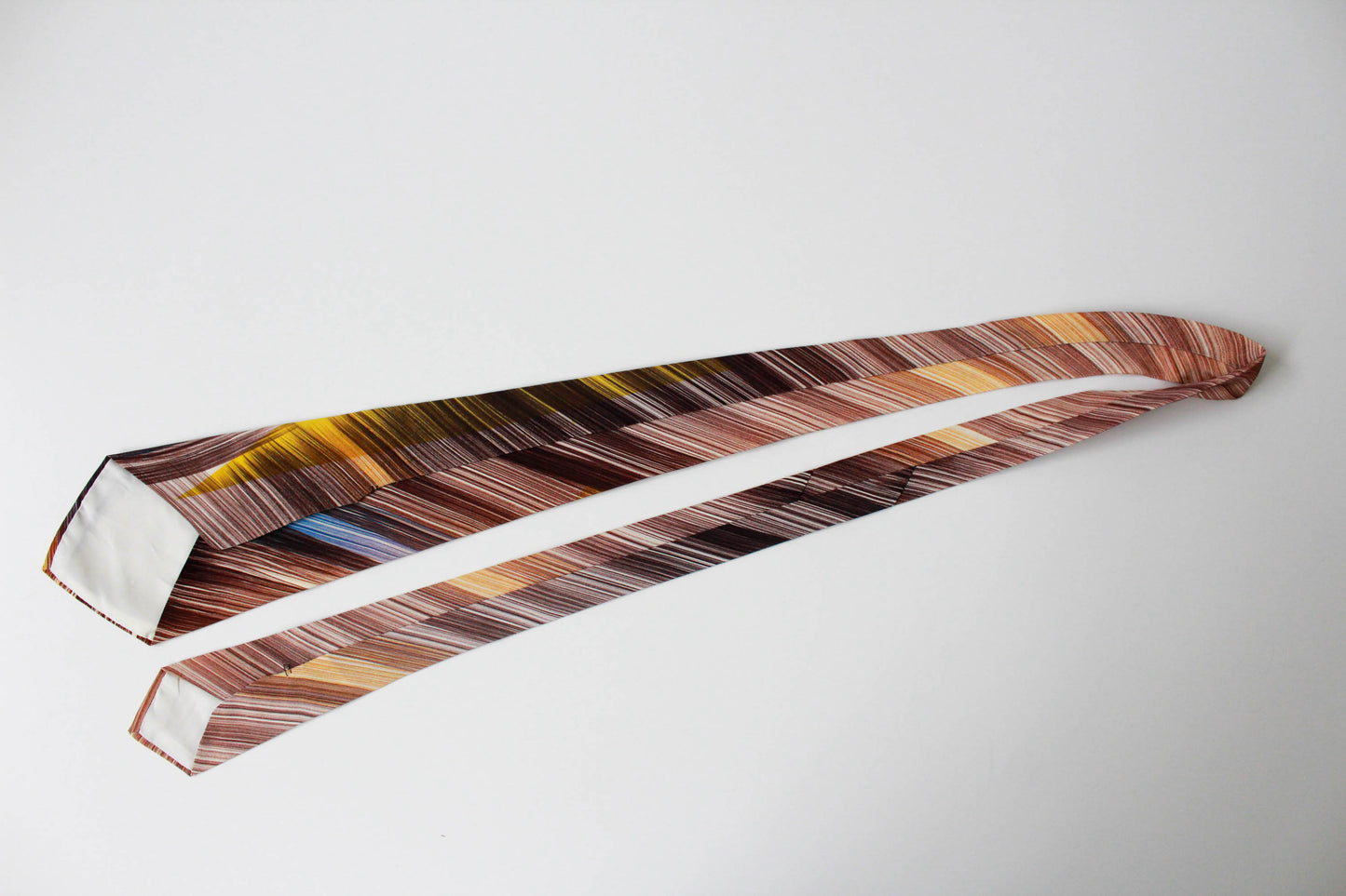 Colourful 1940s handpainted necktie, with an abstract brush stroke design on the front and a striated striping in brown, yellow and blue.