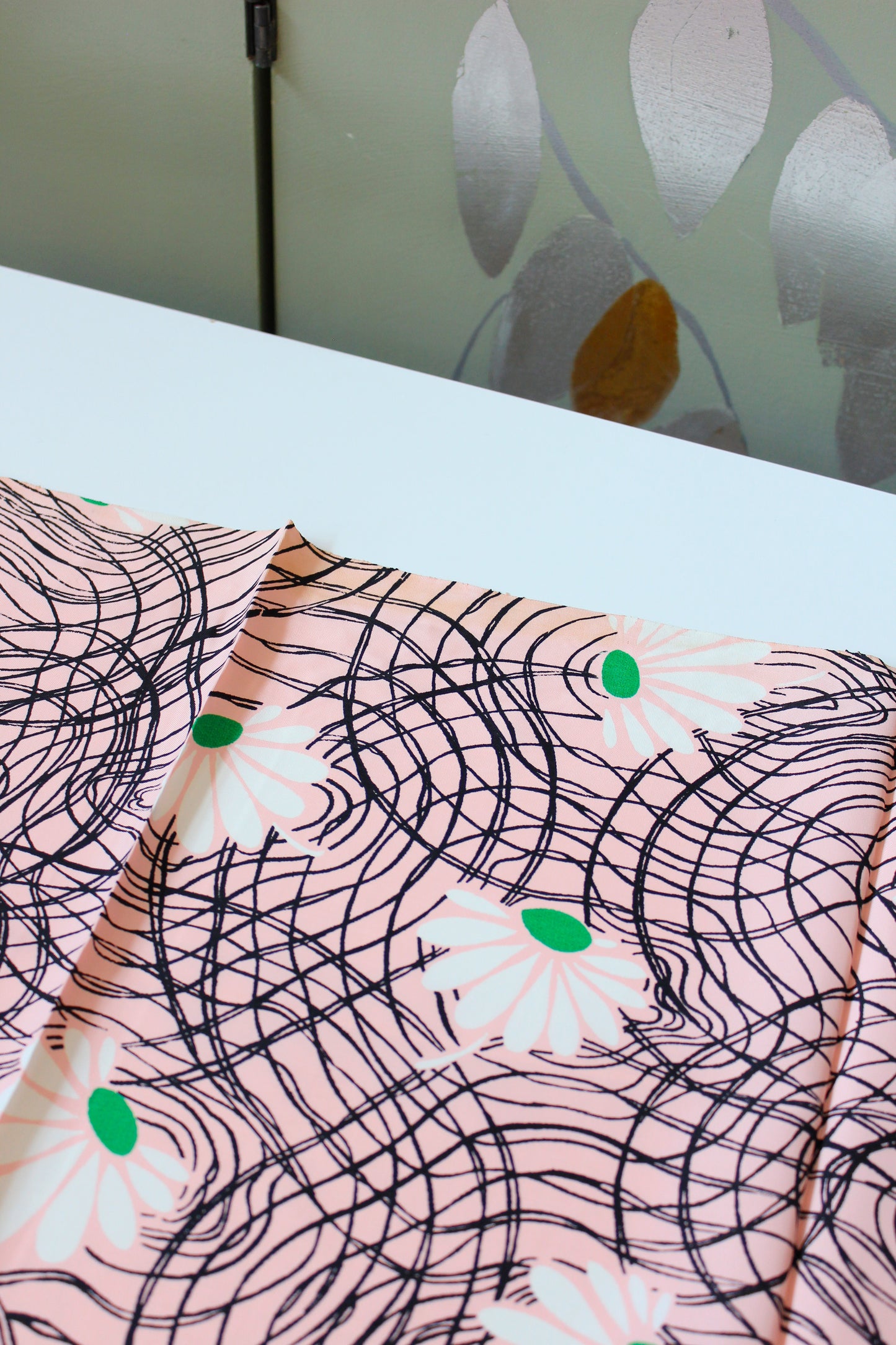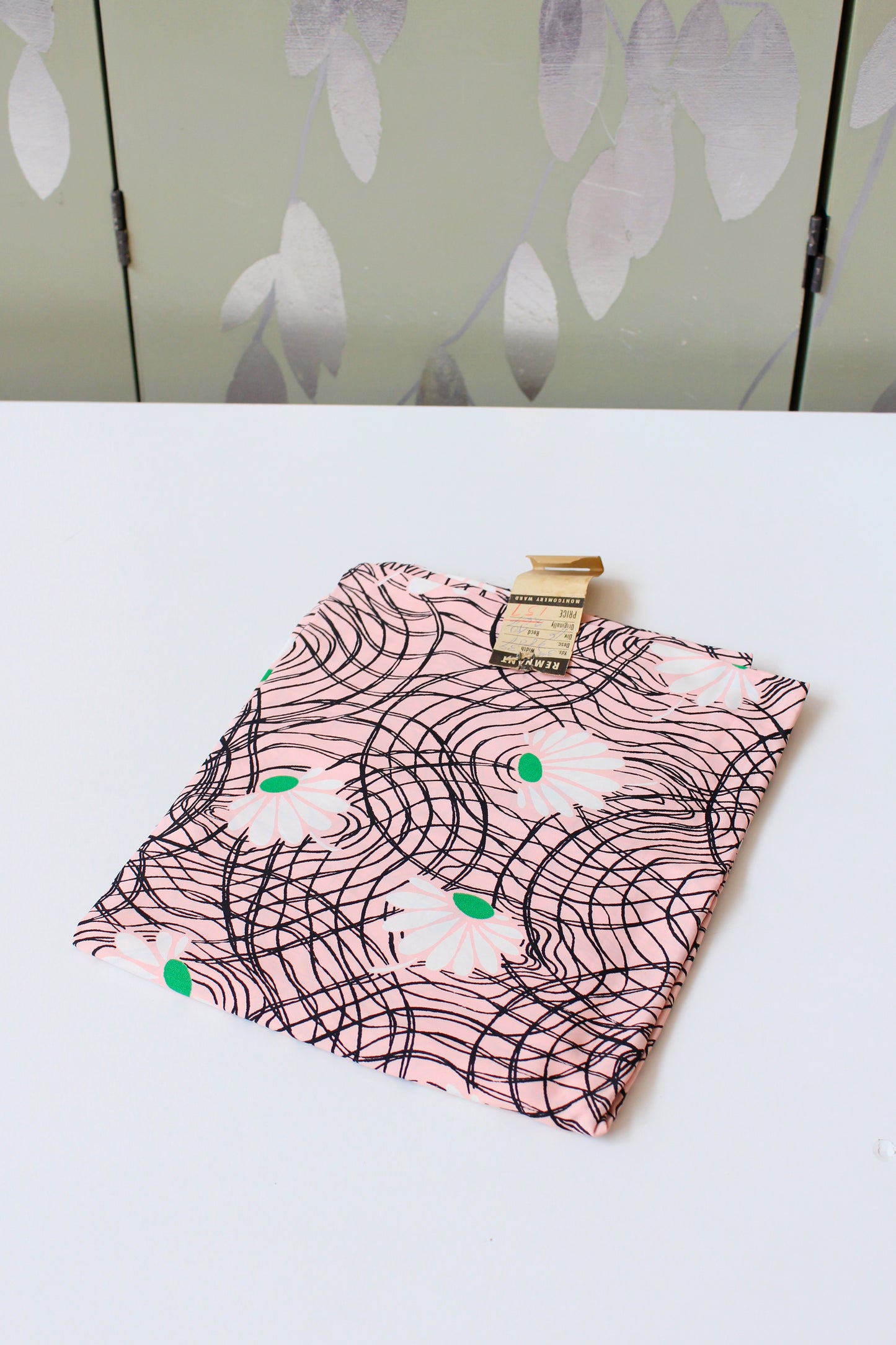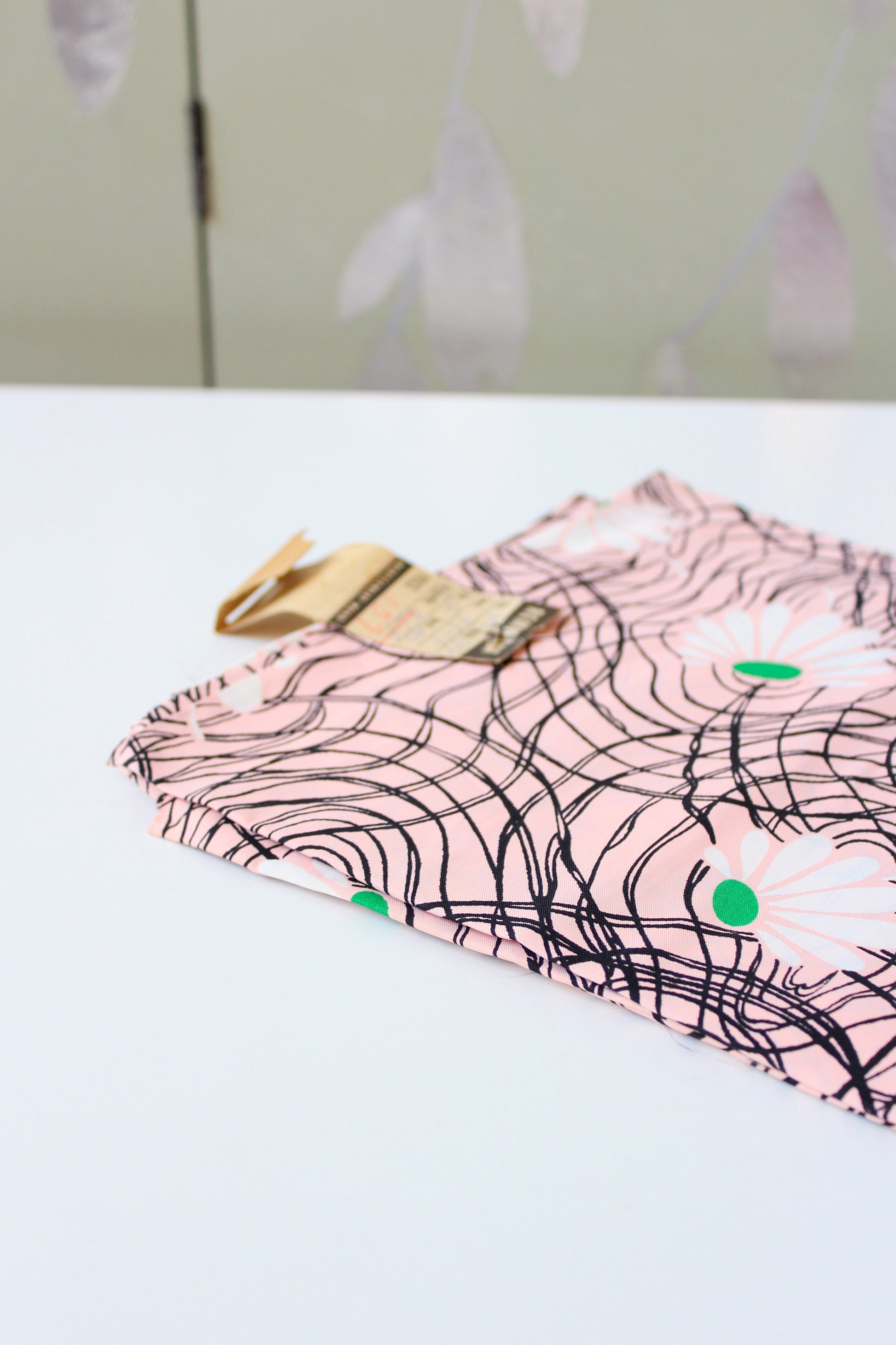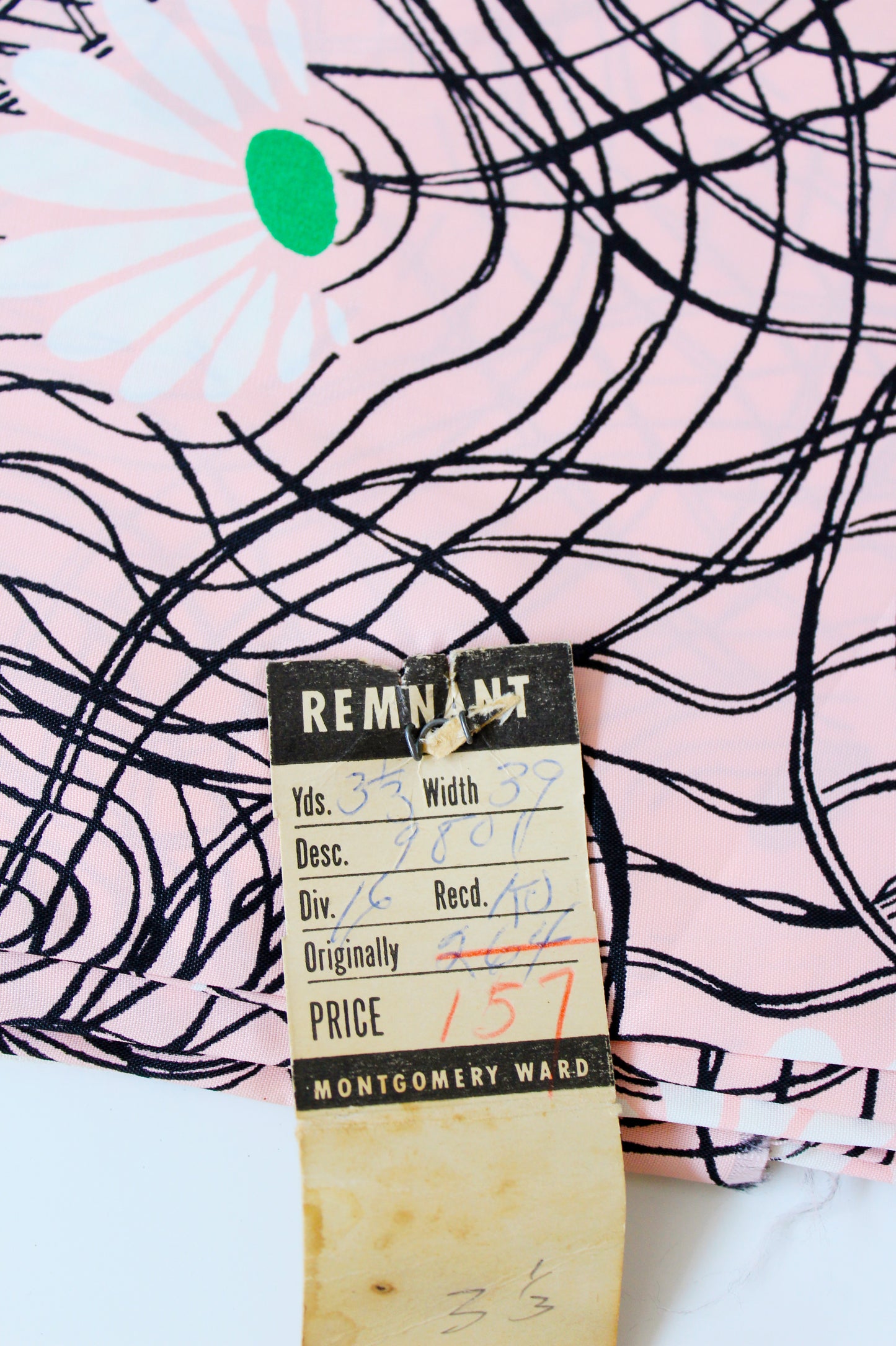 This Rayon fabric from the 1940s is truly stunning! The base is a a gorgeous Light pink, it has illustrated white flowers with a green centre. There are also thin black lights in a swirl shape/circle shape.  This fabric is perfect for a piece for spring, I'm thinking a blouse!   There are 3.5 yards of fabric. It also comes with an original tag