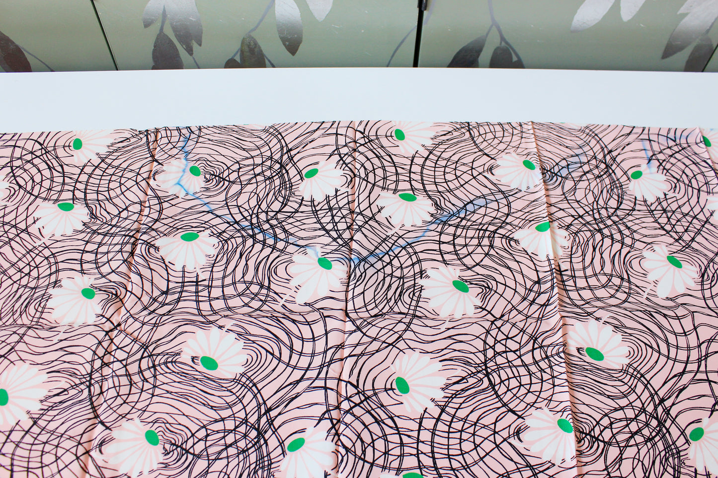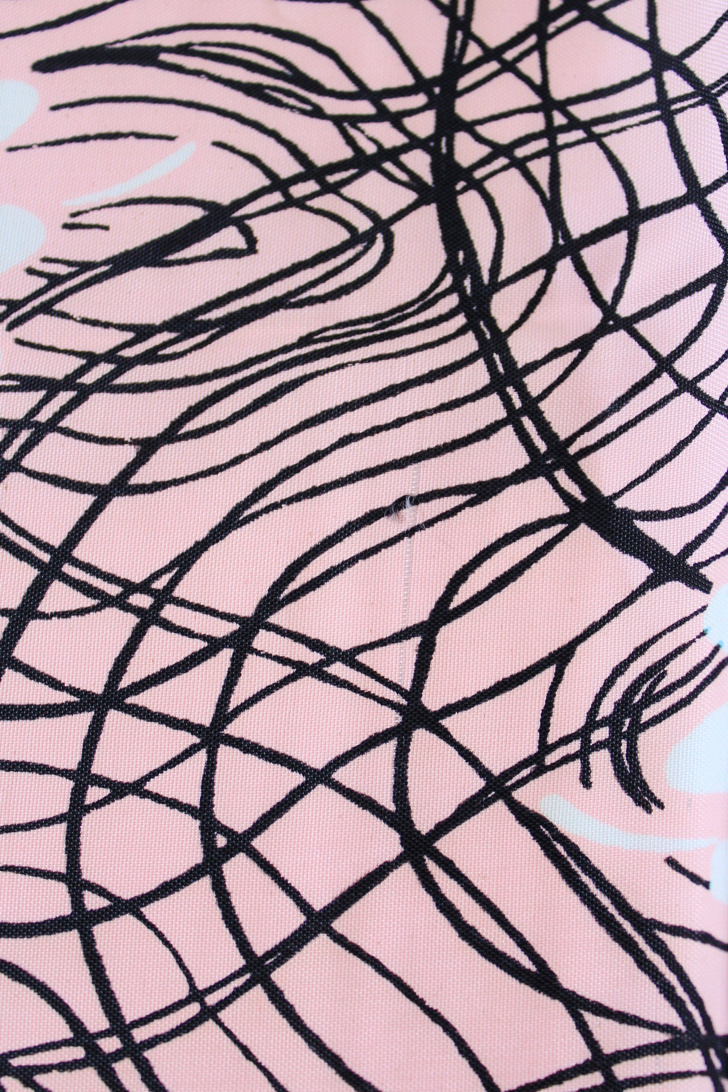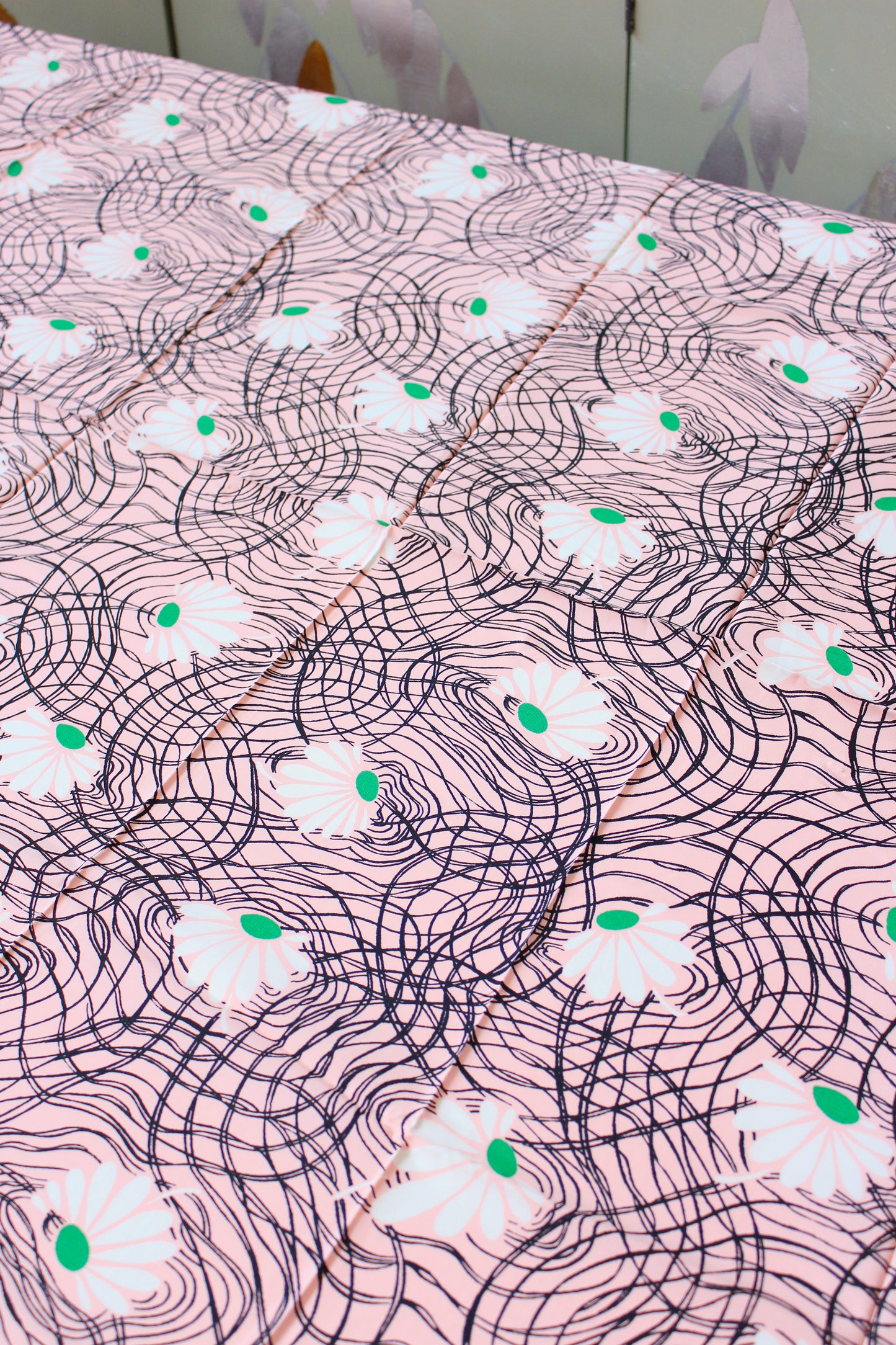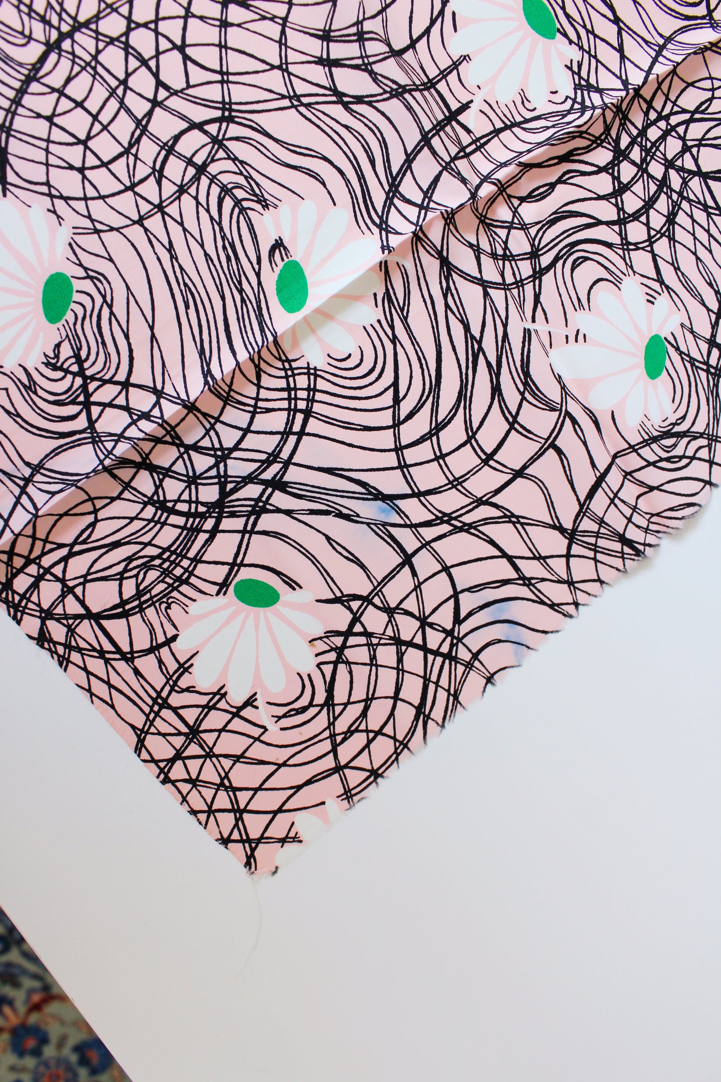 This Rayon fabric from the 1940s is truly stunning! The base is a a gorgeous Light pink, it has illustrated white flowers with a green centre. There are also thin black lights in a swirl shape/circle shape.  This fabric is perfect for a piece for spring, I'm thinking a blouse!   There are 3.5 yards of fabric. It also comes with an original tag