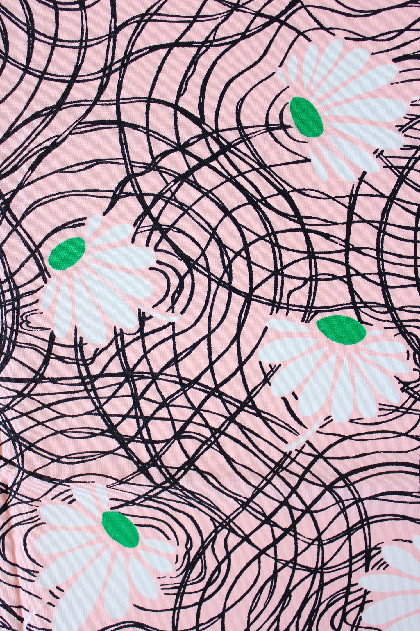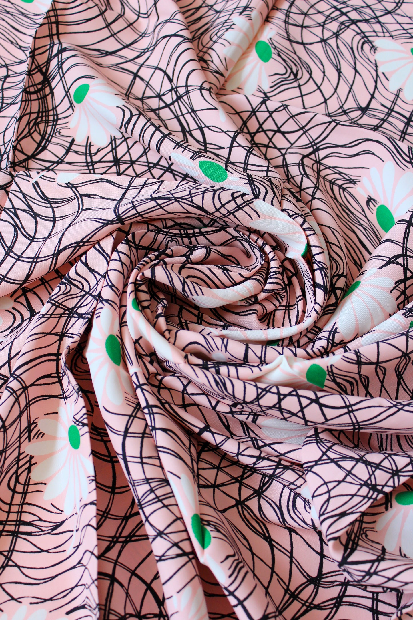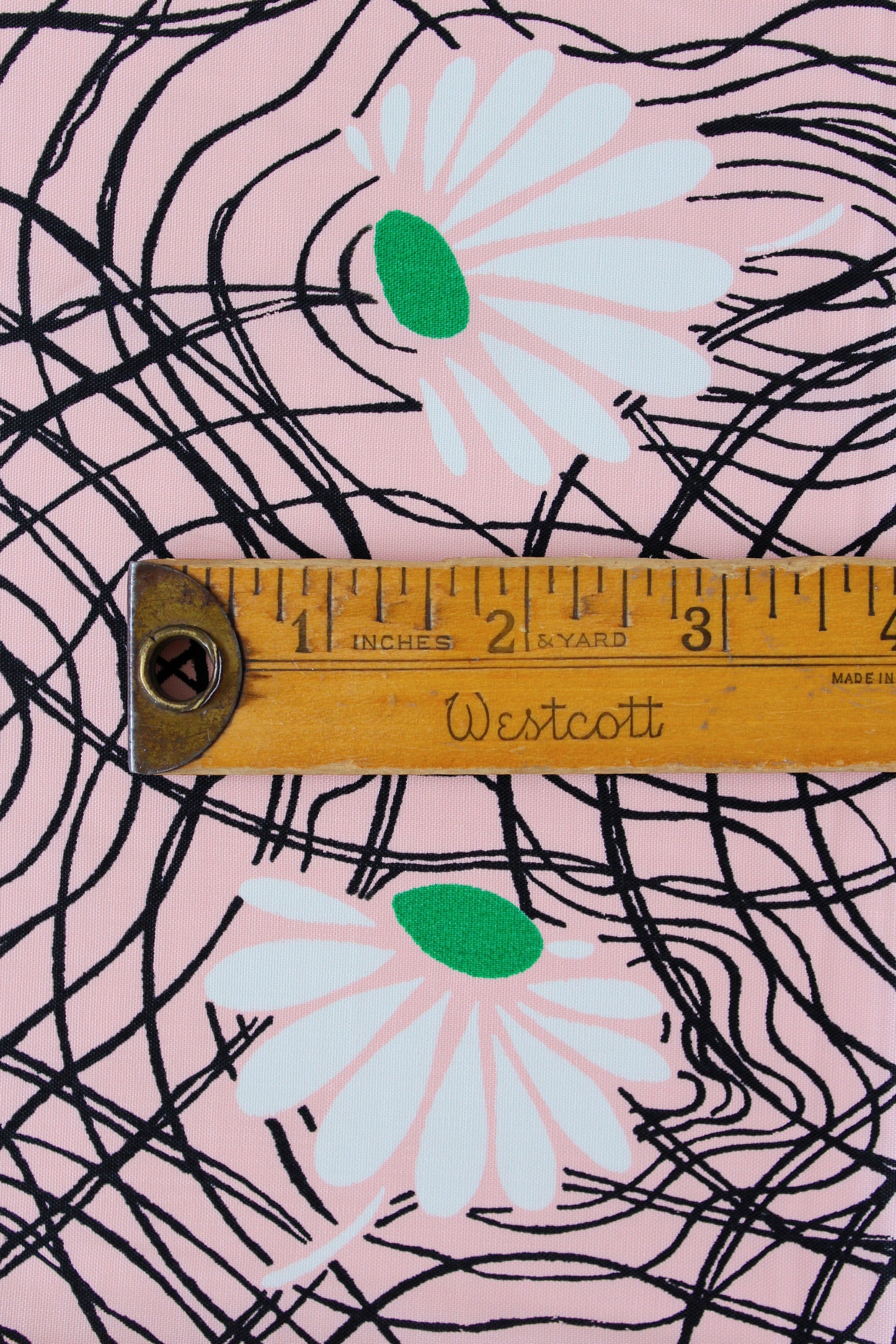 1940s Light Pink White Flower With Black Swirls Rayon Sewing Fabric, 3.5 Yards