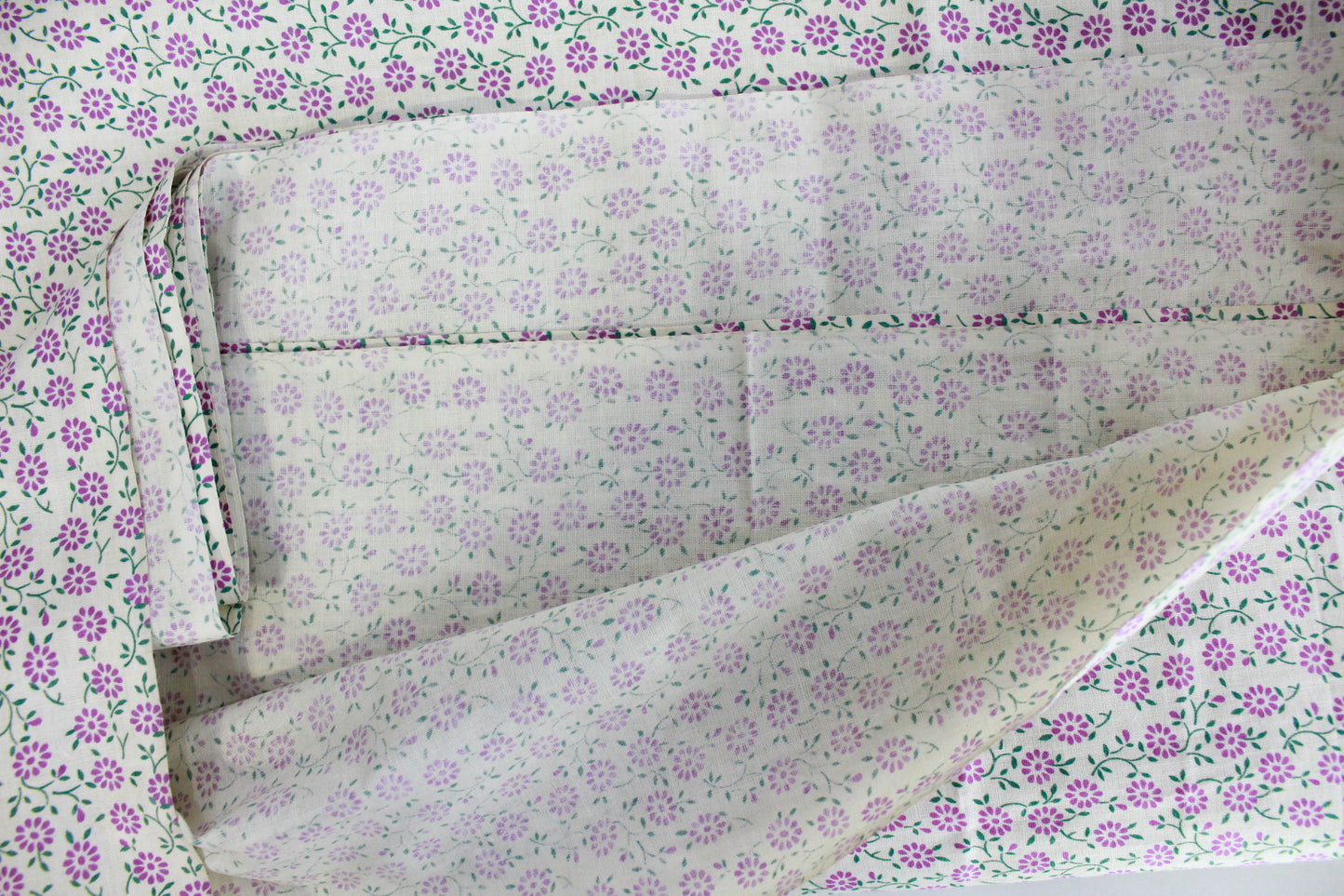 The sweetest 1950s floral print cotton fabric! The flowers are tiny little lilac purple daisies with green stems against a cream background. There is 8.5 yards total, making it idea for creating multiple pieces. Could be used for dresses, a cute top and skirt/shorts coordinated set, bucket hats, blouses - the possibilities are endless!