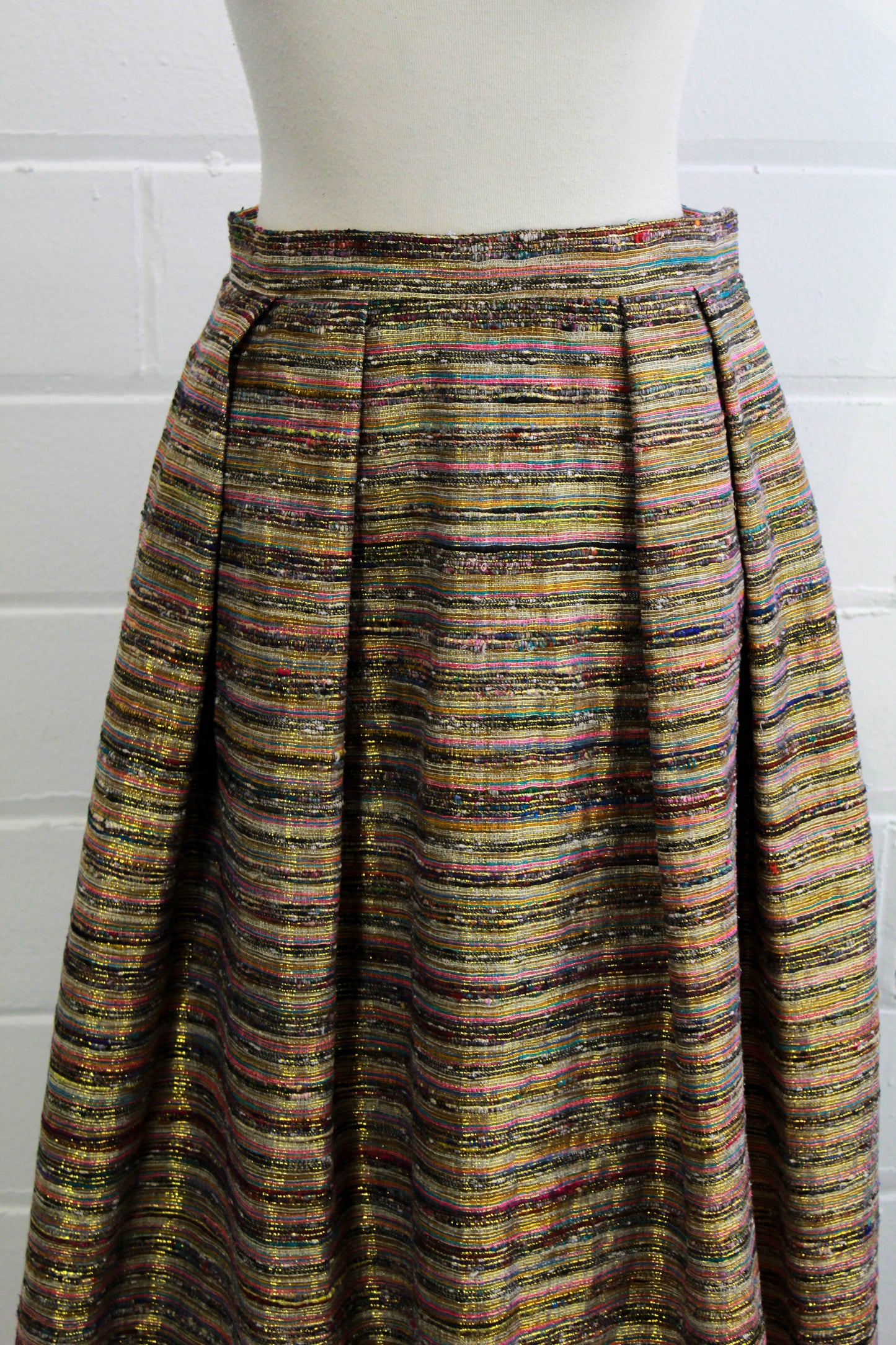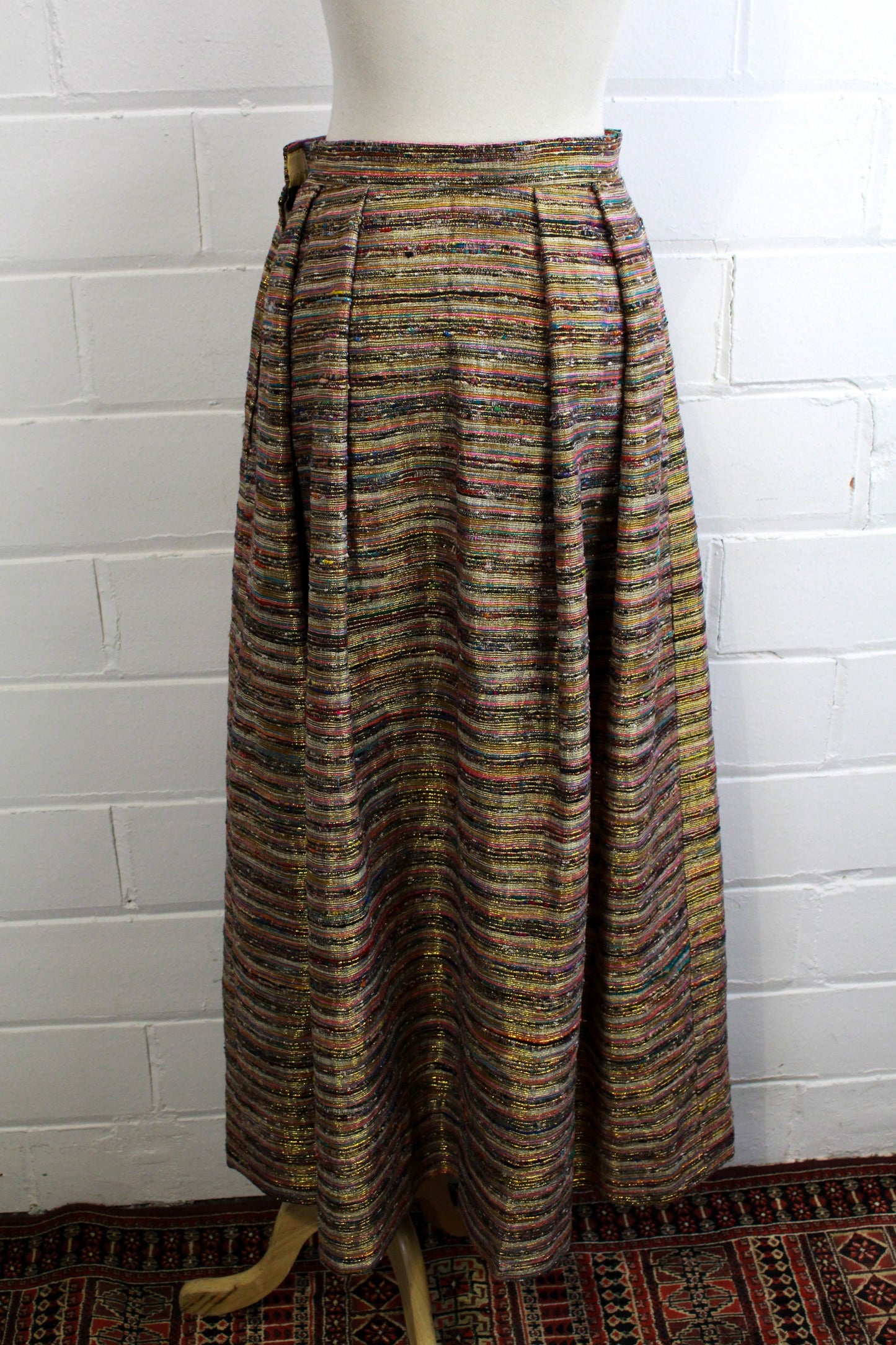 Wow what a stunner! This beautiful maxi skirt is made from a beautiful metallic gold striped fabric with a myriad of colours throughout. It is quite thick and stiff, giving the skirt a nice A-line with crisp pleats at the waist. The waist closes with velcro and a zipper on the side and it falls to the ankles. Perfect for holiday parties and special occasions!