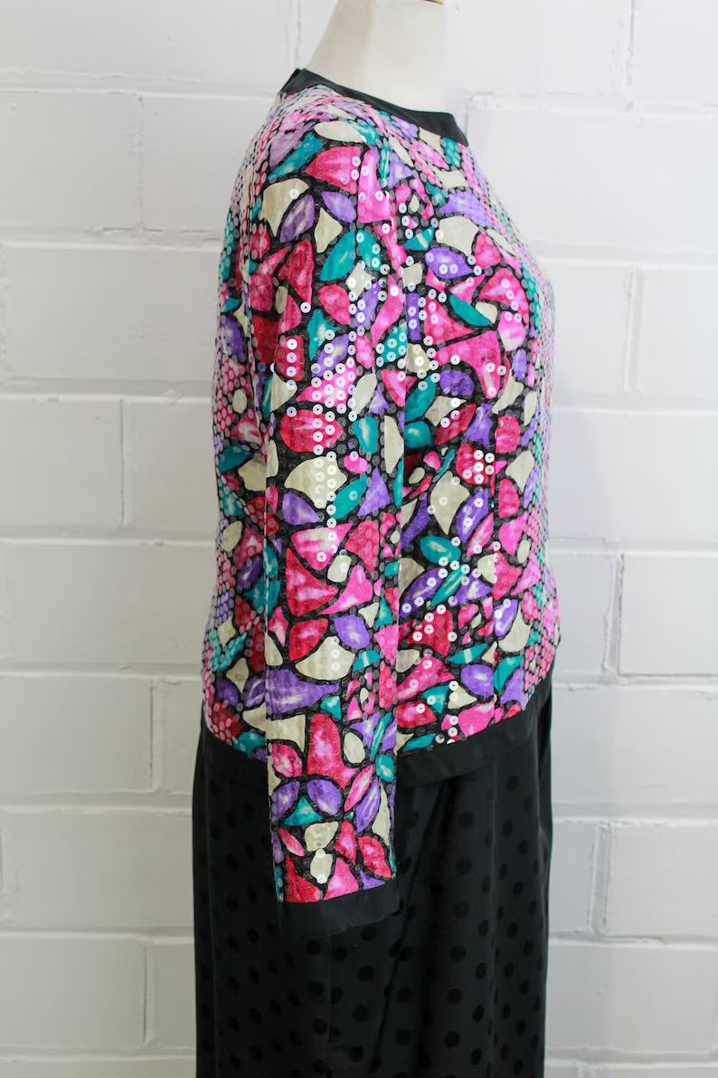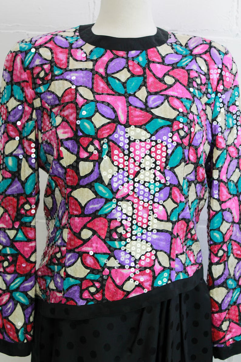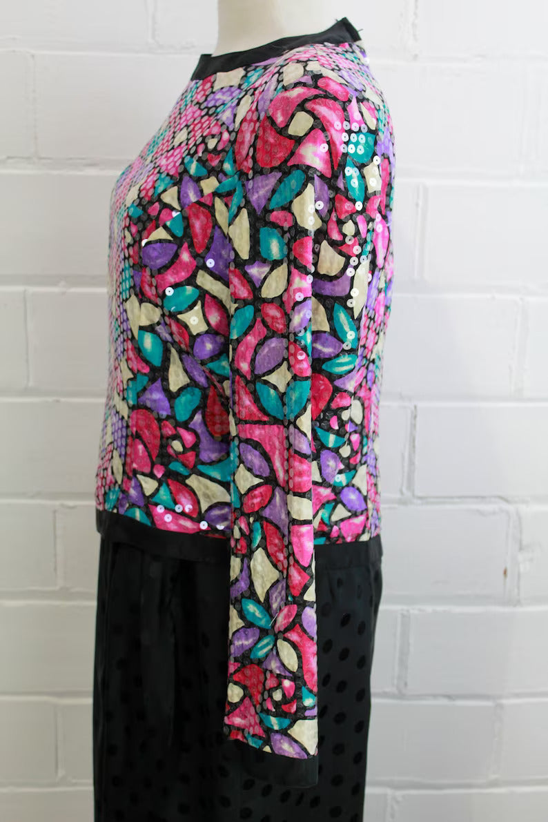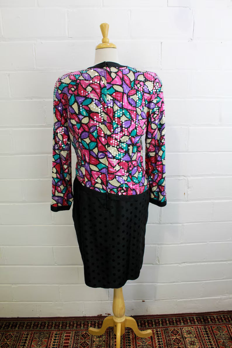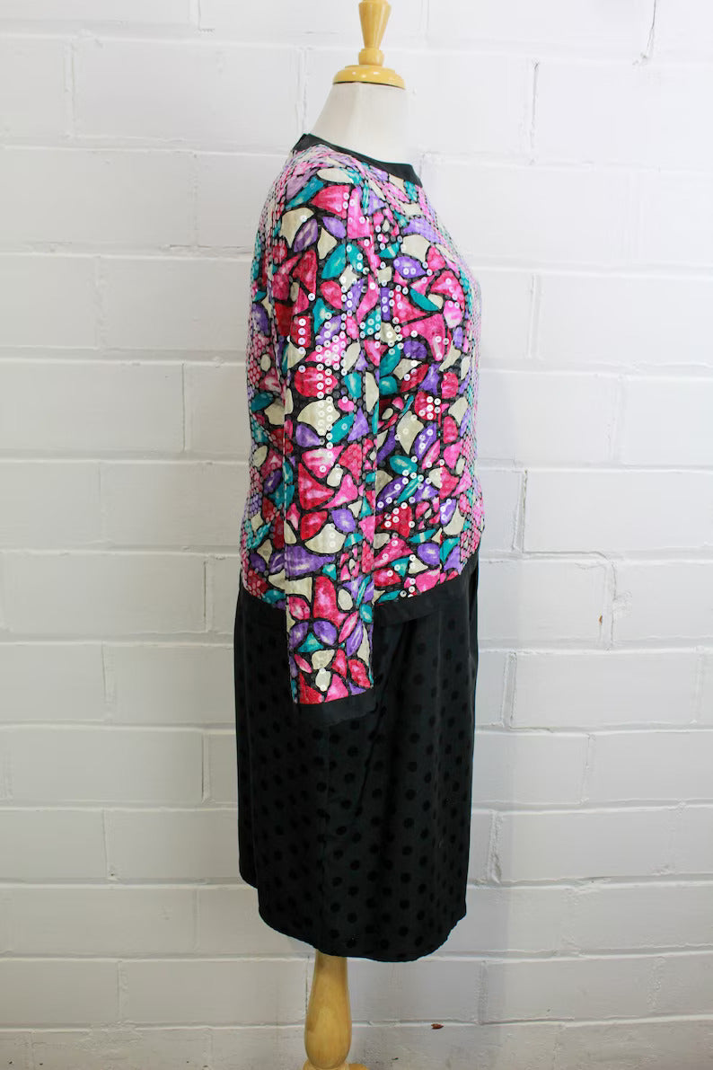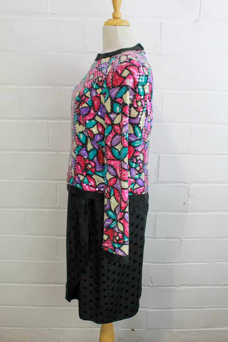 This is such a fun 80s dress! It's by Anne Crimmins for Umi Collections. The bodice is made from a patterned silk in bright purple, pink, turquoise and black and topped with sequins. The skirt is black silk with a subtle polka dot, and is dropwaist with a draped front that gathers to one side of the waist. It zips up at centre back, there are shoulder pads, and is lined with an attached slip dress.