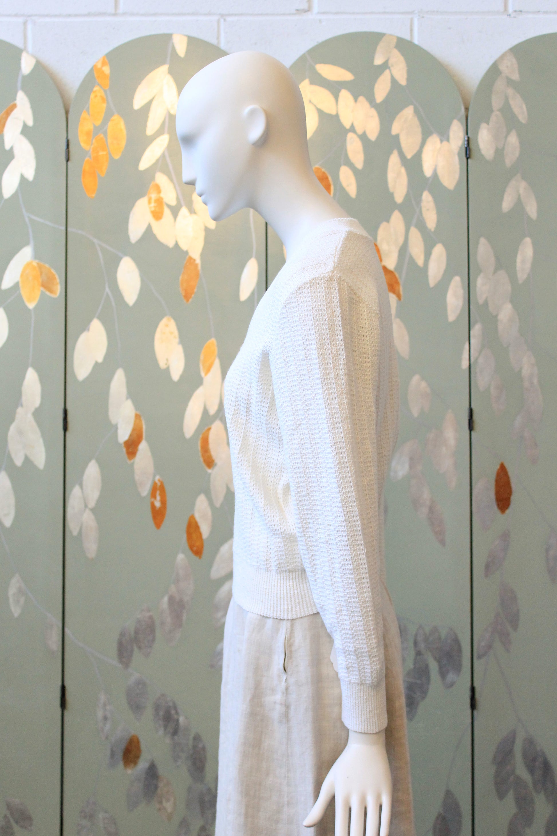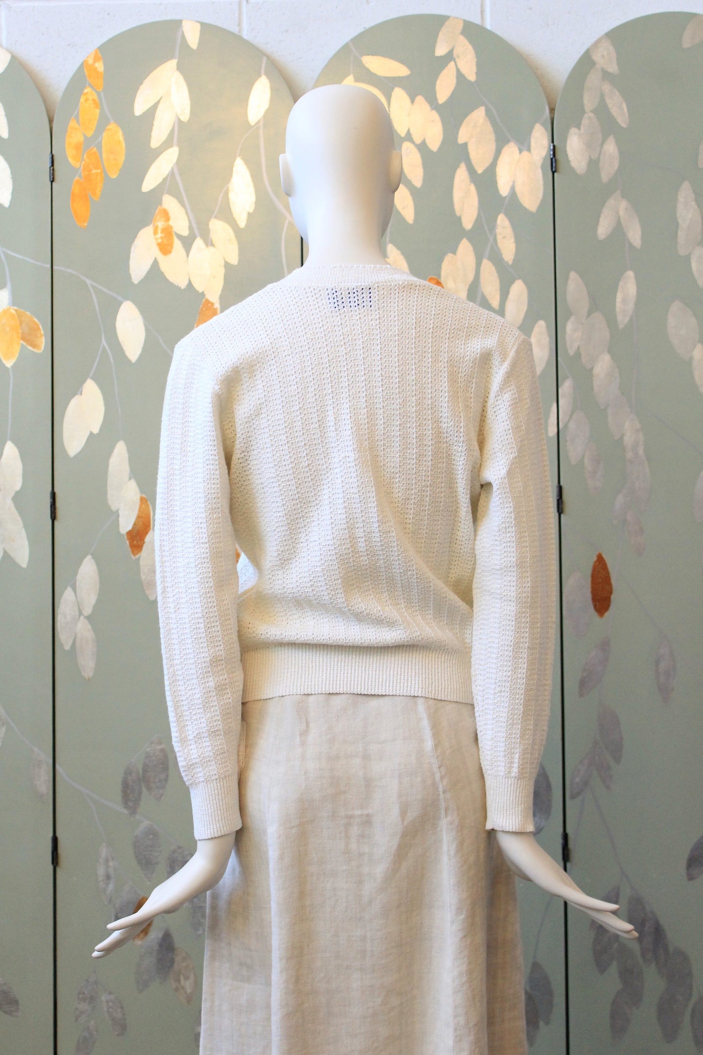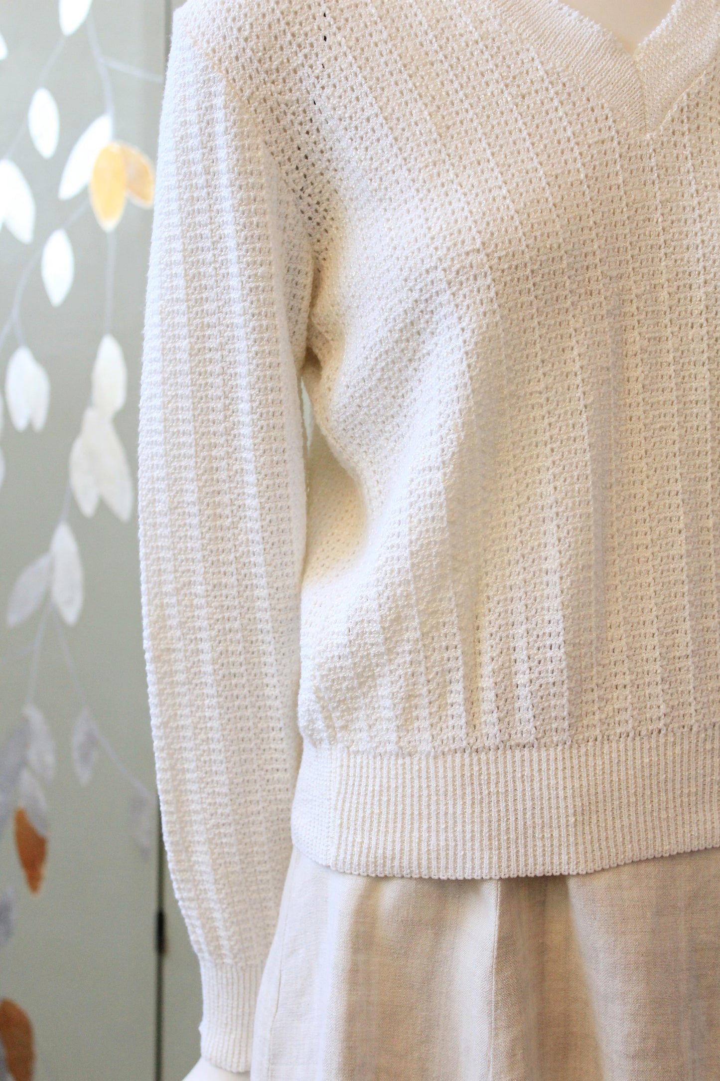 1980s Classic Deadstock Long Sleeve Cream V Neck Knit Top, Small