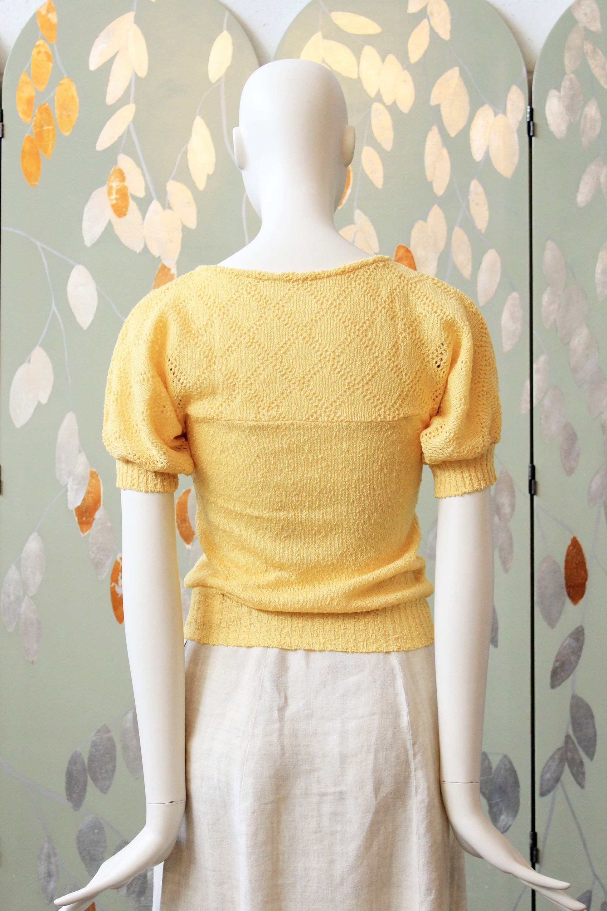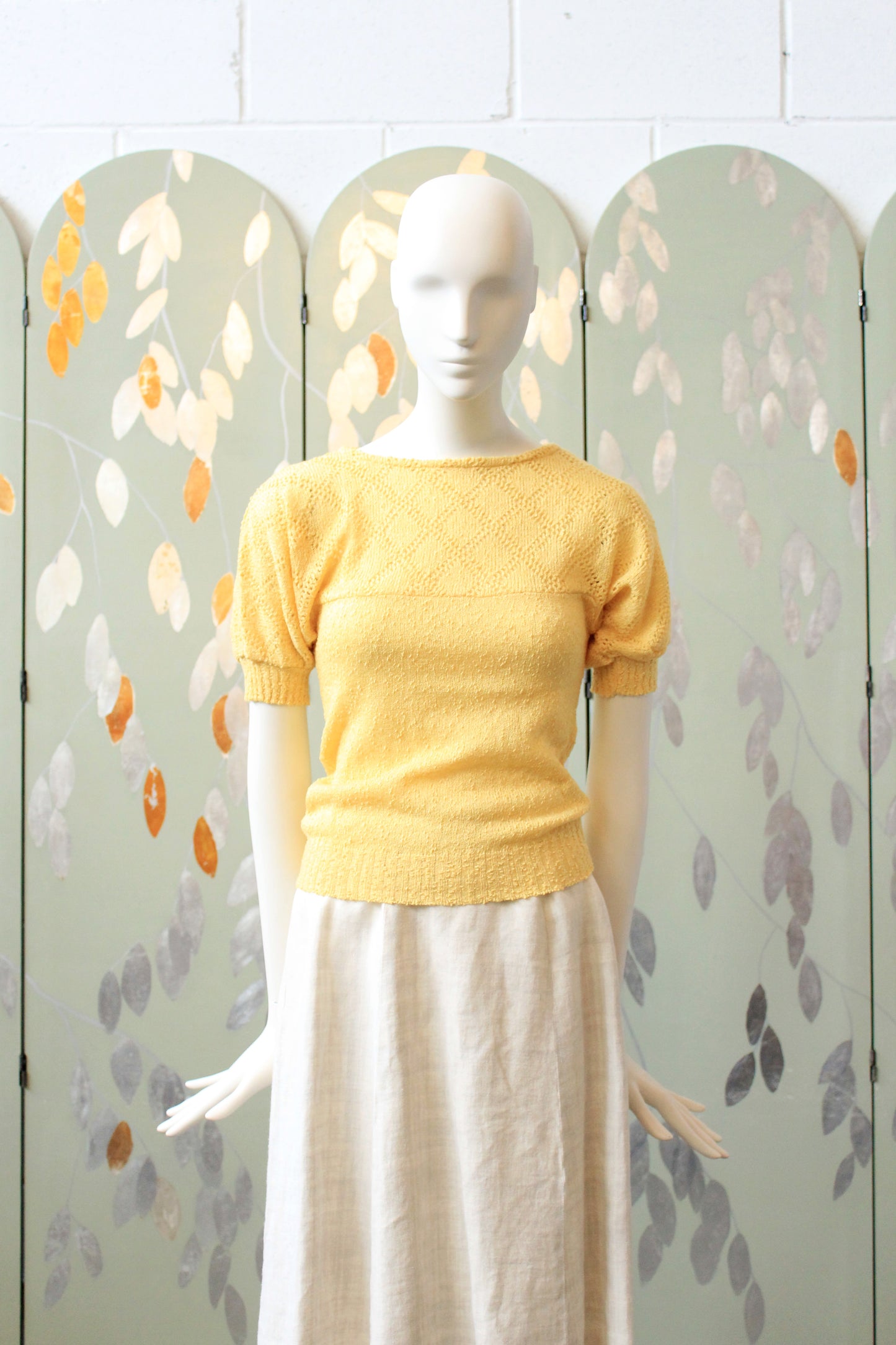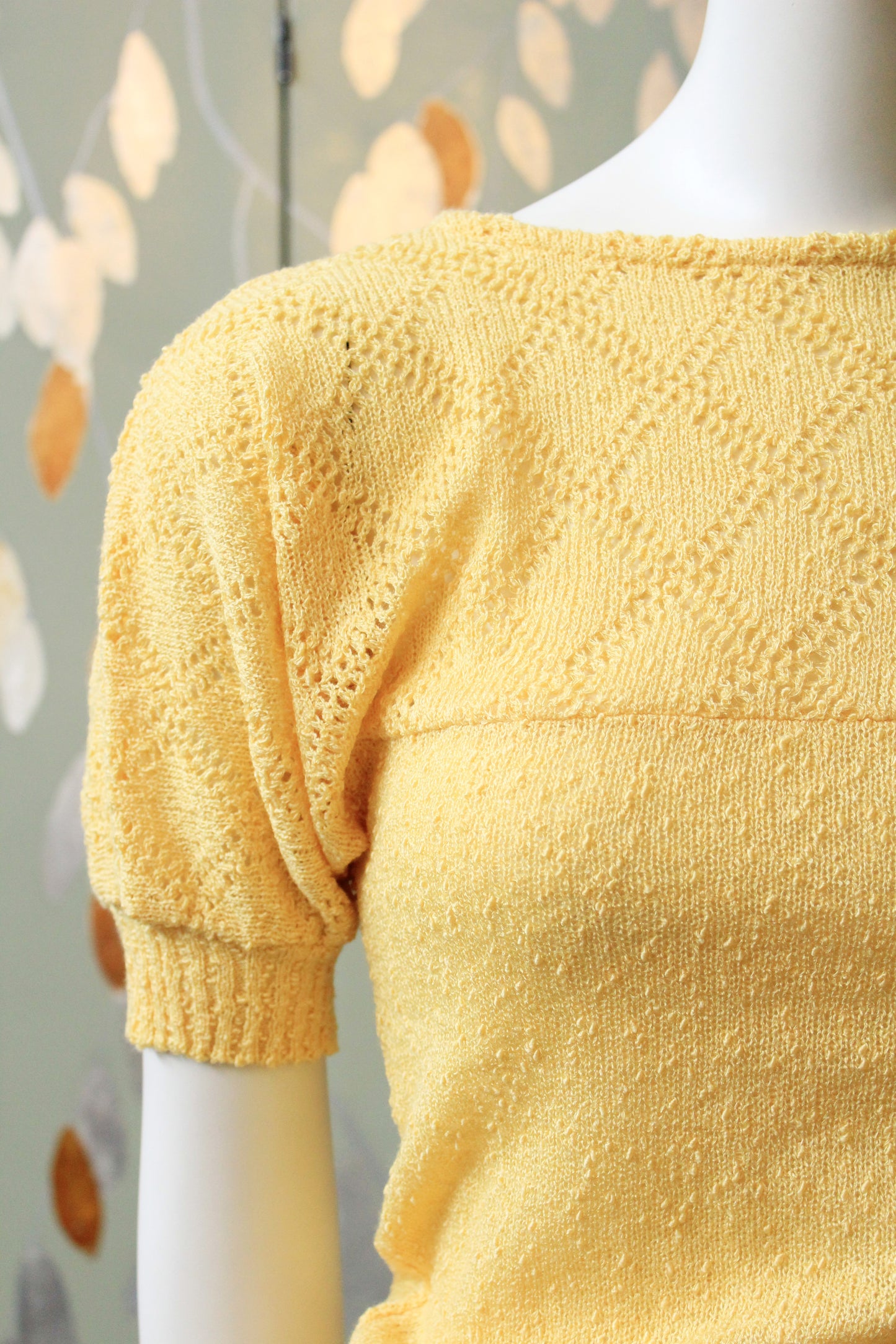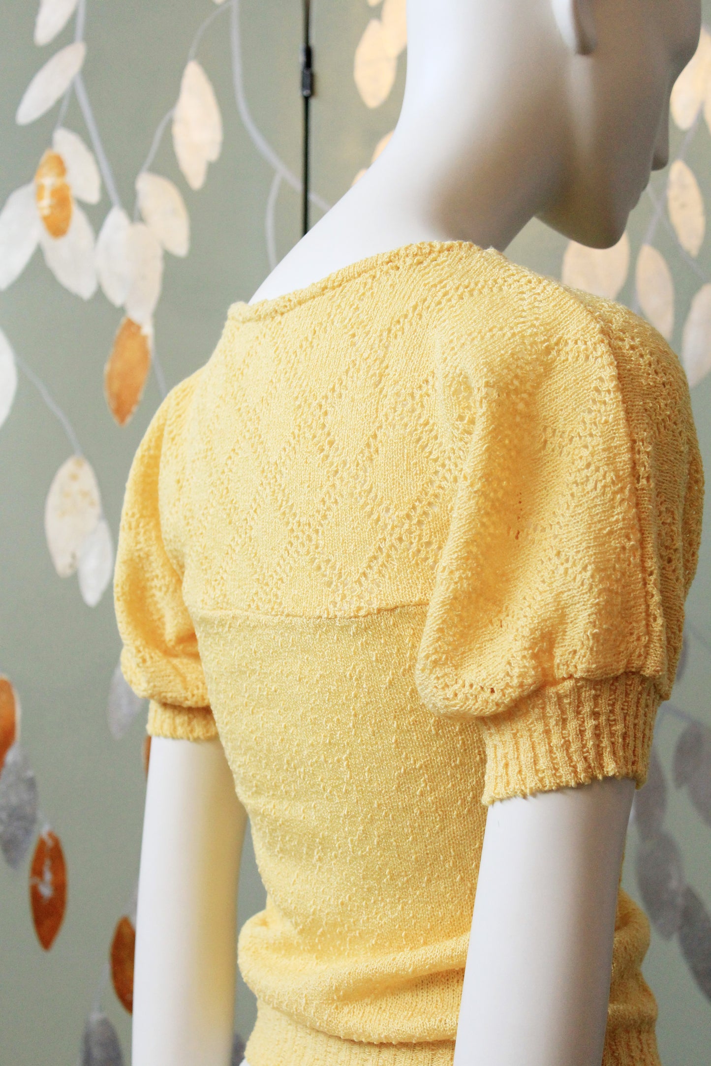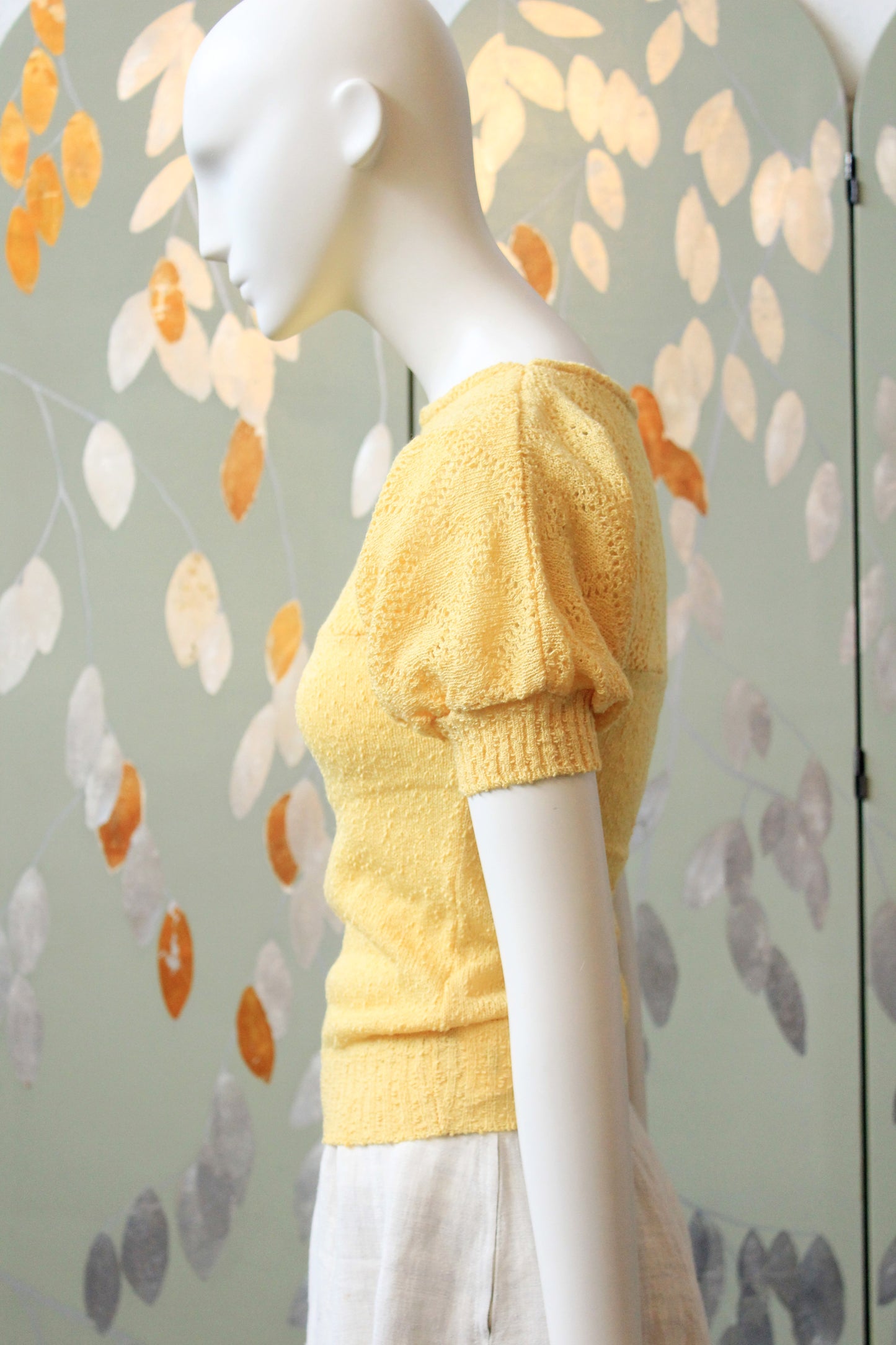 1980s Girly Puff Sleeve Deadstock Short Sleeve Yellow Acrylic Knit Top, Small + Large