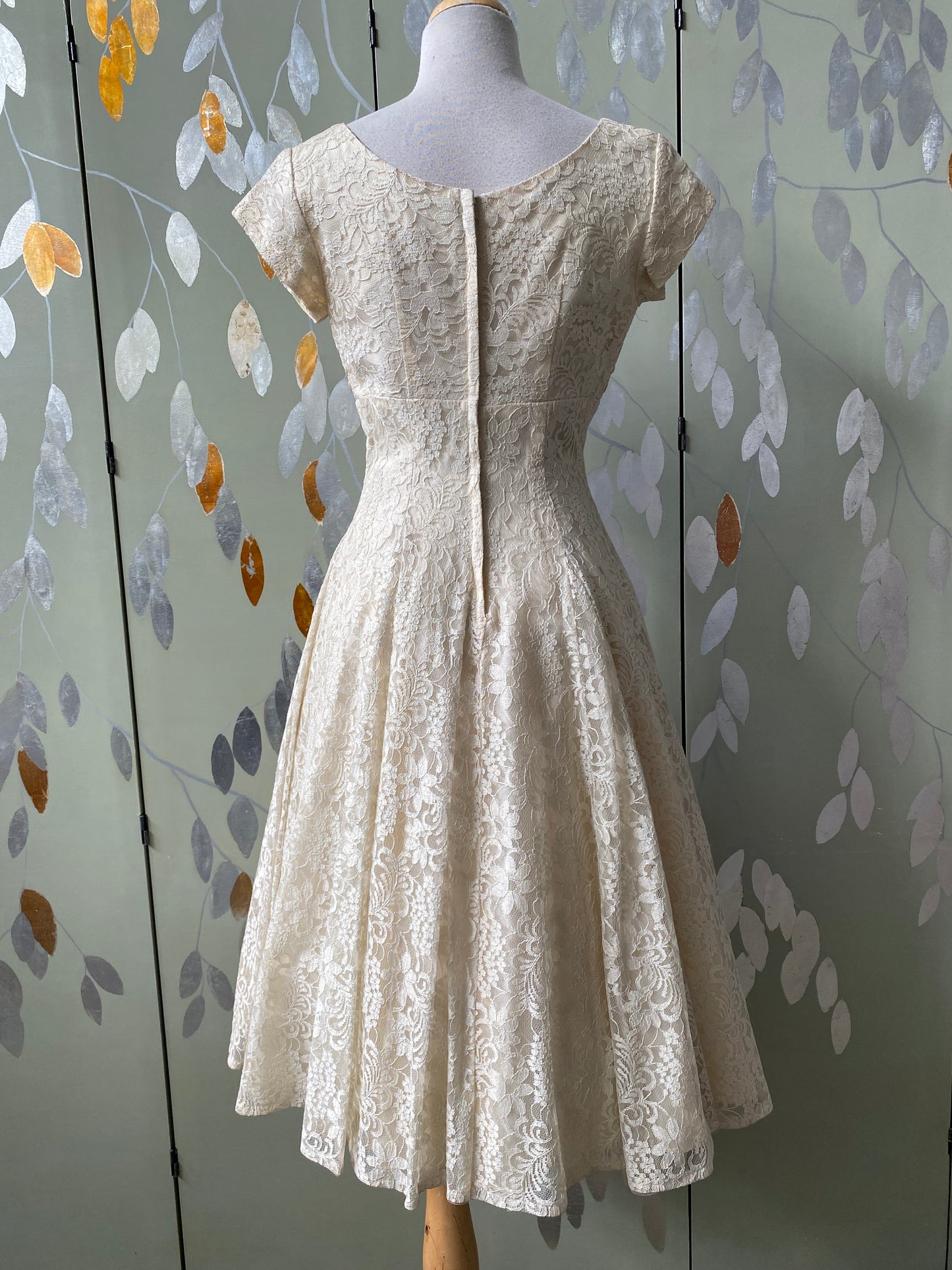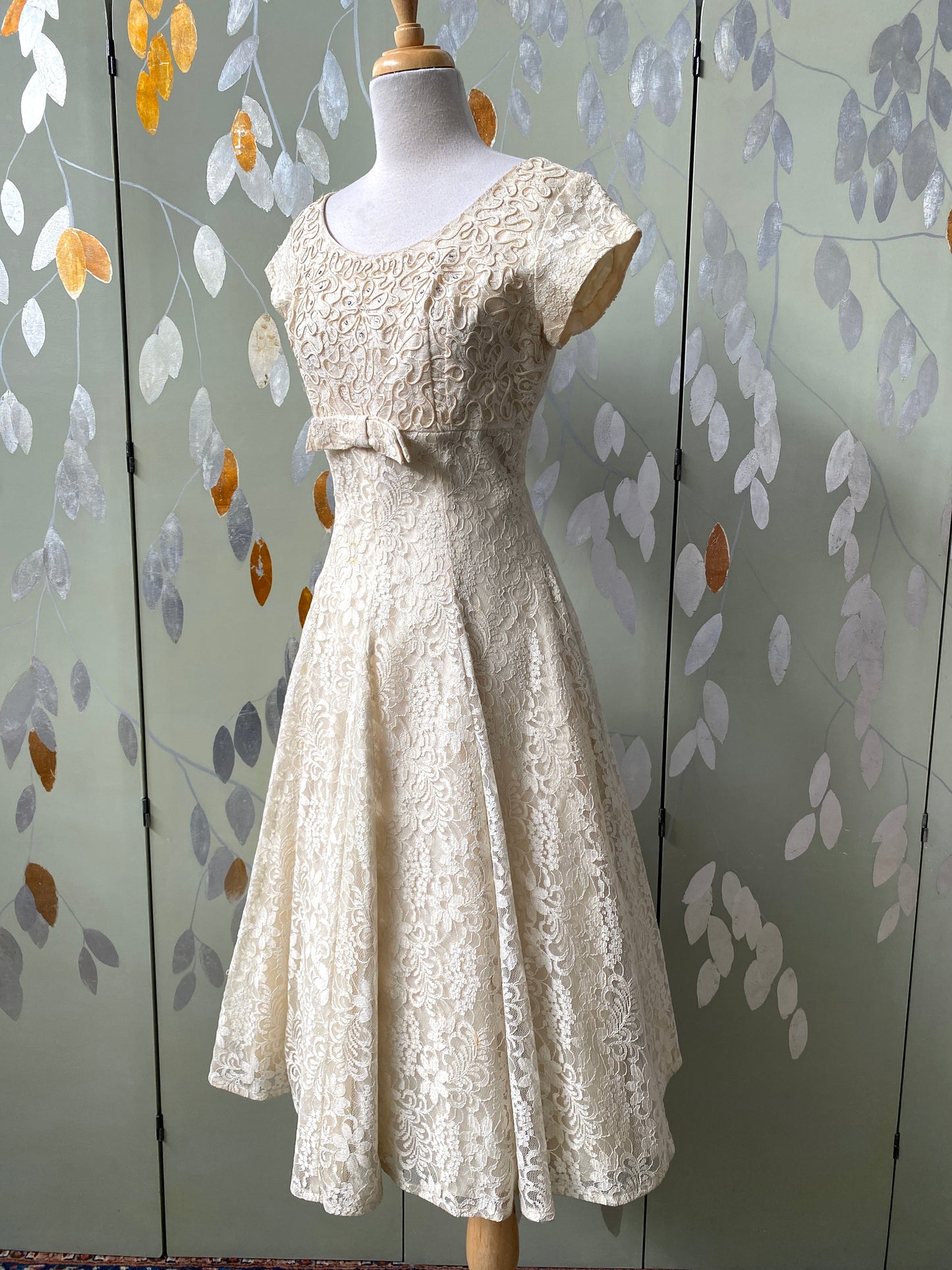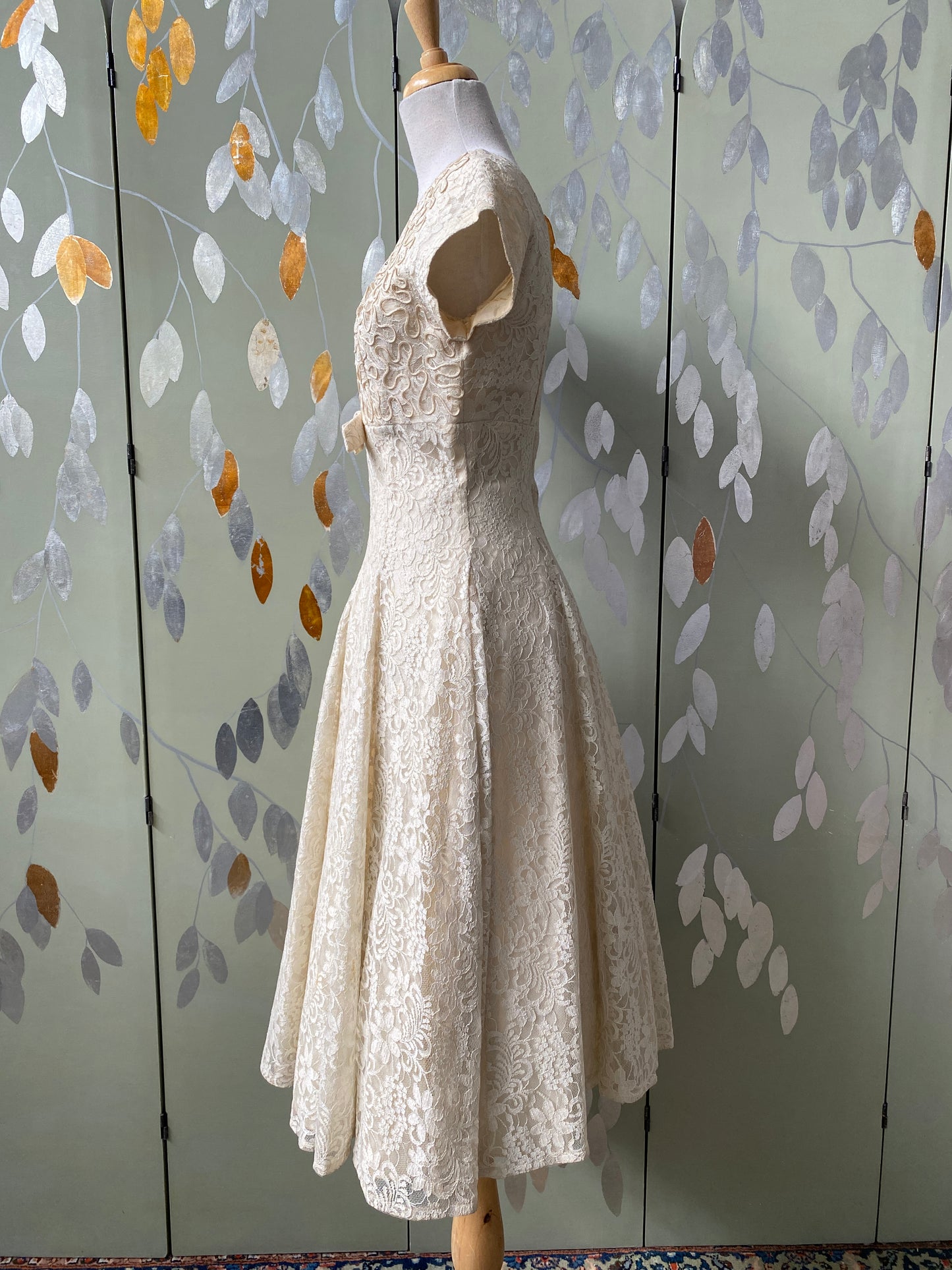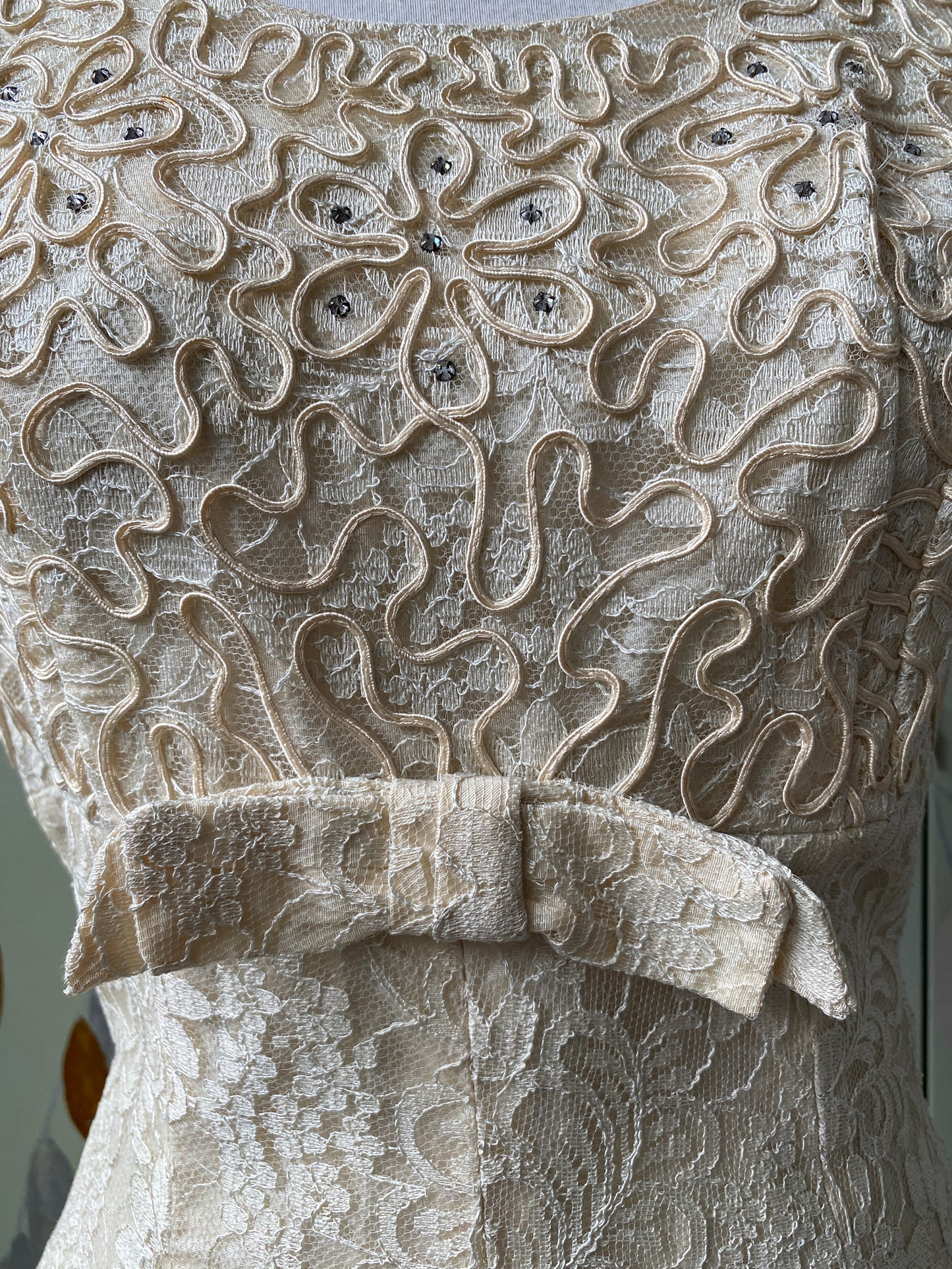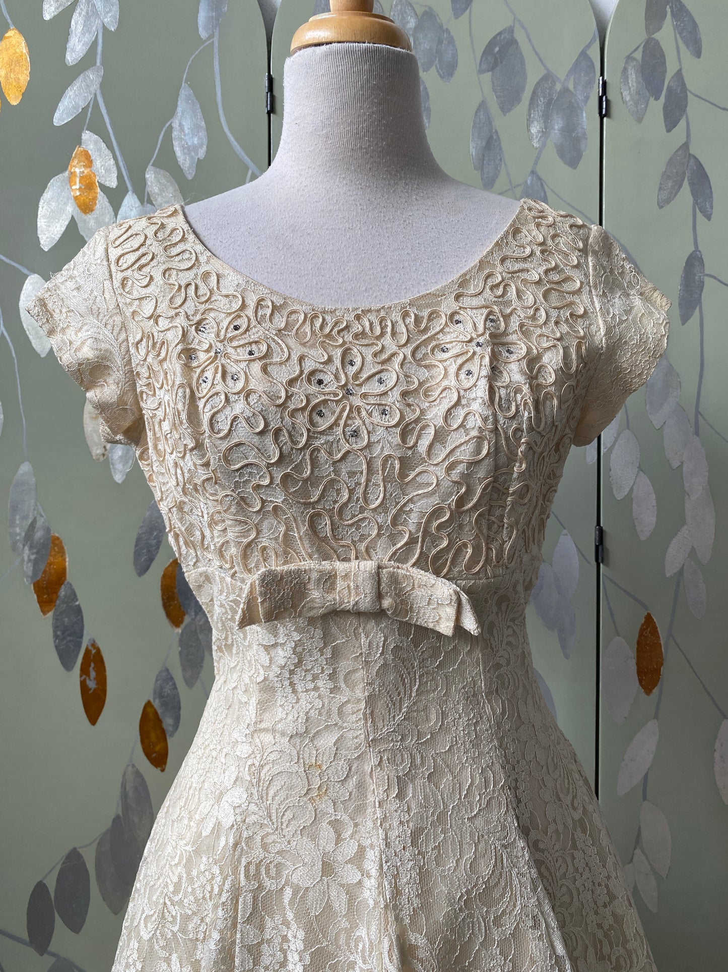 Vintage 1950s Cream Lace Cocktail Dress with Embellished Bodice, B34"