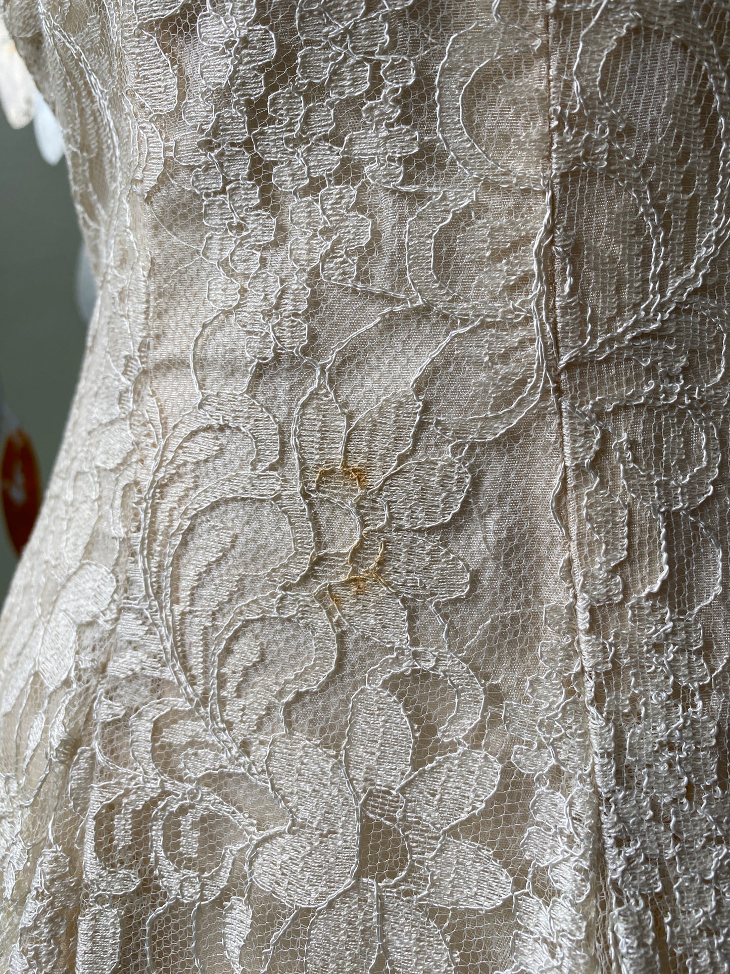 CONDITION: A number of stains on the front of the skirt, bodice/shoulder area and the underskirt. The rhinestones are quite tarnished. A small break in the lace on the left sleeve. Some frayed threads here and there. Minor darkening at the hem.