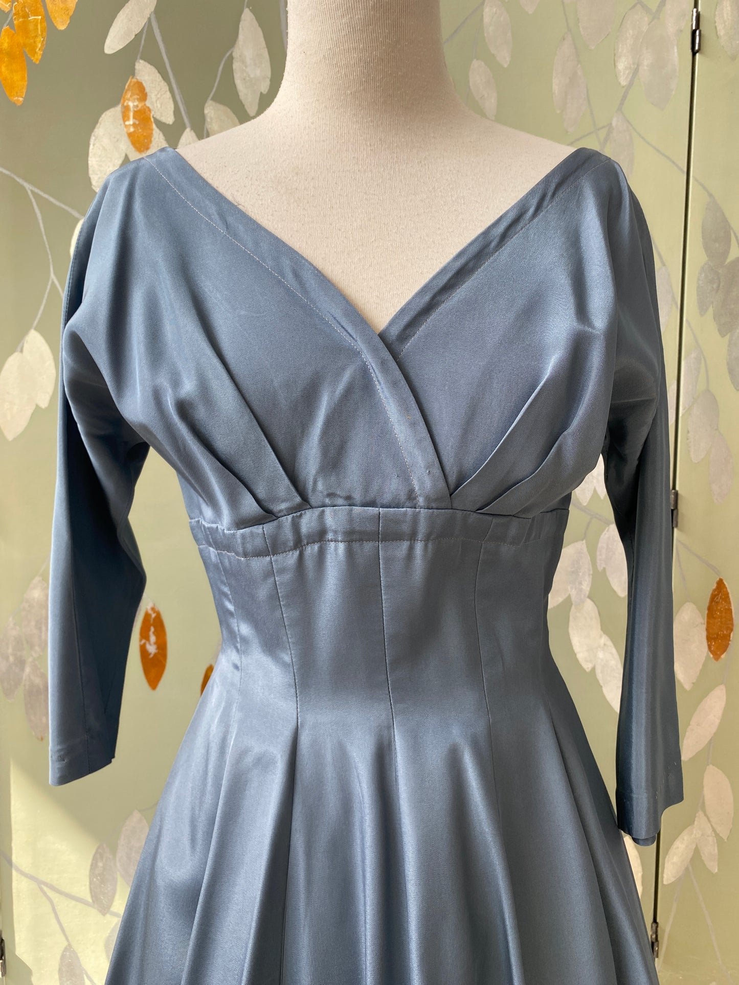 Elegant 1950s blue 3/4 sleeve cocktail dress with crossover pleated bodice, V neckline, empire waist and full princess seam skirt. It is unlined and zips up the back with a metal zipper. Photographed with a crinoline.