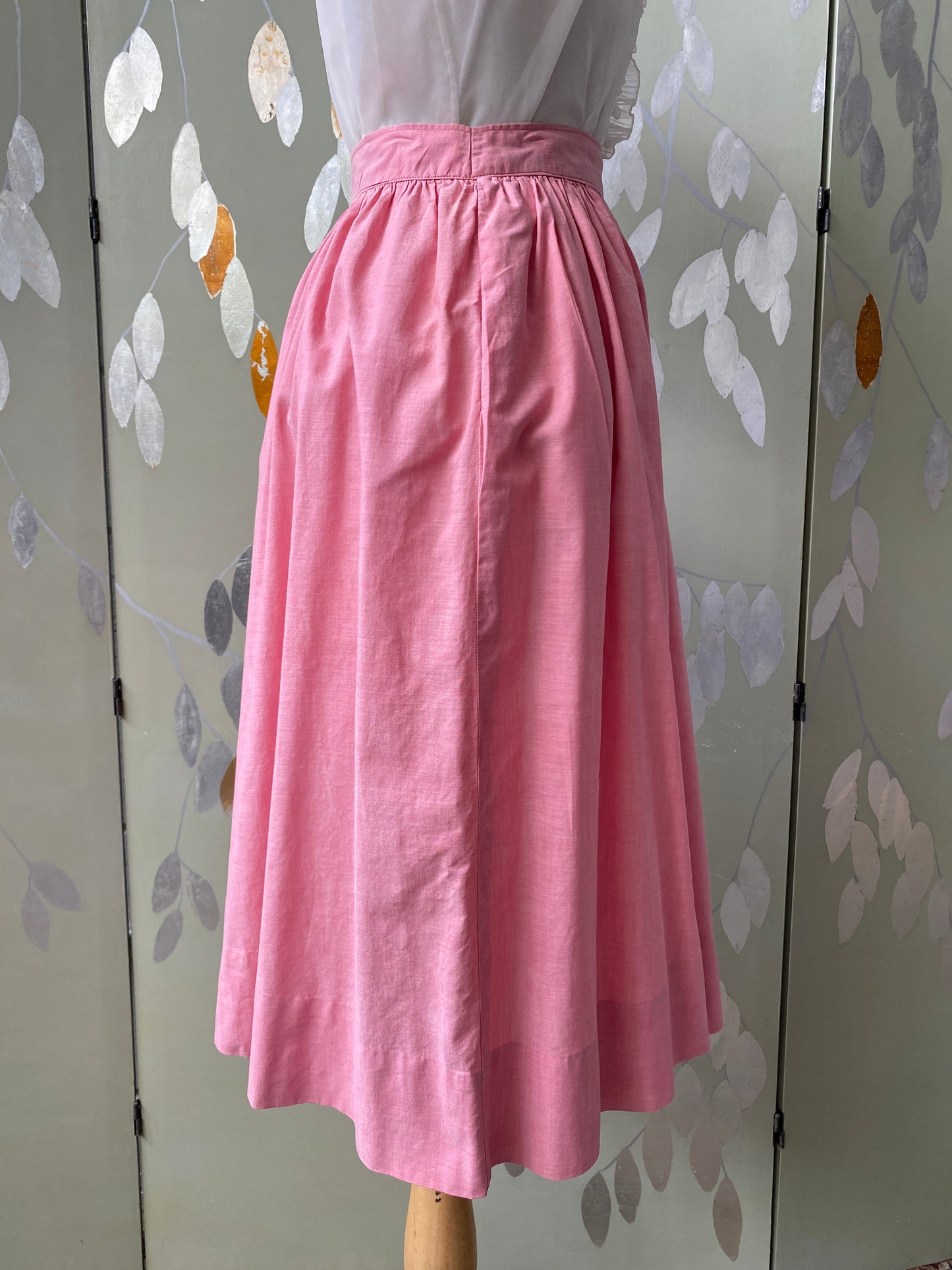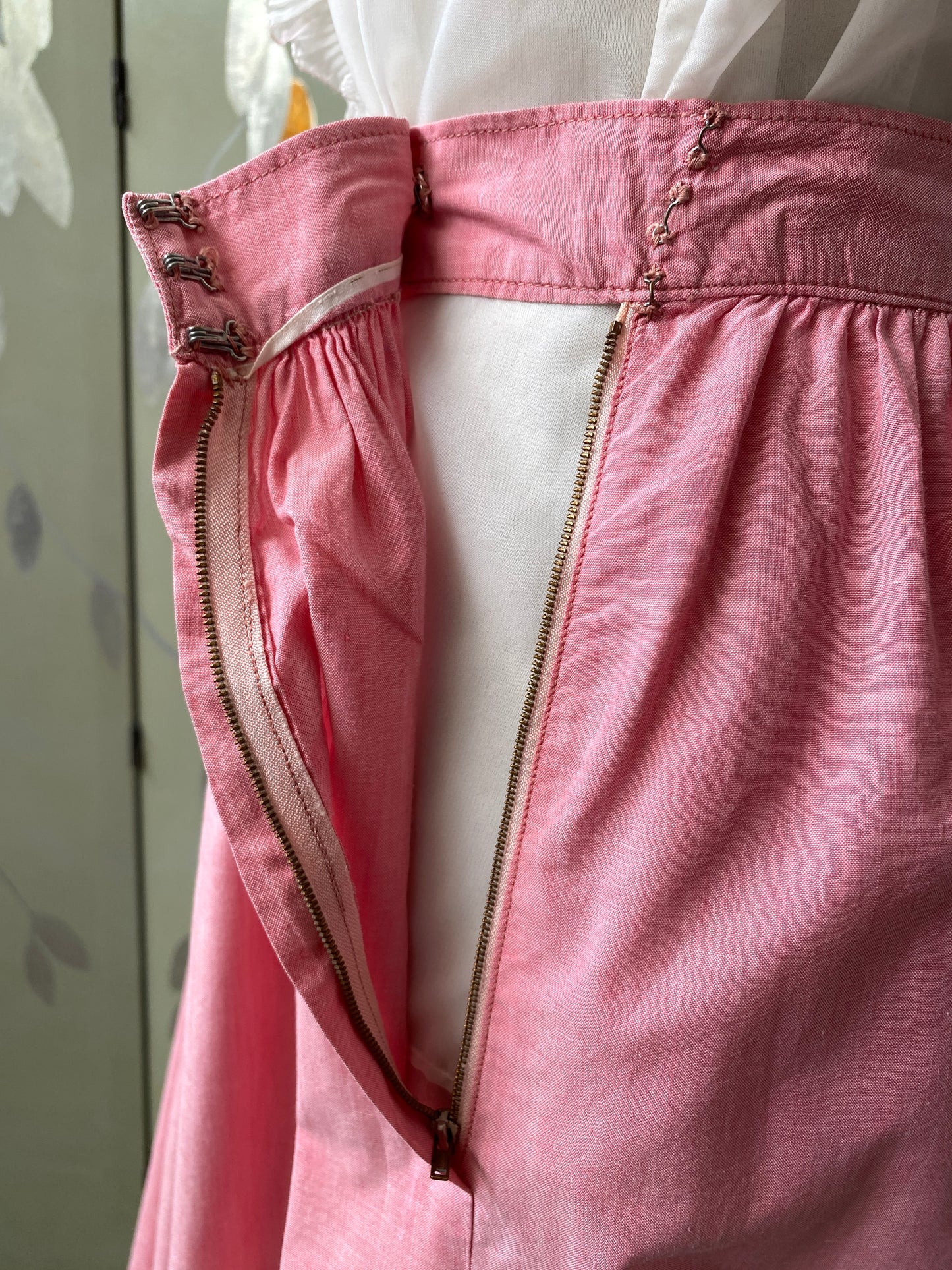 Cute pink cotton full skirt with a gathered waist and a side pocket. Closes at the side with a metal lightning zipper and hooks and eyes. Unlined.