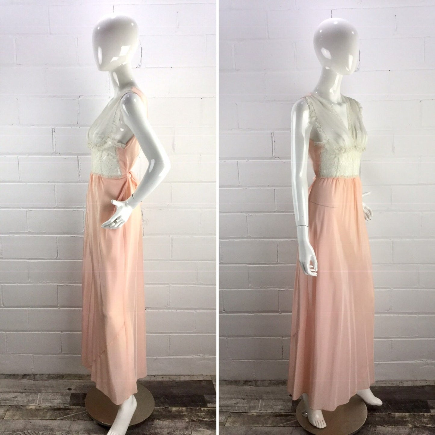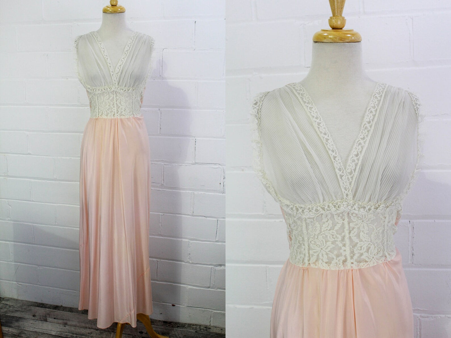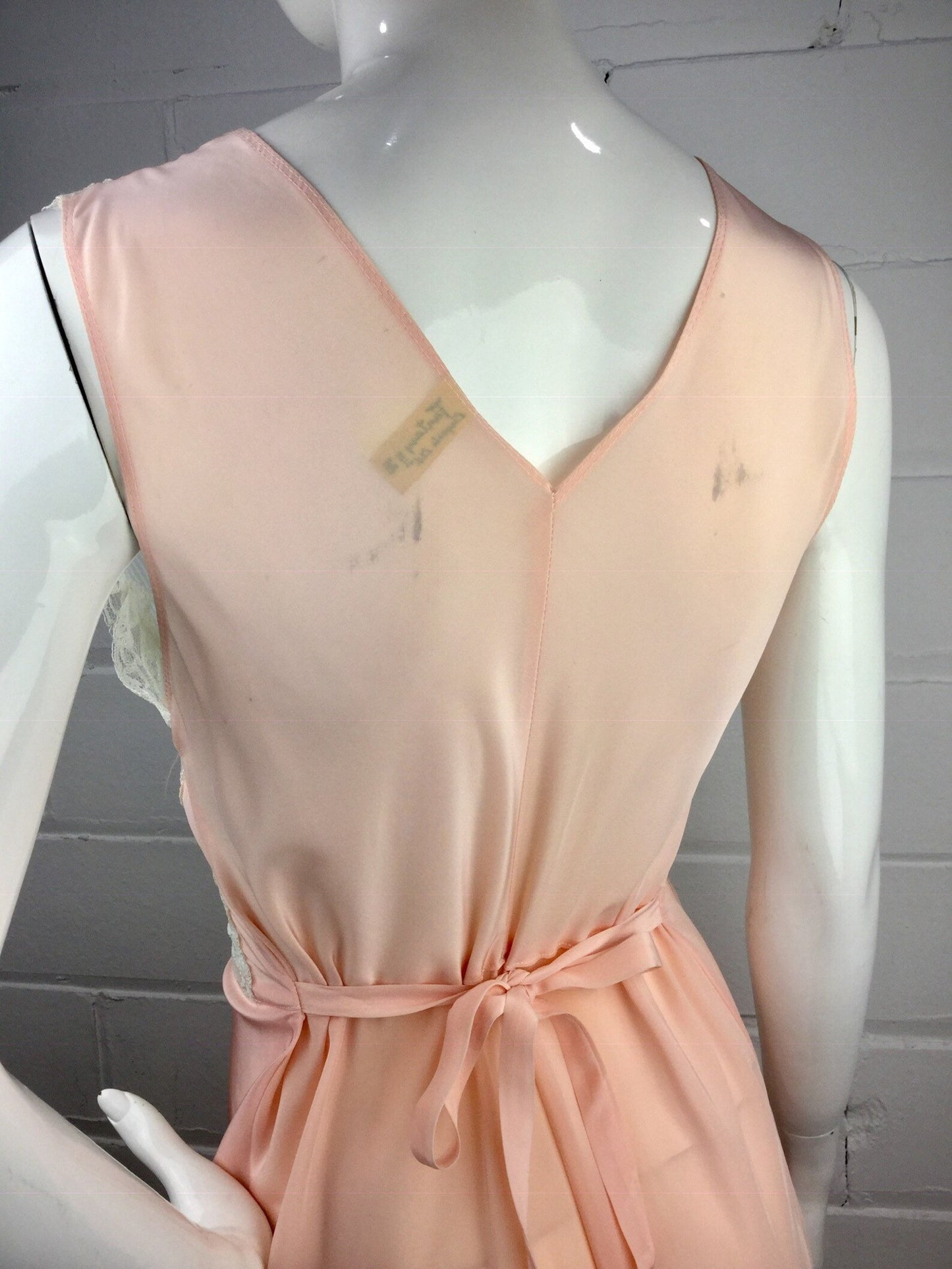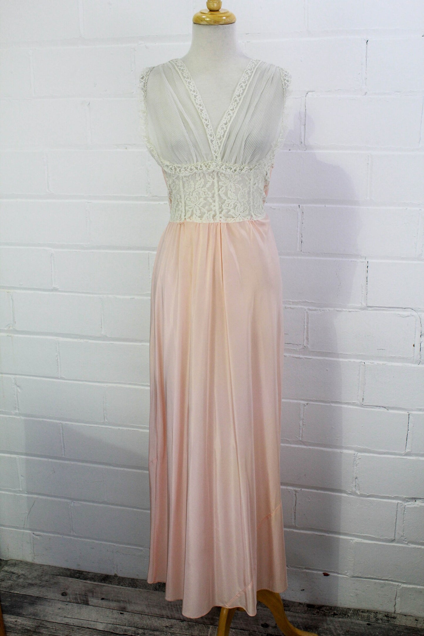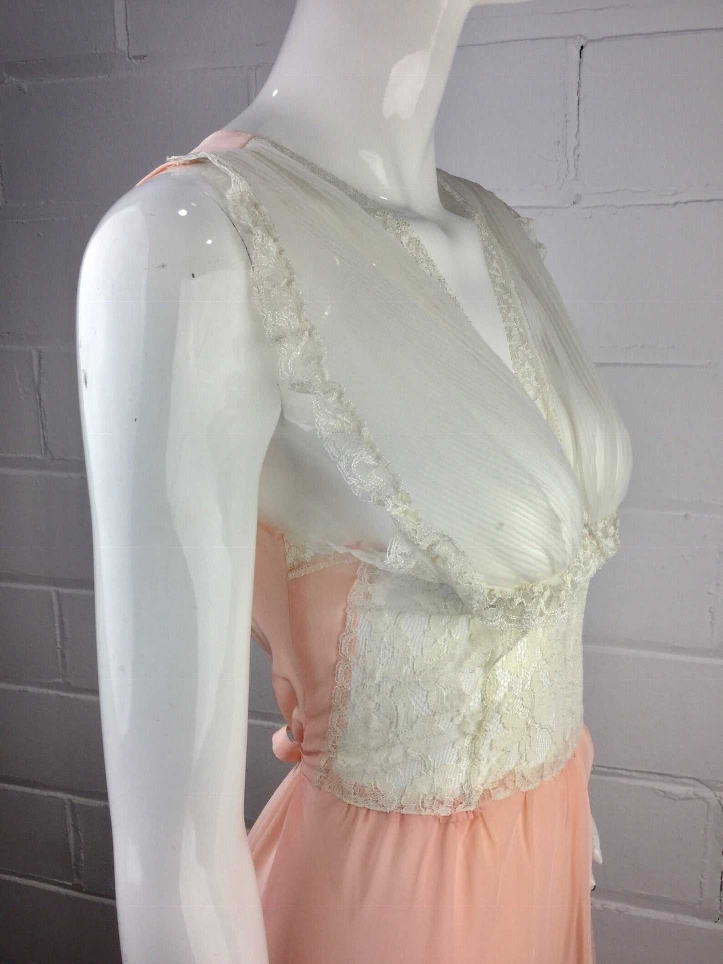 1950s blush pink and white lace night dress. The front bodice is sheer, with a lace waist panel and sheer chiffon bust, trimmed in lace. It ties in the back and has a maxi length.