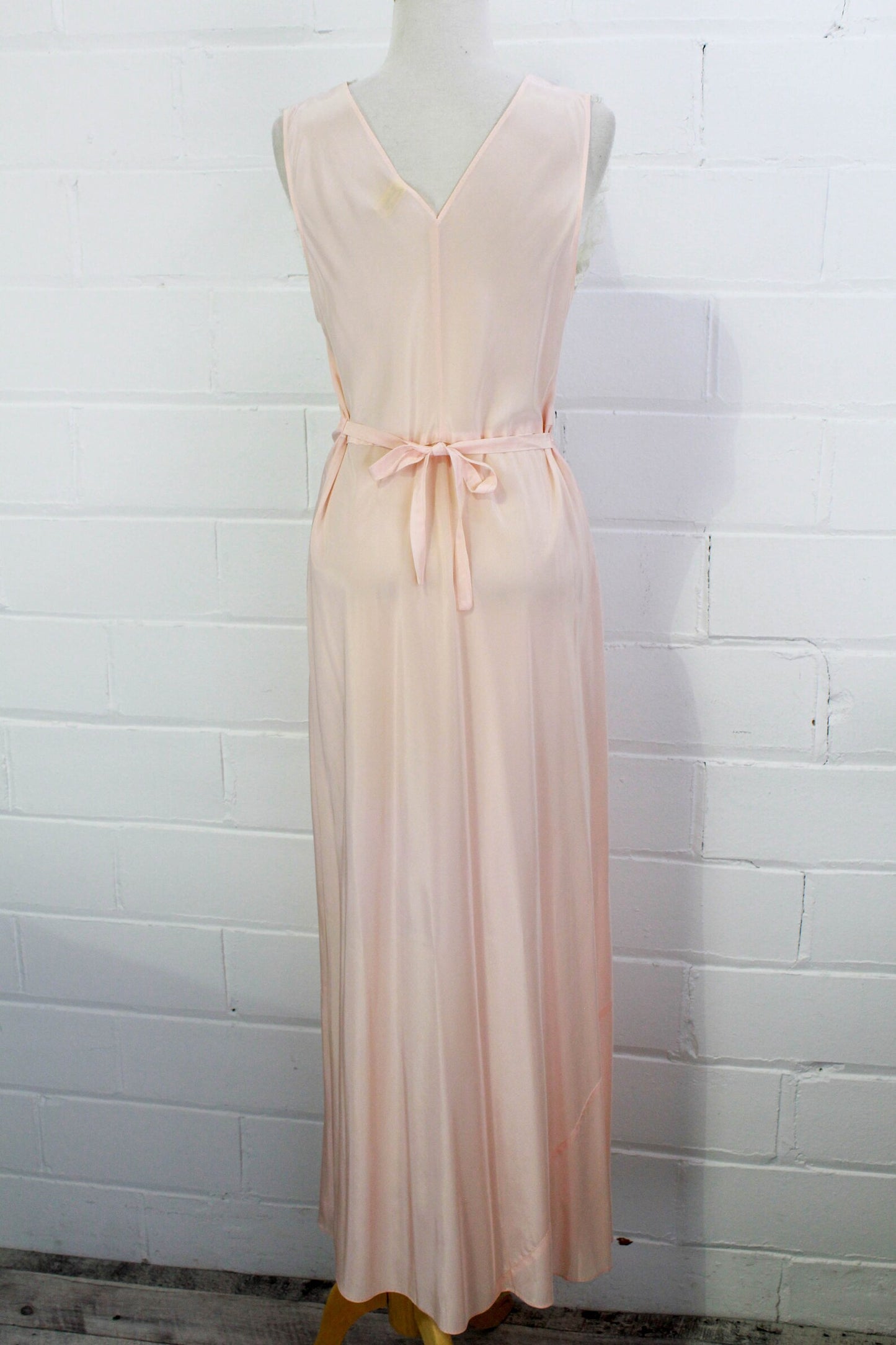Vintage 1950s Pink Nightgown with Sheer Ribbed Lace Bodice and Self Belt, Small