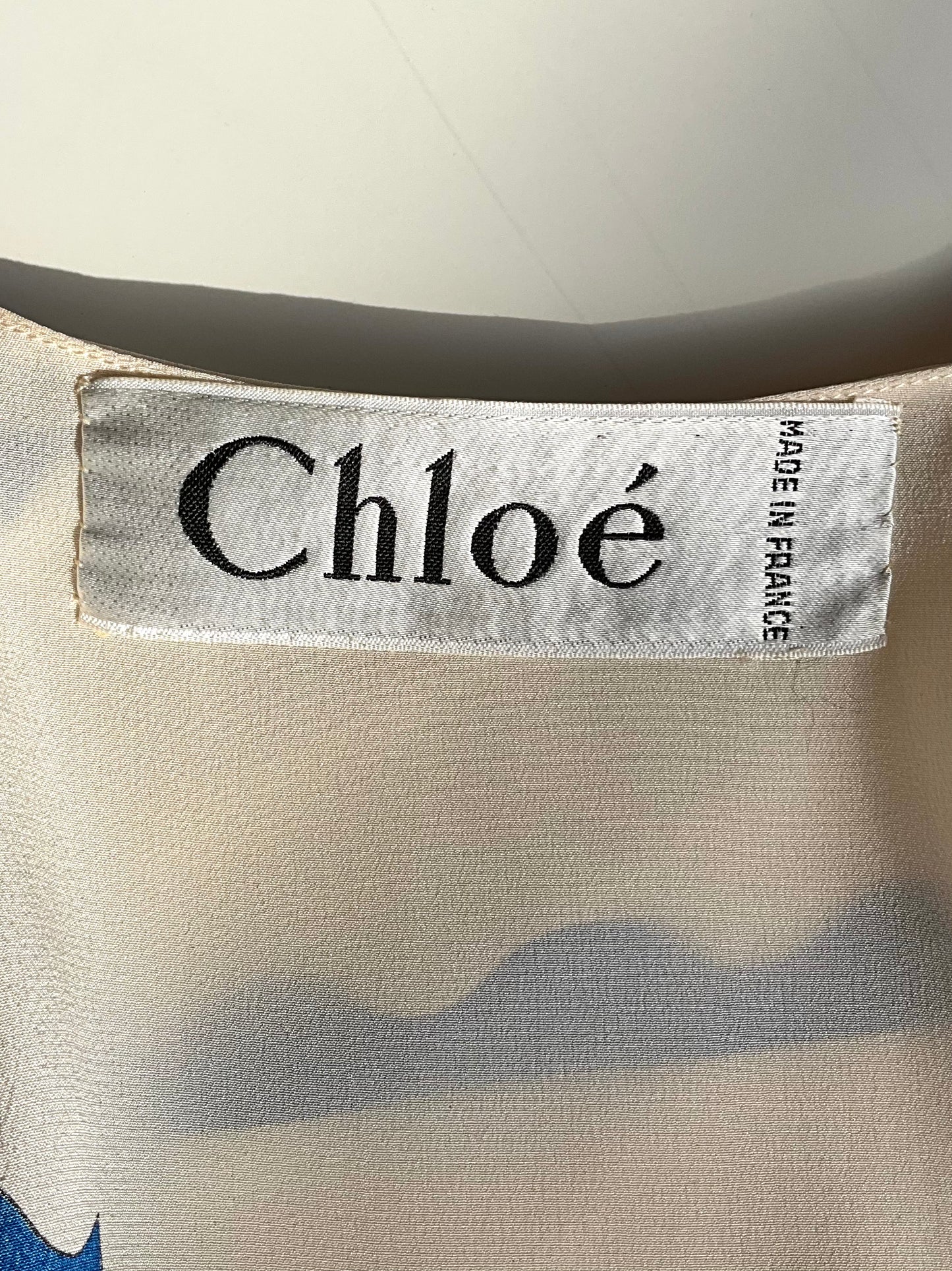 Vintage 1980s Chloe Ivory and Blue Printed Silk Blouson Wrap Dress, Small
