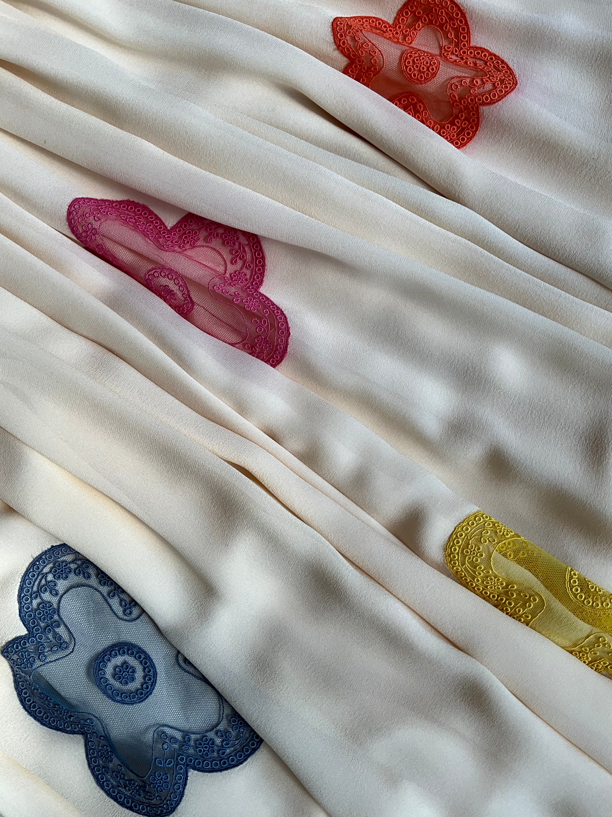 Vintage 1980s Chloe Ivory Silk Chiffon Dress with Colourful Floral Crochet Inserts, Small