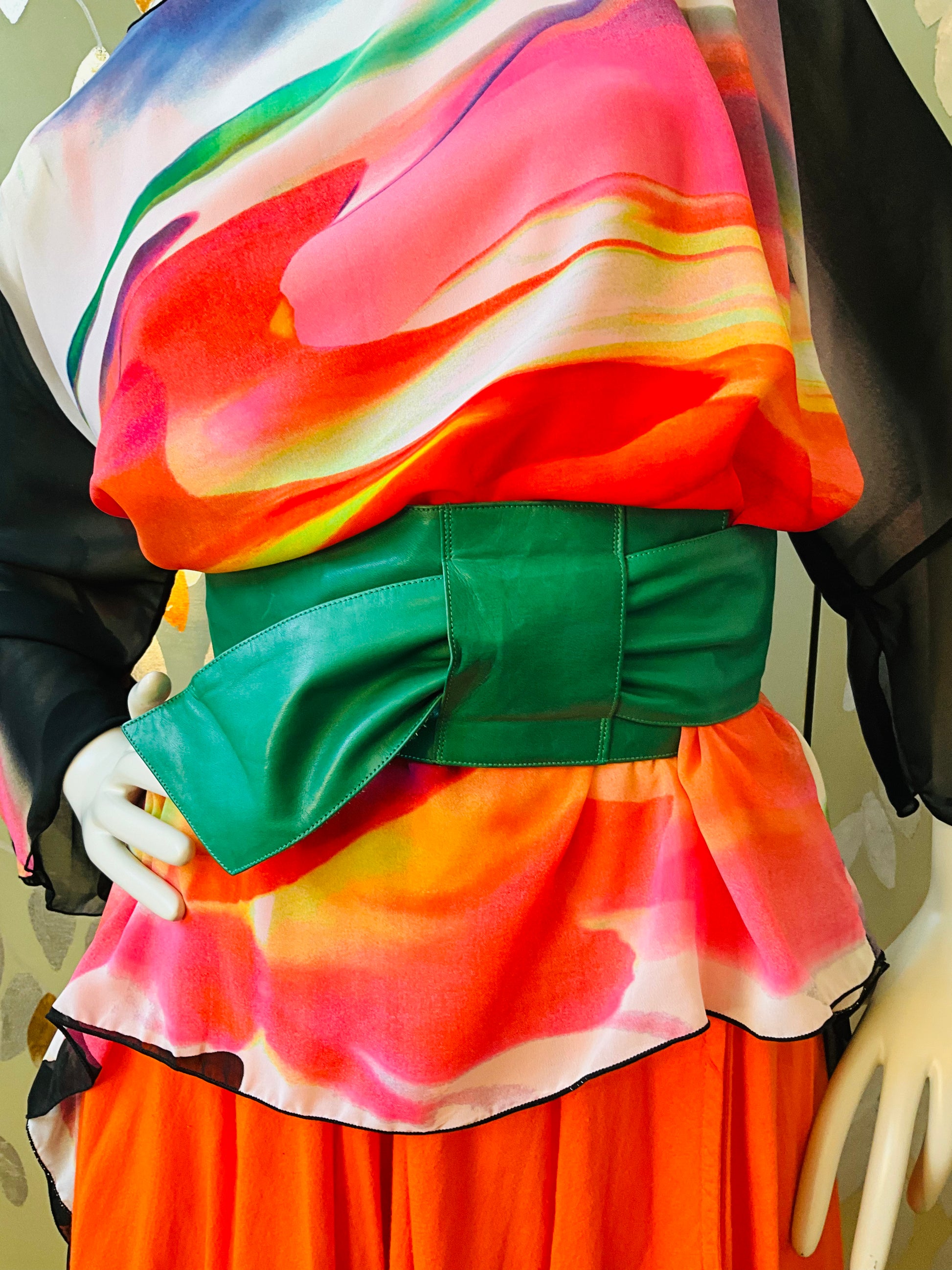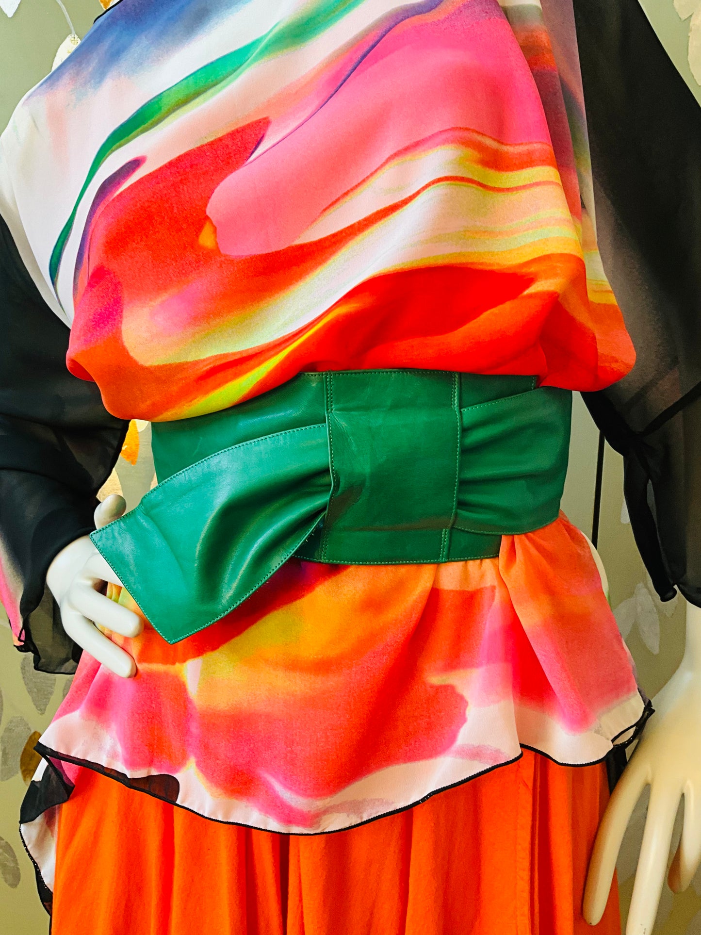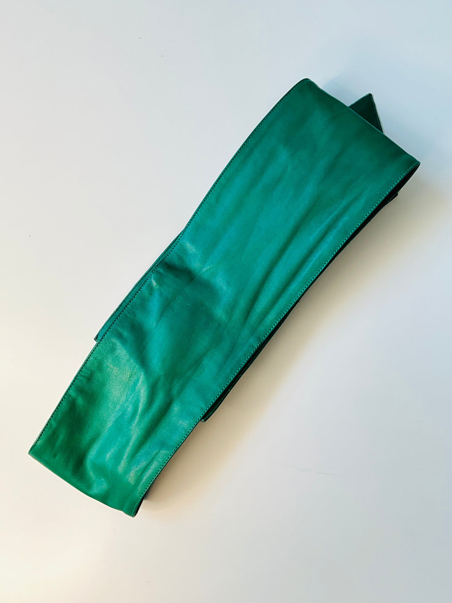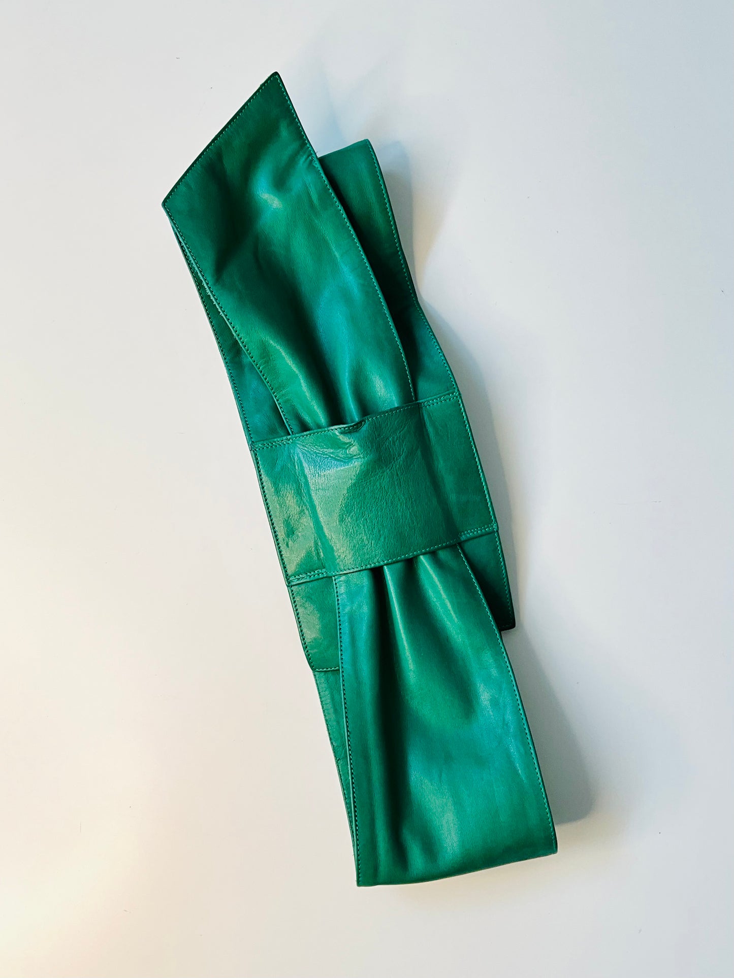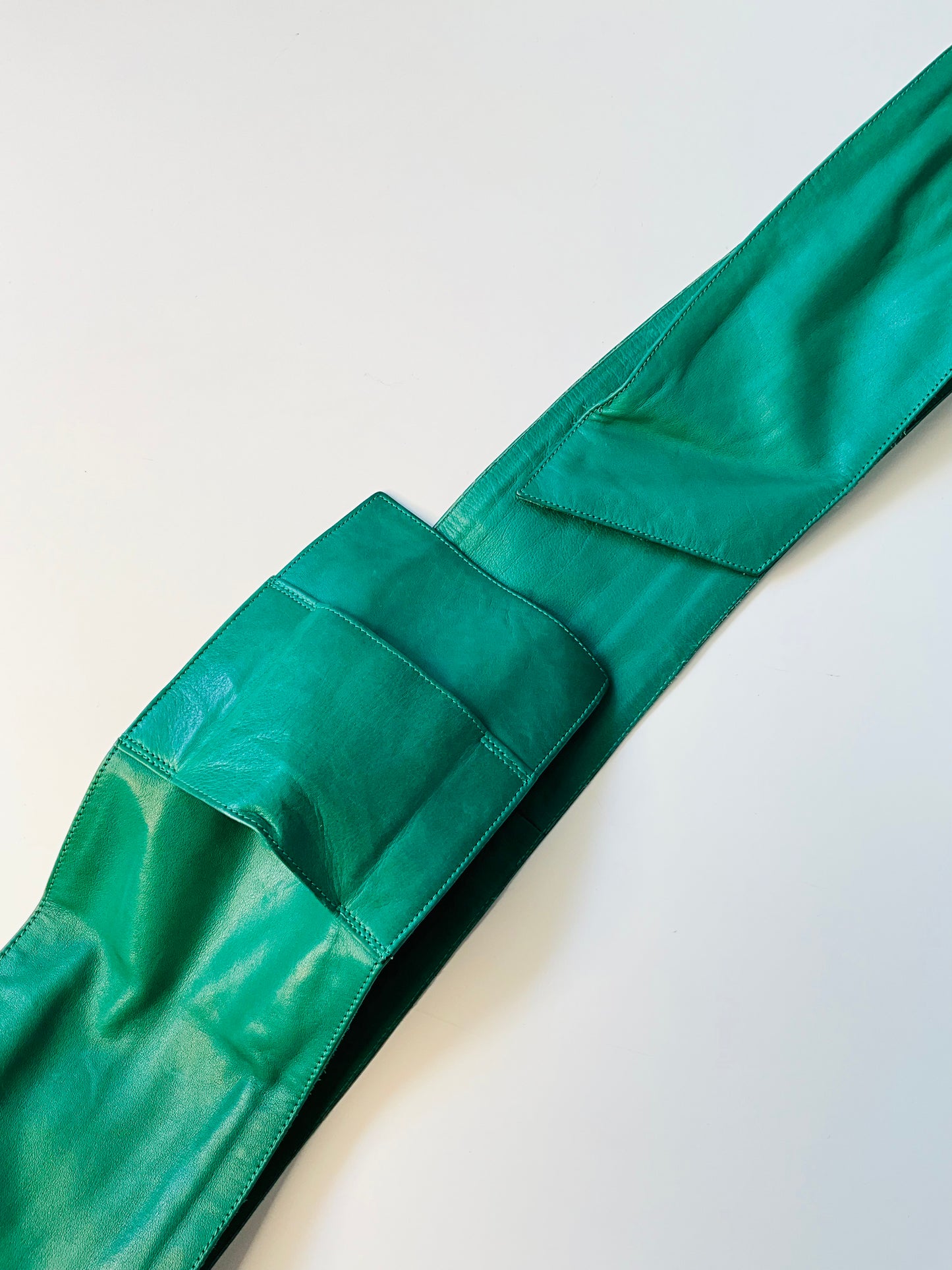 Soft leather waist cinch belt that loops through a panel at the front and fastens with snaps.