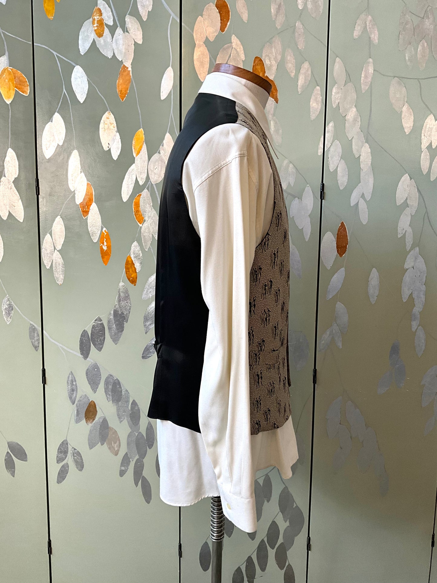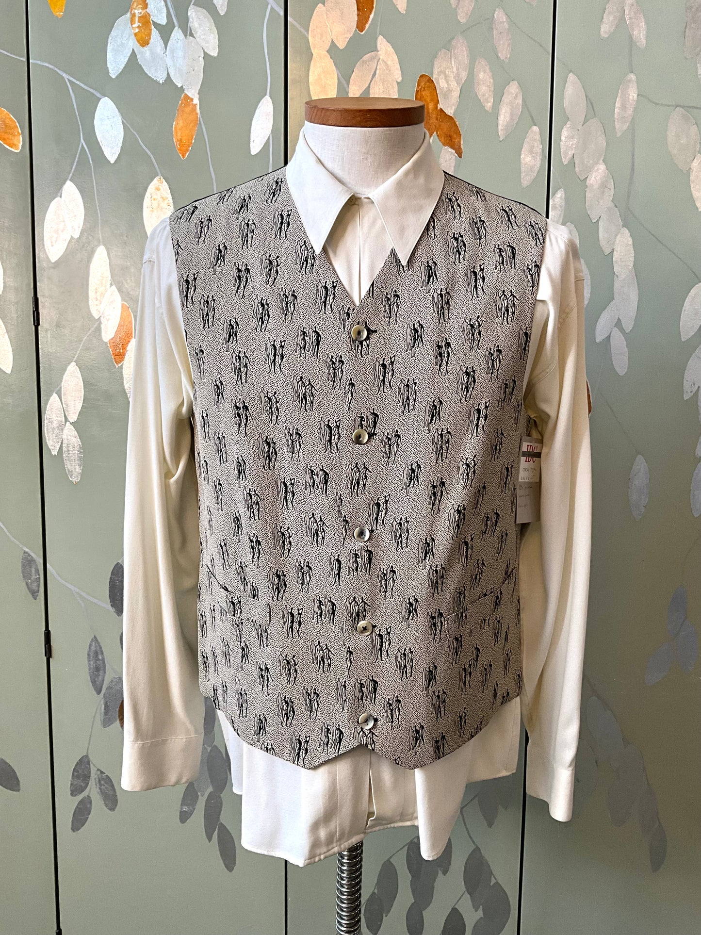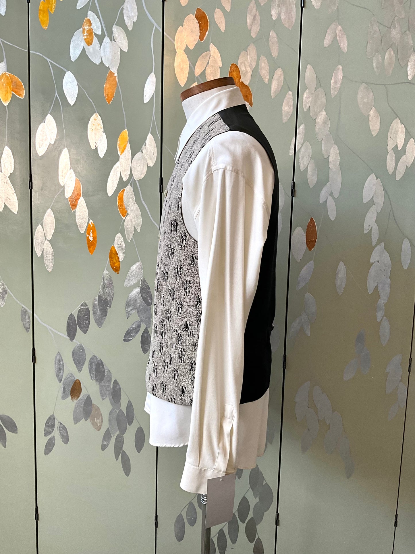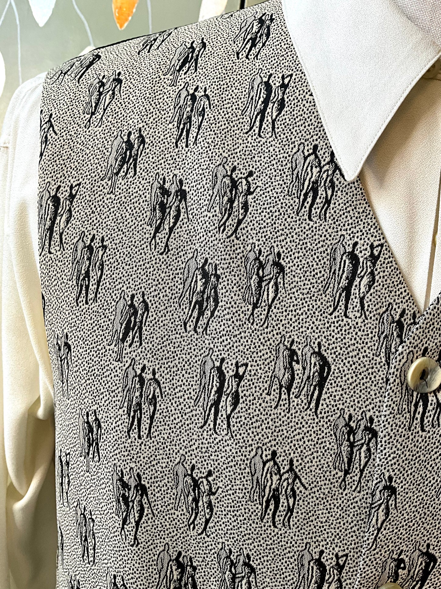 Men's rayon waistcoat and shirt from Parisian label Ambrozzio. The waistcoat features a  repeating pattern in the weave depicting sets of 3 or 4 silhouettes of people. It has a black lining and back with a buckle at rear. The long sleeve button-up shirt is a cream colour with a pointed collar and a covered button placket.