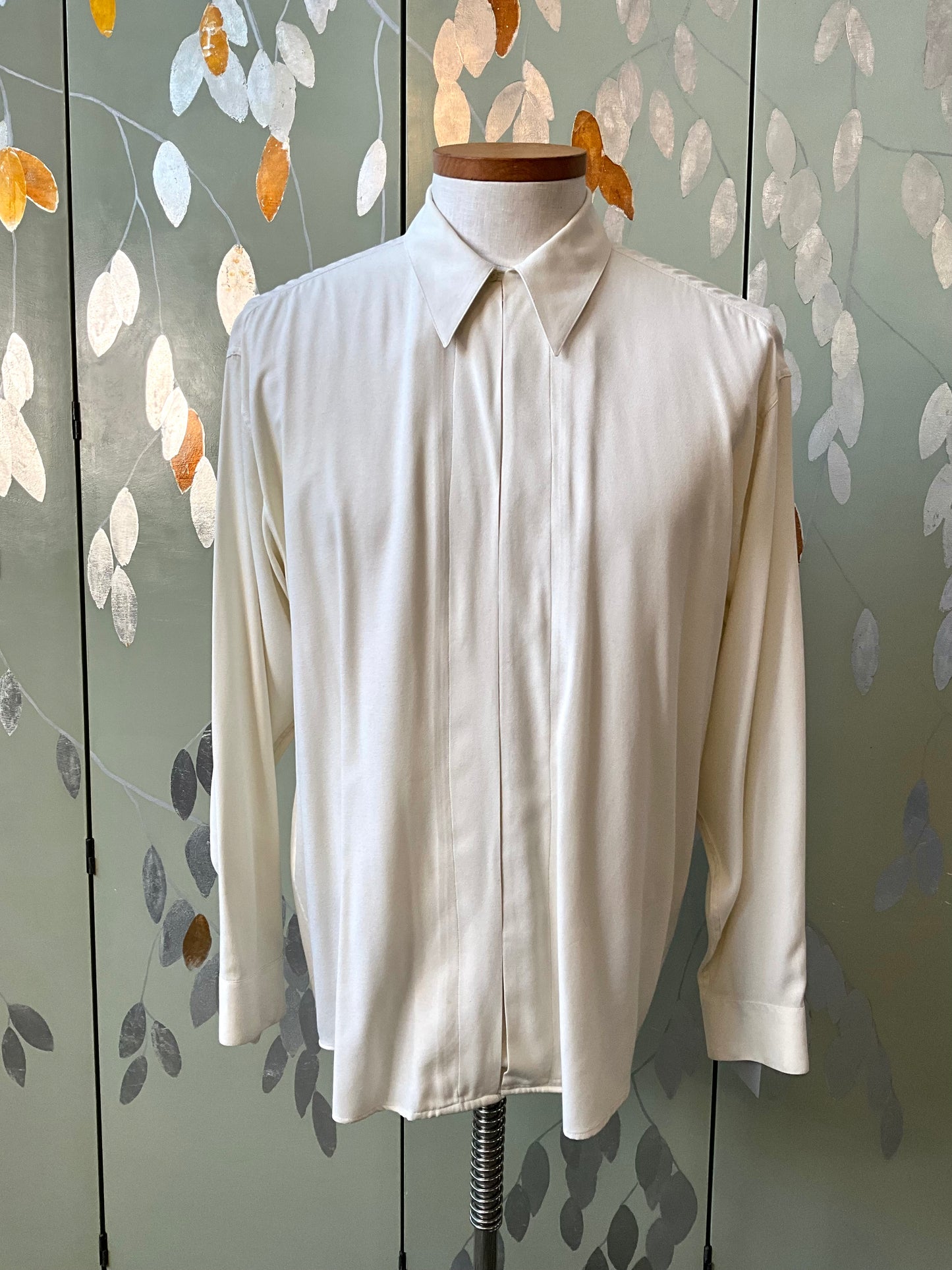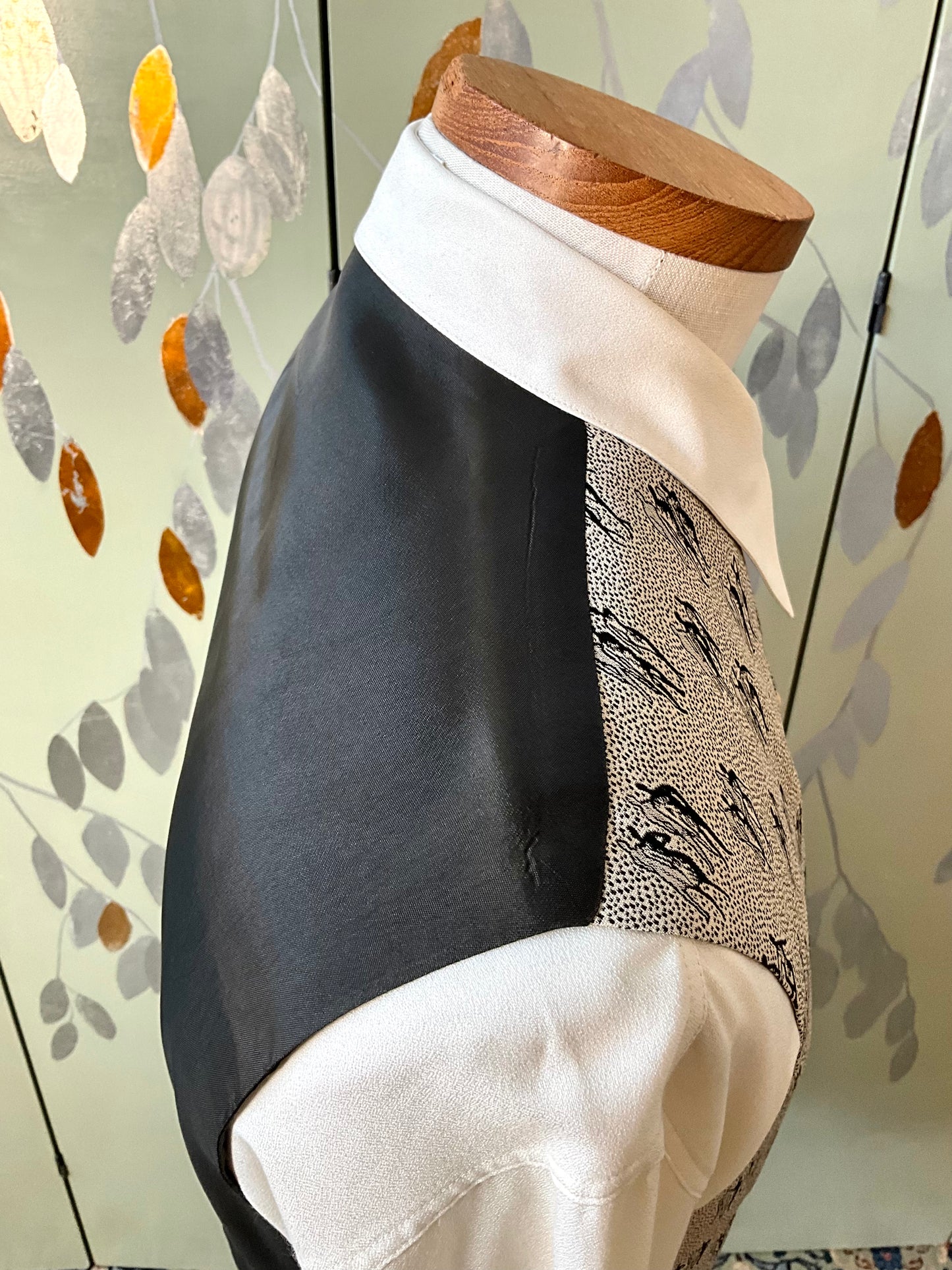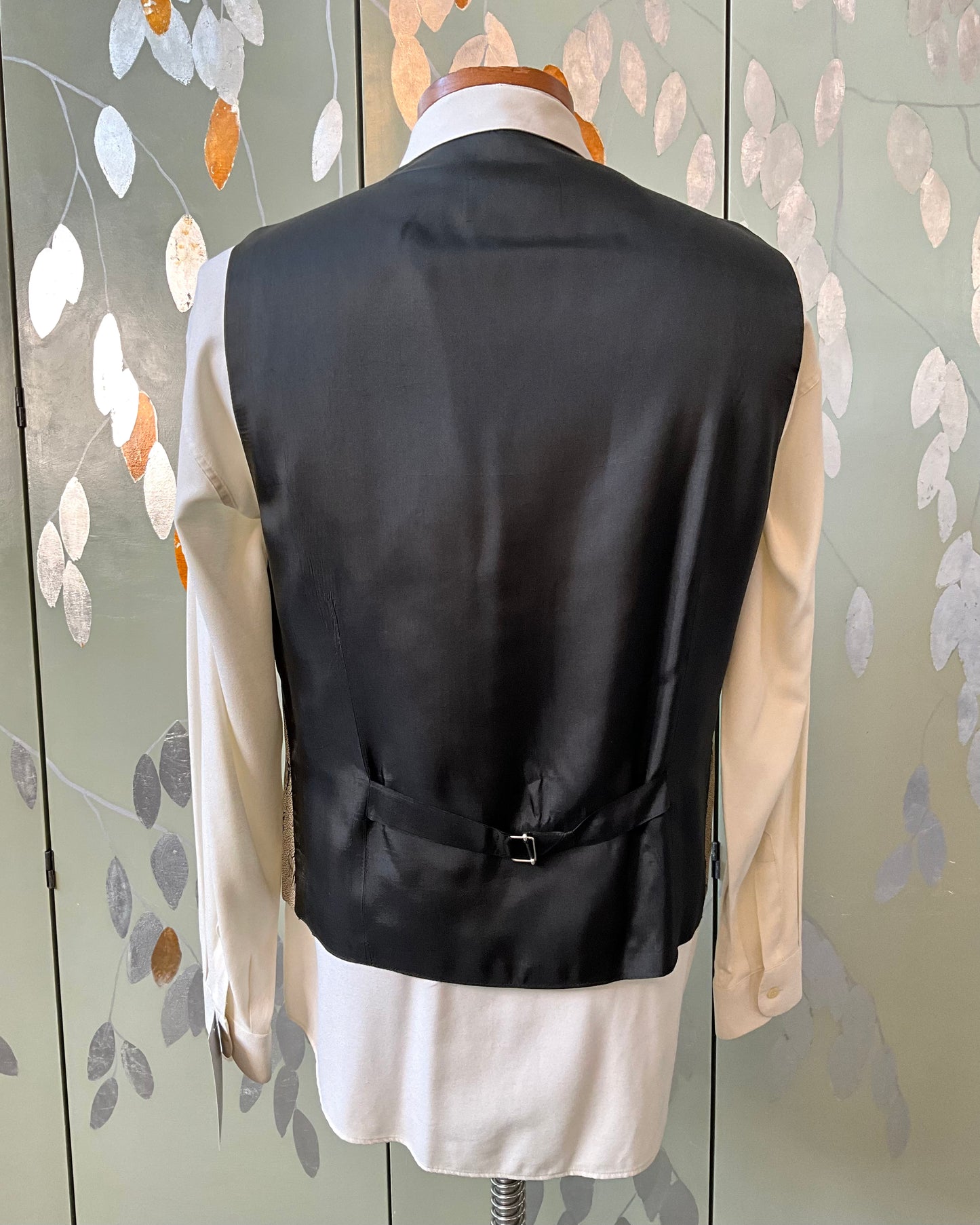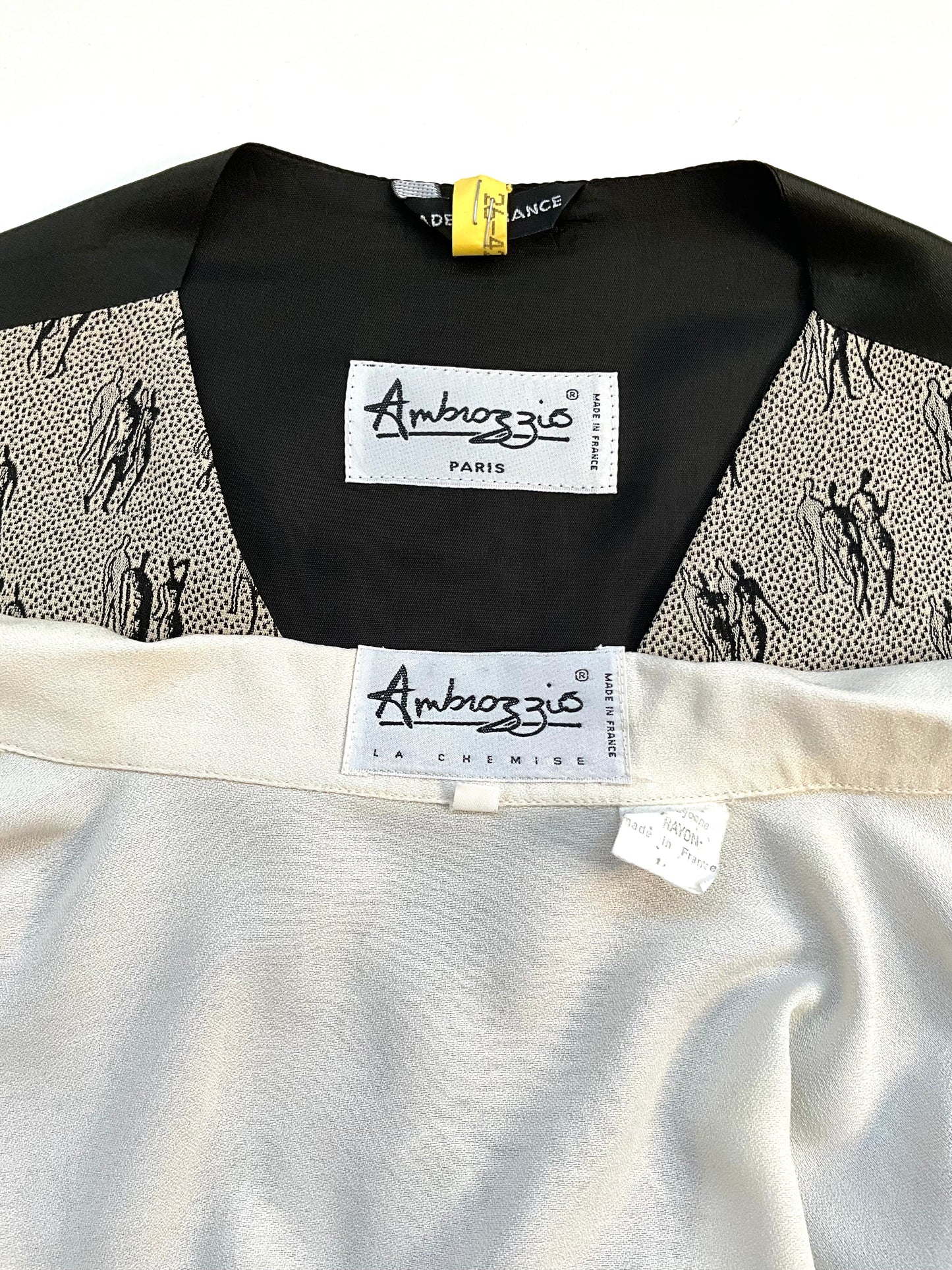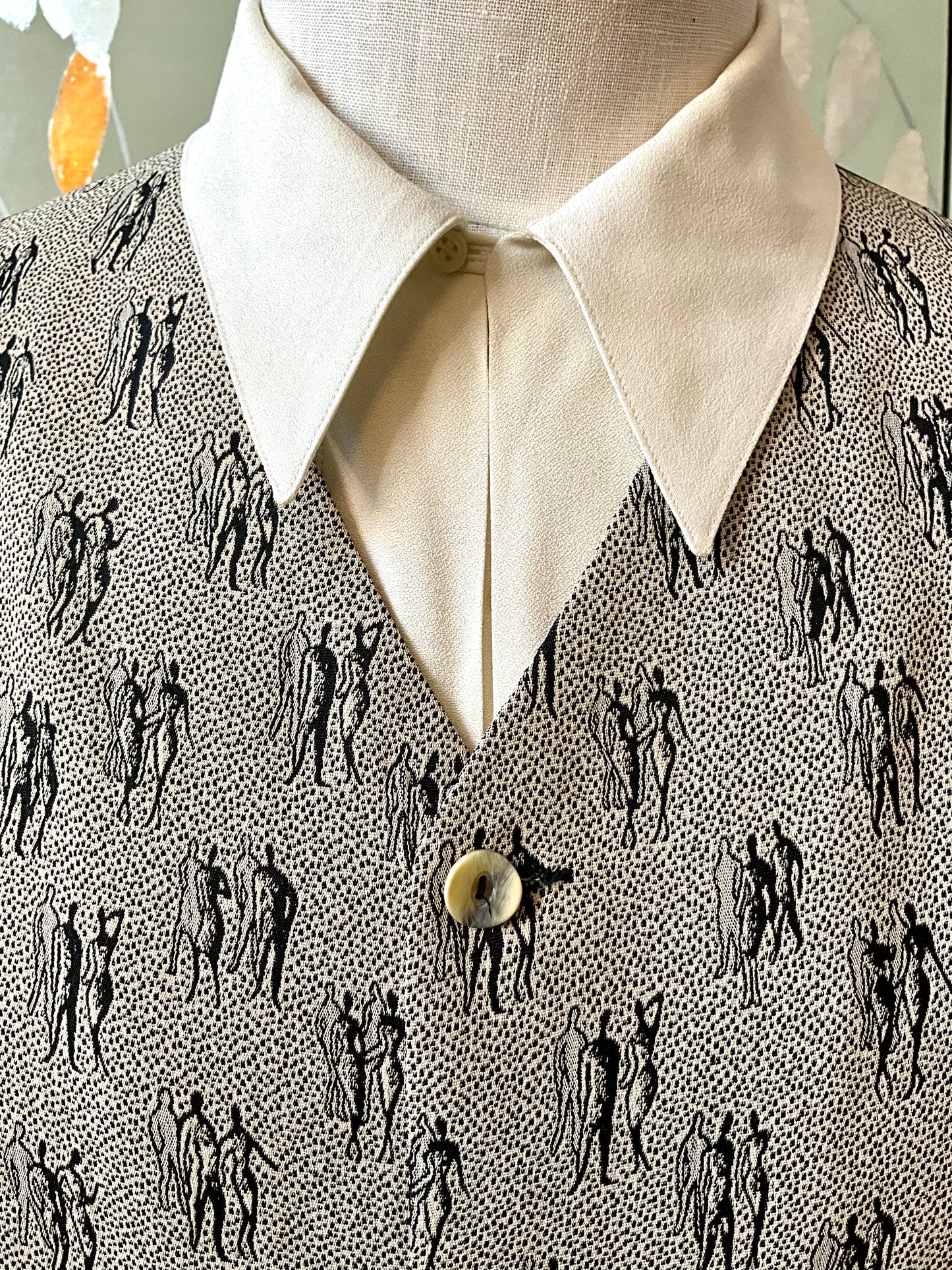 Men's rayon waistcoat and shirt from Parisian label Ambrozzio. The waistcoat features a  repeating pattern in the weave depicting sets of 3 or 4 silhouettes of people. It has a black lining and back with a buckle at rear. The long sleeve button-up shirt is a cream colour with a pointed collar and a covered button placket.