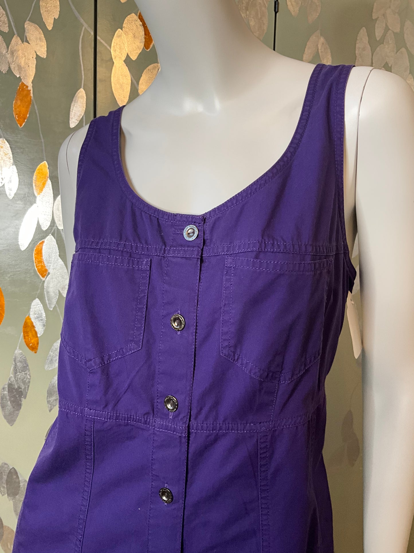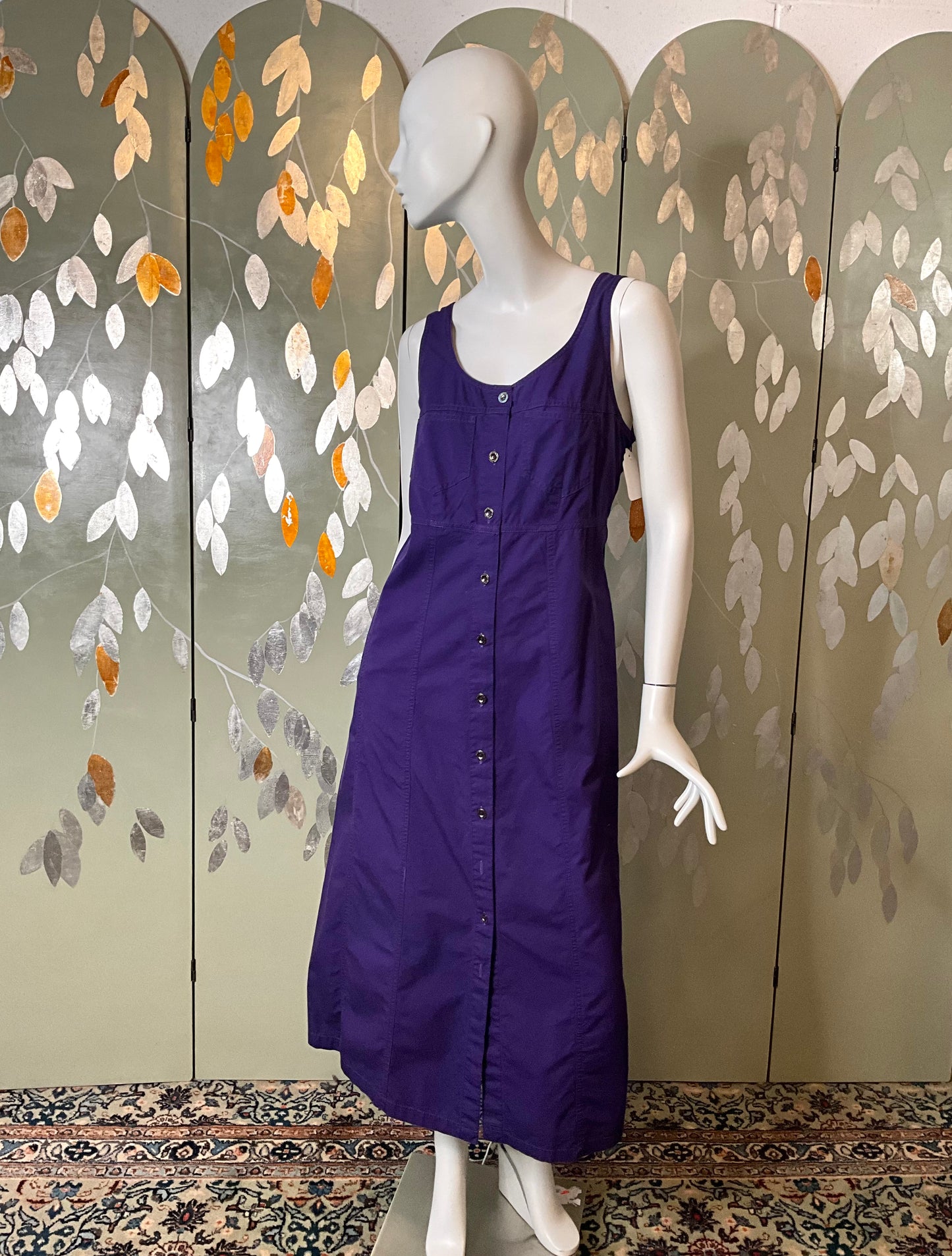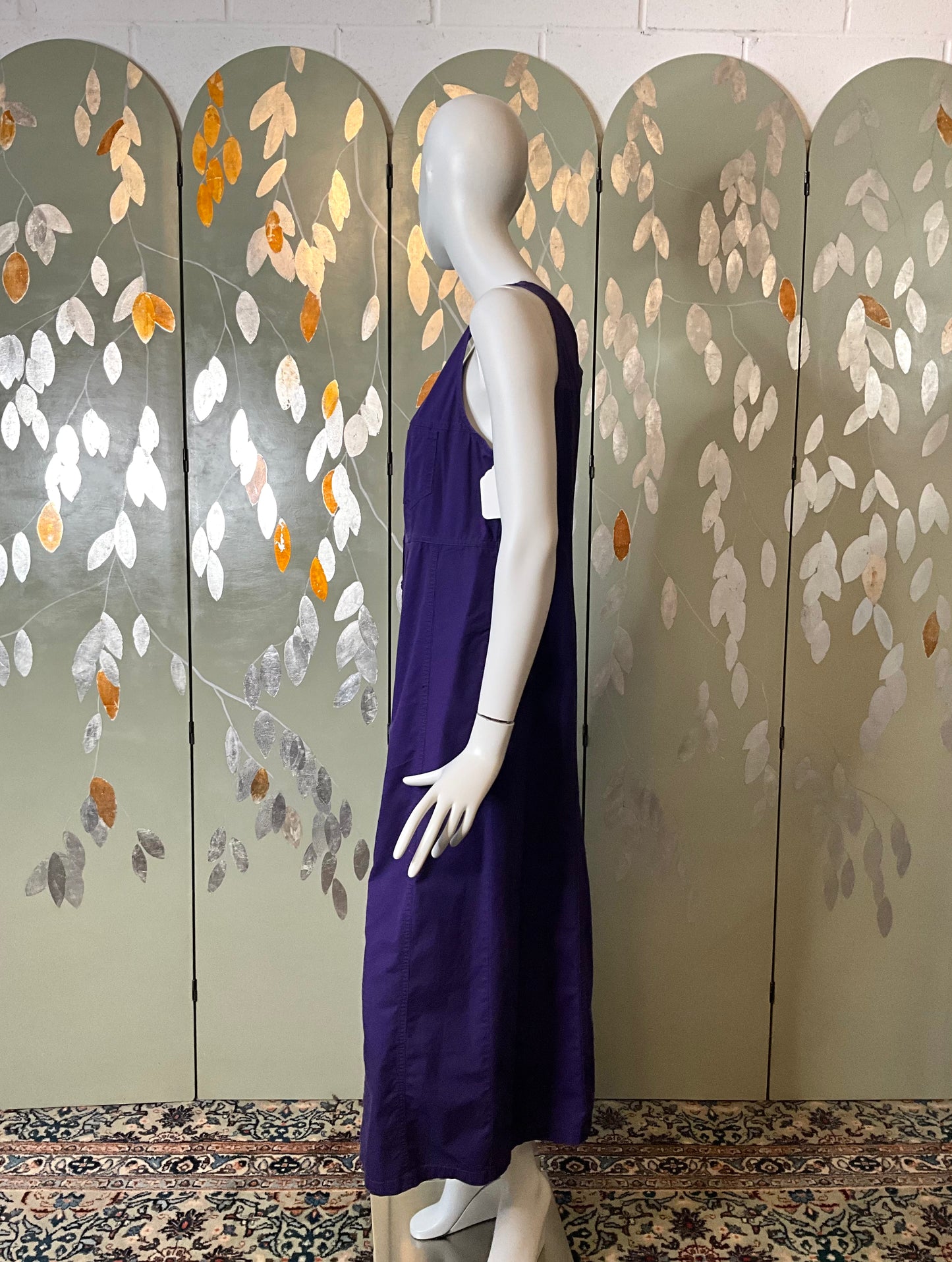 90s cute and practical purple cotton sleeveless button-up cargo shirt dress from Jones of New York. It is an A line shape with jean seams and patch pockets on the bust. It also features a round neckline, side pockets, empire waistline and a maxi length. Unlined.