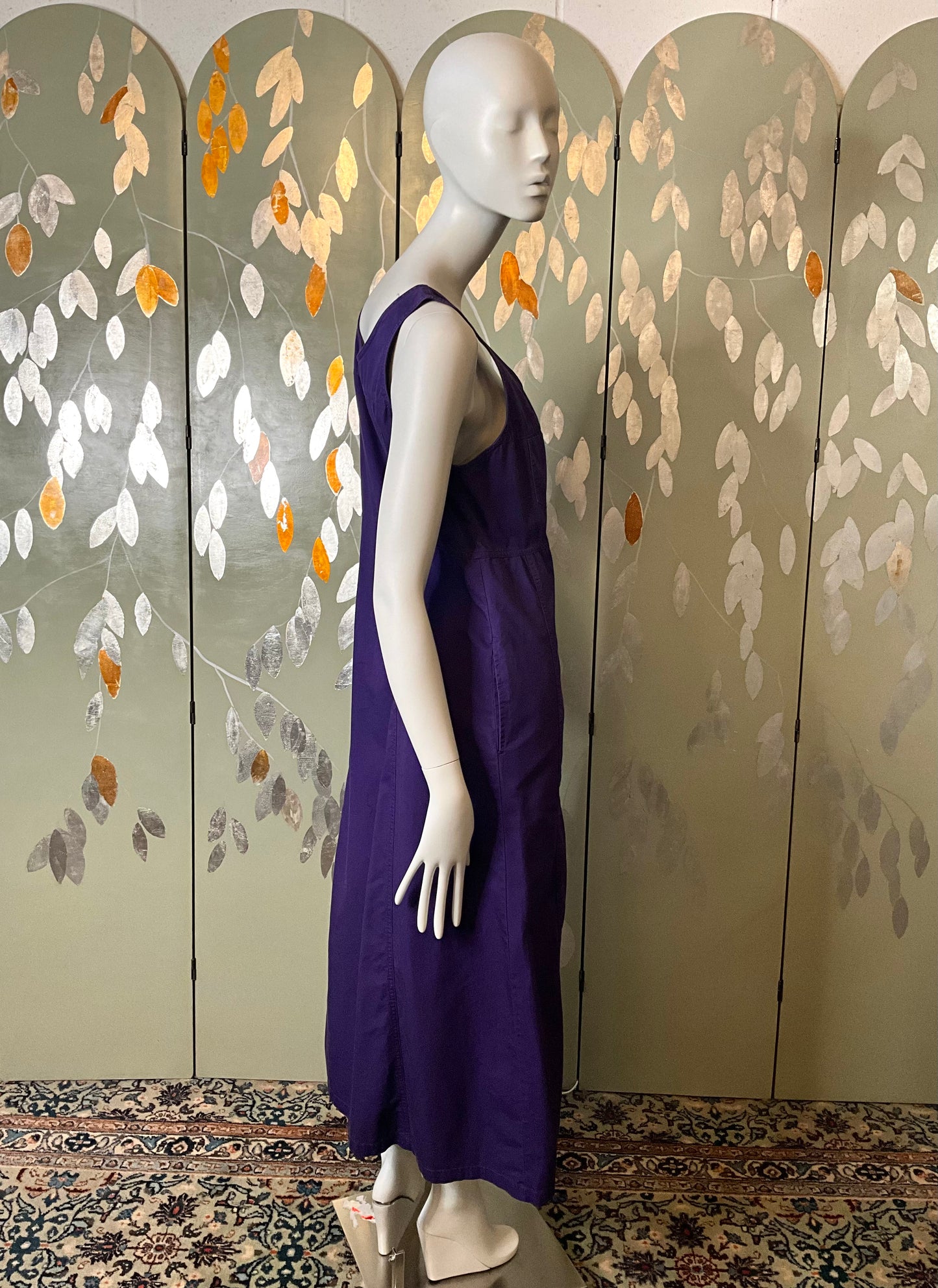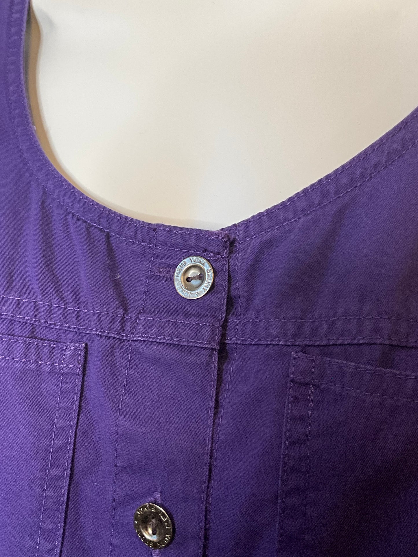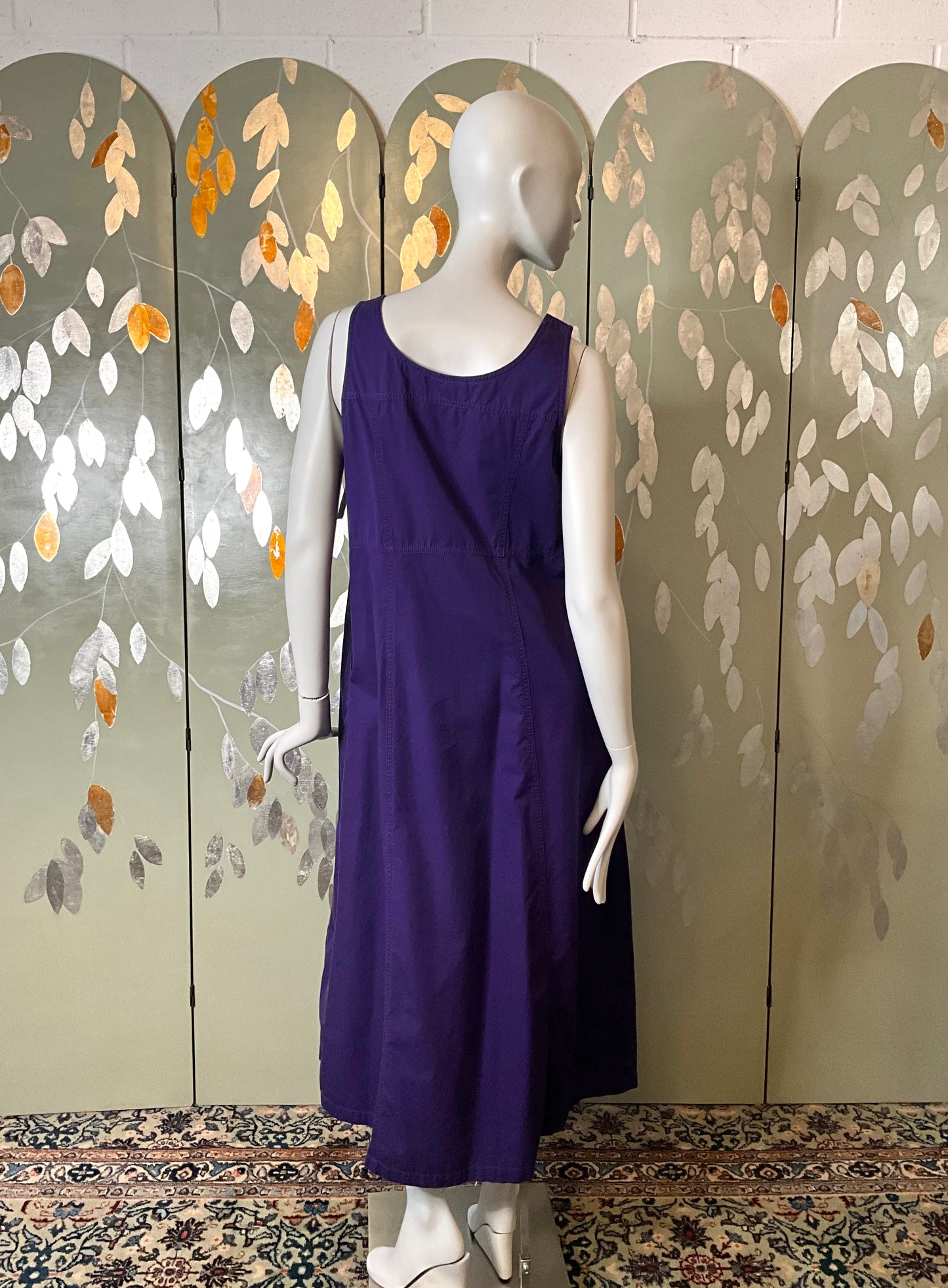 90s cute and practical purple cotton sleeveless button-up cargo shirt dress from Jones of New York. It is an A line shape with jean seams and patch pockets on the bust. It also features a round neckline, side pockets, empire waistline and a maxi length. Unlined.