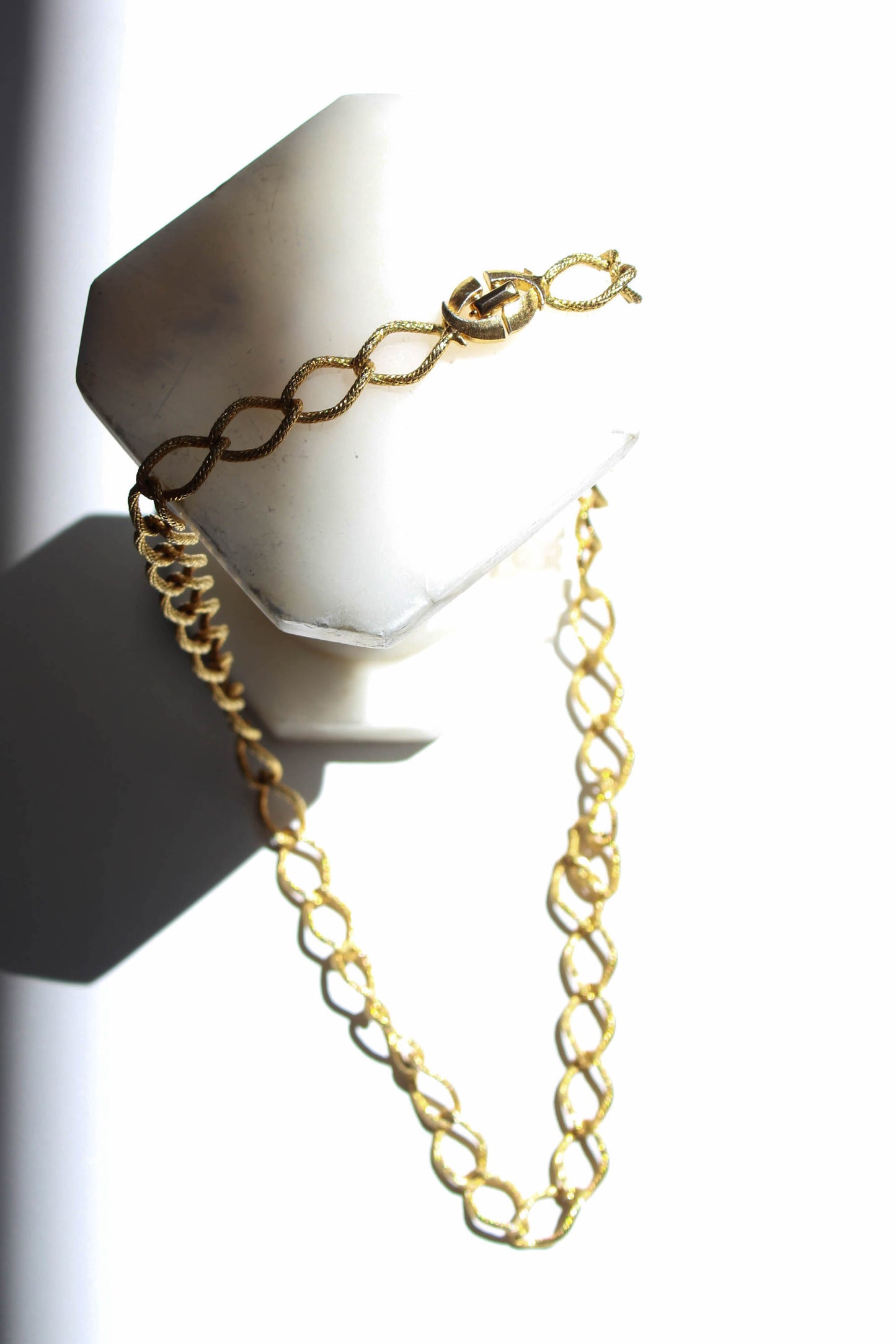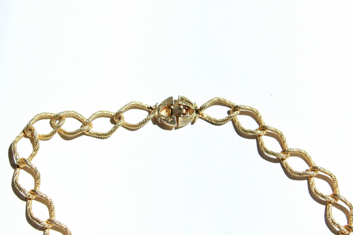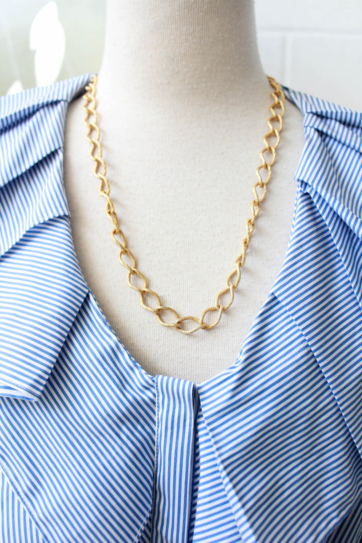 Vintage 1960s Avon gold-tone chainlink necklace. It's simple and chic, and will layer well with other necklaces but stands out on its own. The chainlinks are large and textured, and it closes with a large hinged clasp at the back.
