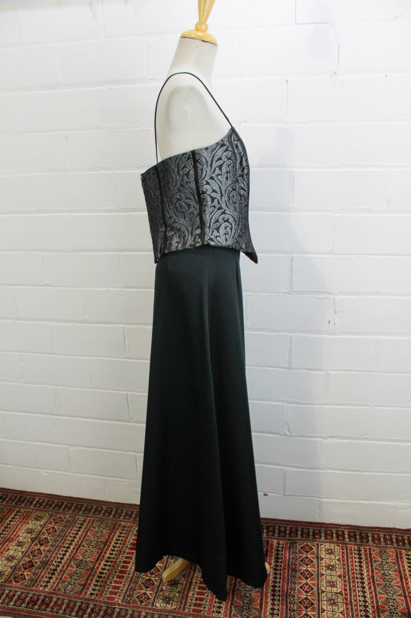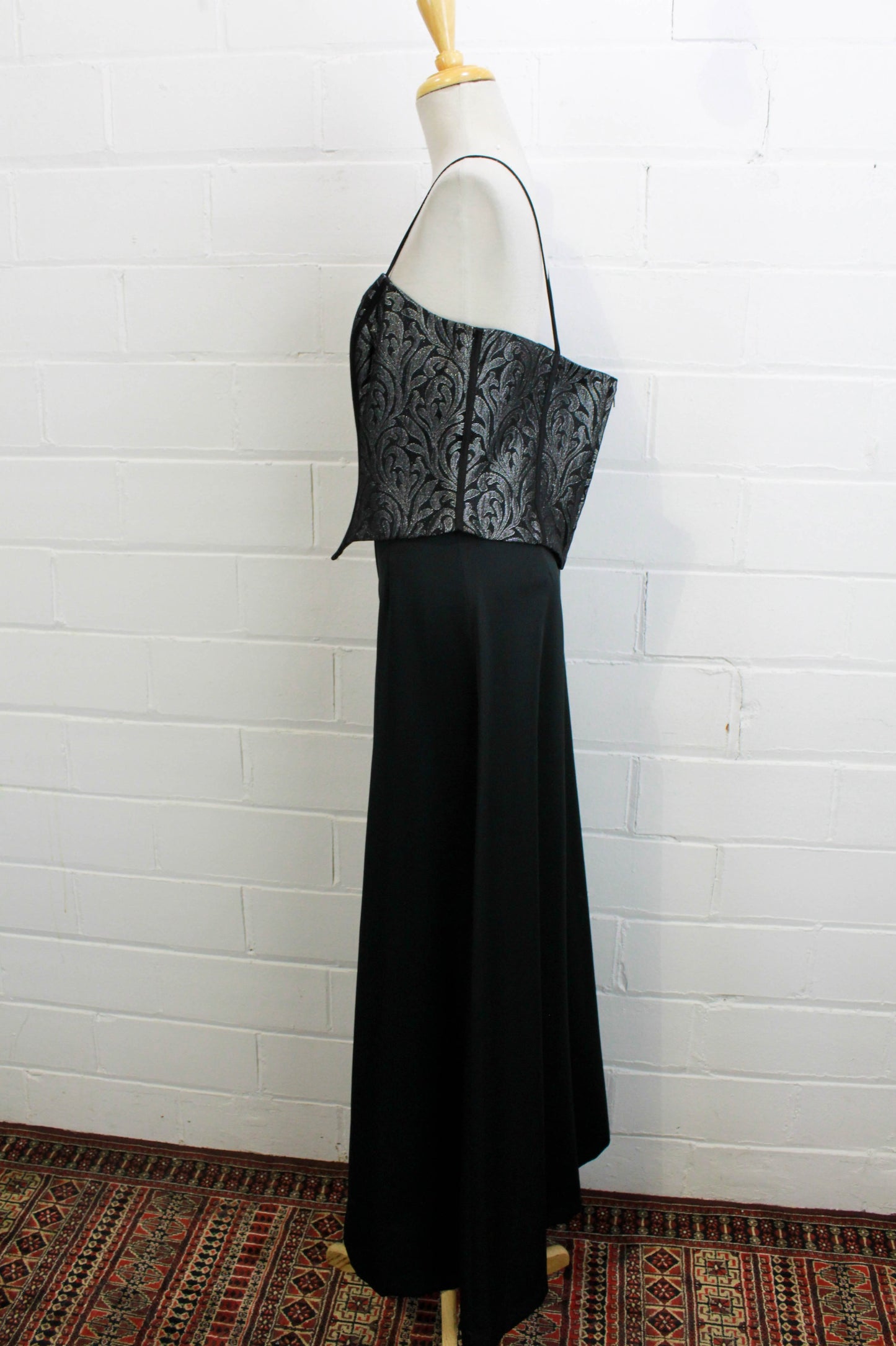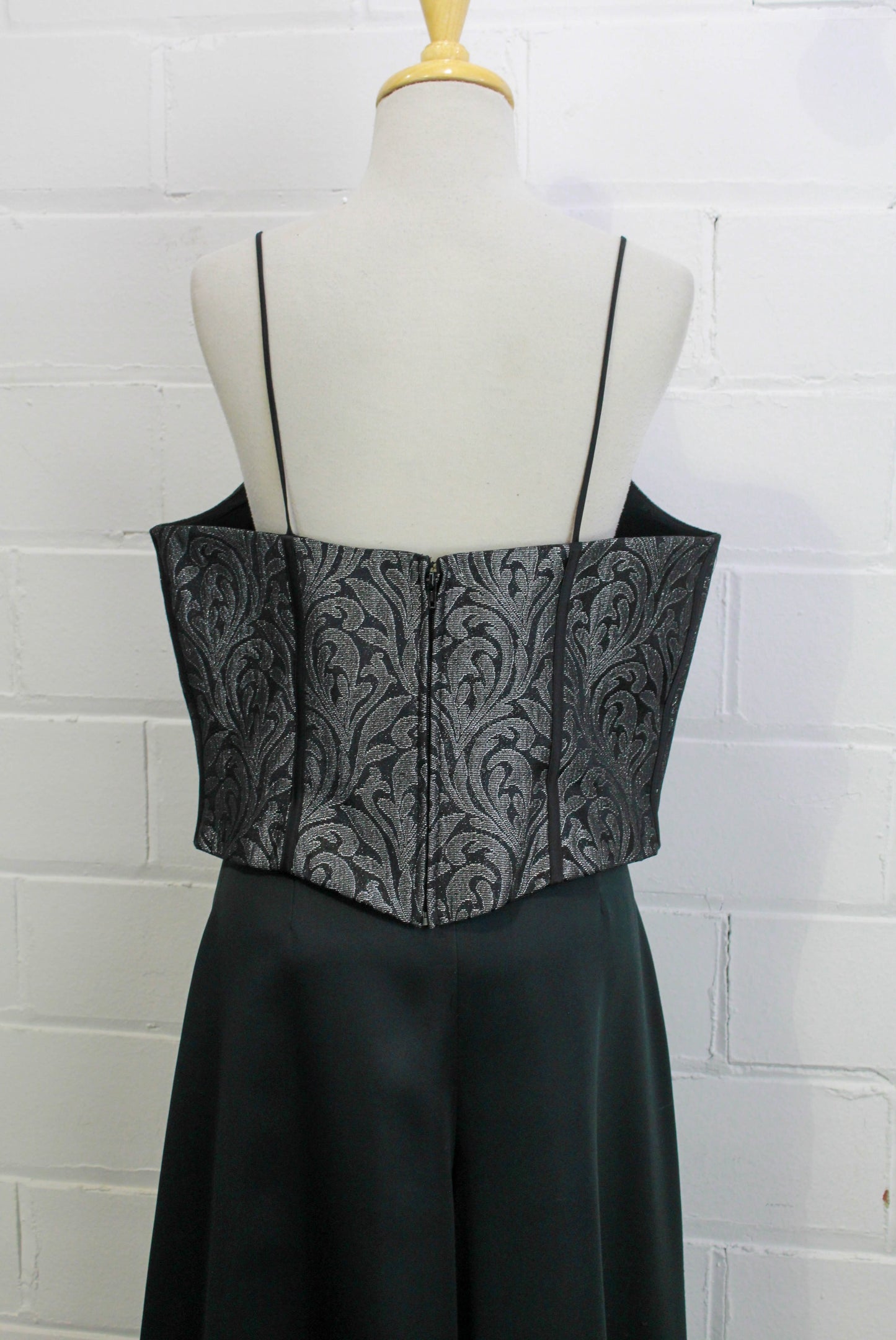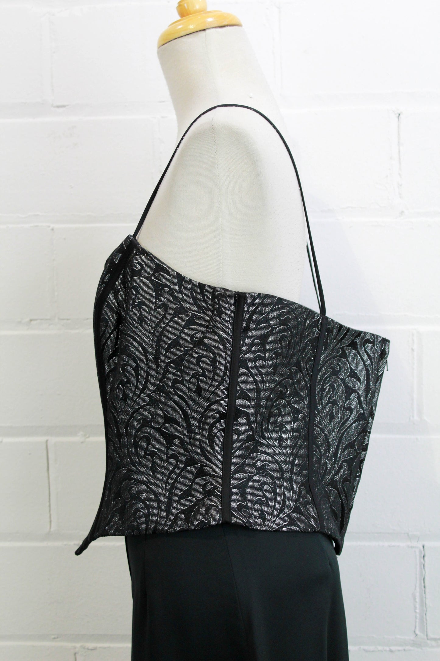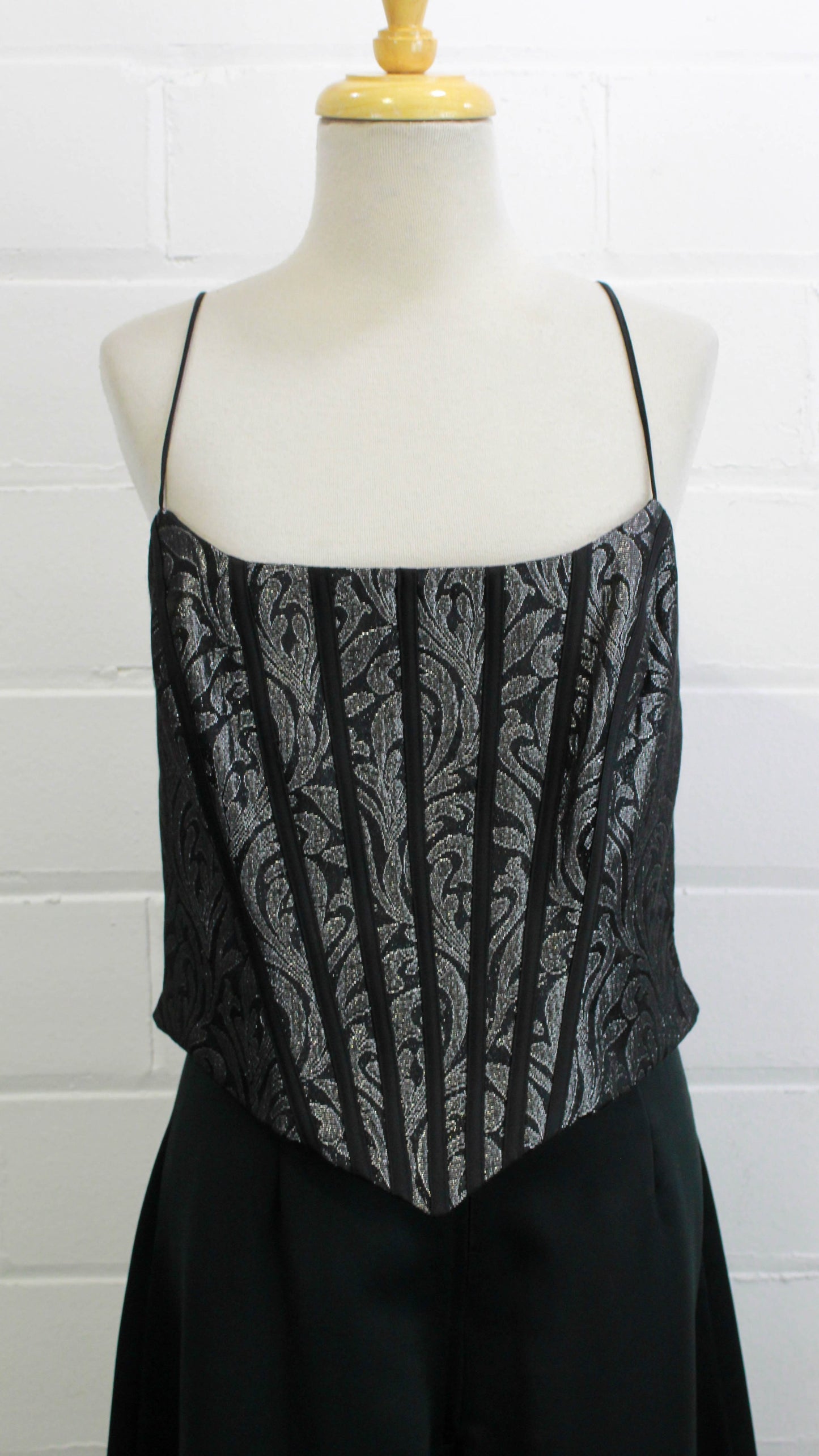 Sultry metallic boned bodice made from a silver and black damask style print. The bone casings are contrasted in black, and it zips up at centre back. It has thin spaghetti straps and is fully lined. Perfect for wearing on its own, or overtop of slip dresses and blouses.